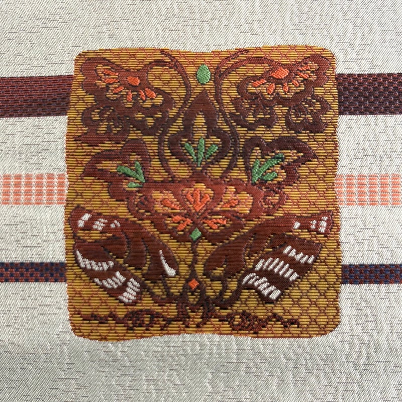 セミフォーマルでお使いいただける名古屋帯でございます。 見る人に重たい印象を感じさせない女性ならではの、気品豊かな一品です。 締め跡がございます。 お太鼓垂先間所々にシミ、垂先と前柄付近にシワがございます。 リユース品としては良い状態で、まだまだご活用頂けると思われます。 ※なお、厳しく商品の状態確認を行っておりますが、記載の汚れ以外にも見落とし箇所がある可能性がある旨ご了承いただけますと幸いです。 沢山の商品の中からご覧いただき誠にありがとうございます。