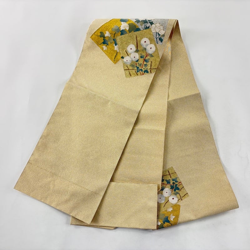 セミフォーマルでお使いいただける名古屋帯でございます。 見る人に重たい印象を感じさせない女性ならではの、気品豊かな一品です。 前柄お太鼓間にシミがございます。 リユース品としては目立った染み傷なく、状態の良いお品でございます。 ※なお、厳しく商品の状態確認を行っておりますが、記載の汚れ以外にも見落とし箇所がある可能性がある旨ご了承いただけますと幸いです。 沢山の商品の中からご覧いただき誠にありがとうございます。 【PR2】