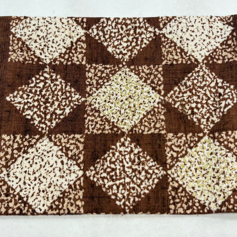 普段使いでお使いいただける名古屋帯でございます。 カジュアルな装いに合わせてお使いください。 締め跡がございます。 表地所々に薄ヤケ、お太鼓垂先間にシワがございます。 リユース品としては良い状態で、まだまだご活用頂けると思われます。 ※なお、厳しく商品の状態確認を行っておりますが、記載の汚れ以外にも見落とし箇所がある可能性がある旨ご了承いただけますと幸いです。 沢山の商品の中からご覧いただき誠にありがとうございます。