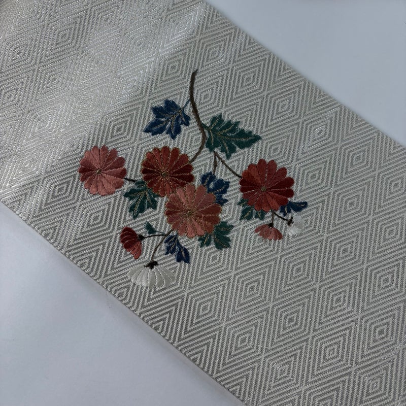 セミフォーマルでお使いいただける名古屋帯でございます。 見る人に重たい印象を感じさせない女性ならではの、気品豊かな一品です。 締め跡がございます。 垂先とお太鼓と手先前柄間にシミがございます。 リユース品としては良い状態で、まだまだご活用頂けると思われます。 ※なお、厳しく商品の状態確認を行っておりますが、記載の汚れ以外にも見落とし箇所がある可能性がある旨ご了承いただけますと幸いです。 沢山の商品の中からご覧いただき誠にありがとうございます。