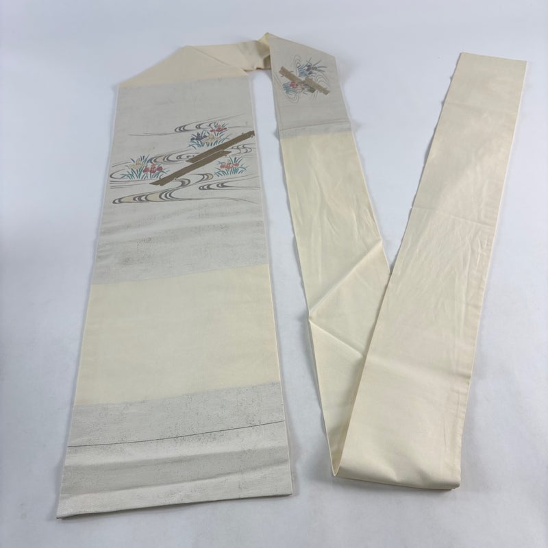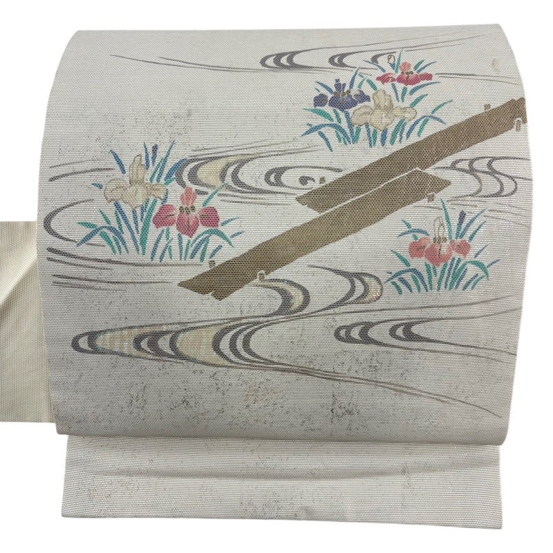 夏帯でございます。 セミフォーマルでお使いいただける名古屋帯でございます。 見る人に重たい印象を感じさせない女性ならではの、気品豊かな一品です。 締め跡がございます。 前柄に線シミ、お太鼓所々と手先前柄間にシミ、垂境と手先前柄間と前柄垂境間など表地所々にシワ、お太鼓所々と前柄所々に金銀彩の変色がございます。 リユース品としては良い状態で、まだまだご活用頂けると思われます。 ※なお、厳しく商品の状態確認を行っておりますが、記載の汚れ以外にも見落とし箇所がある可能性がある旨ご了承いただけますと幸いです。 沢山の商品の中からご覧いただき誠にありがとうございます。