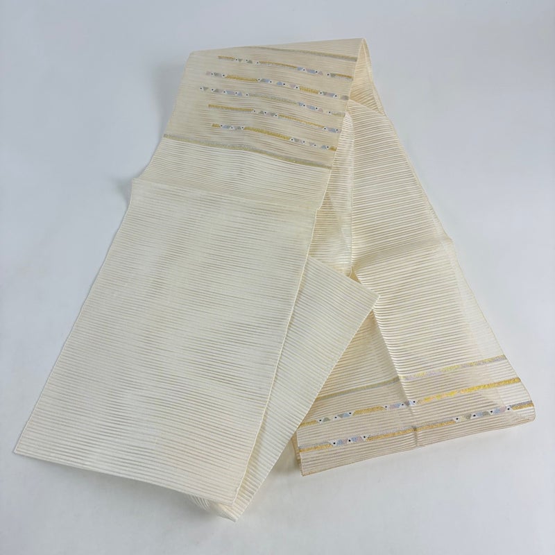 夏帯でございます。 セミフォーマルでお使いいただける名古屋帯でございます。 見る人に重たい印象を感じさせない女性ならではの、気品豊かな一品です。 表地所々にシミ、前柄お太鼓間所々にシワがございます。 リユース品としては良い状態で、まだまだご活用頂けると思われます。 ※なお、厳しく商品の状態確認を行っておりますが、記載の汚れ以外にも見落とし箇所がある可能性がある旨ご了承いただけますと幸いです。 沢山の商品の中からご覧いただき誠にありがとうございます。