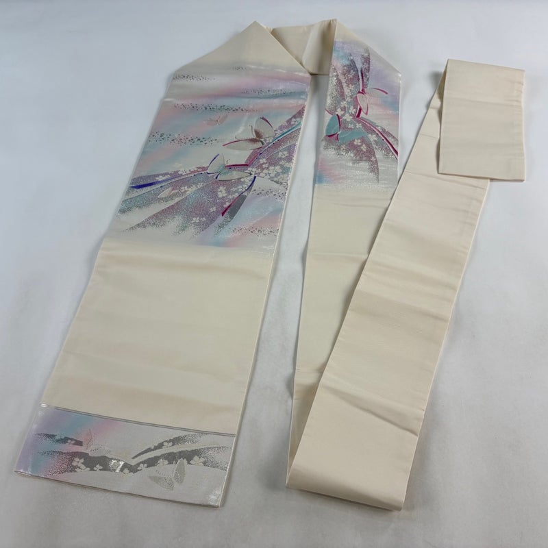 セミフォーマルでお使いいただける名古屋帯でございます。 見る人に重たい印象を感じさせない女性ならではの、気品豊かな一品です。 手先前柄間所々に薄いシミ、お太鼓垂先間所々に点シミがございます。 裏地所々に薄いシミがございます。 リユース品としては目立った染み傷なく、状態の良いお品でございます。 ※なお、厳しく商品の状態確認を行っておりますが、記載の汚れ以外にも見落とし箇所がある可能性がある旨ご了承いただけますと幸いです。 沢山の商品の中からご覧いただき誠にありがとうございます。