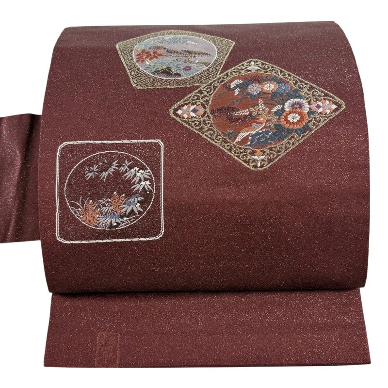 セミフォーマルでお使いいただける名古屋帯でございます。 見る人に重たい印象を感じさせない女性ならではの、気品豊かな一品です。 締め跡がございます。 リユース品としては目立った染み傷なく、状態の良いお品でございます。 ※なお、厳しく商品の状態確認を行っておりますが、記載の汚れ以外にも見落とし箇所がある可能性がある旨ご了承いただけますと幸いです。 沢山の商品の中からご覧いただき誠にありがとうございます。