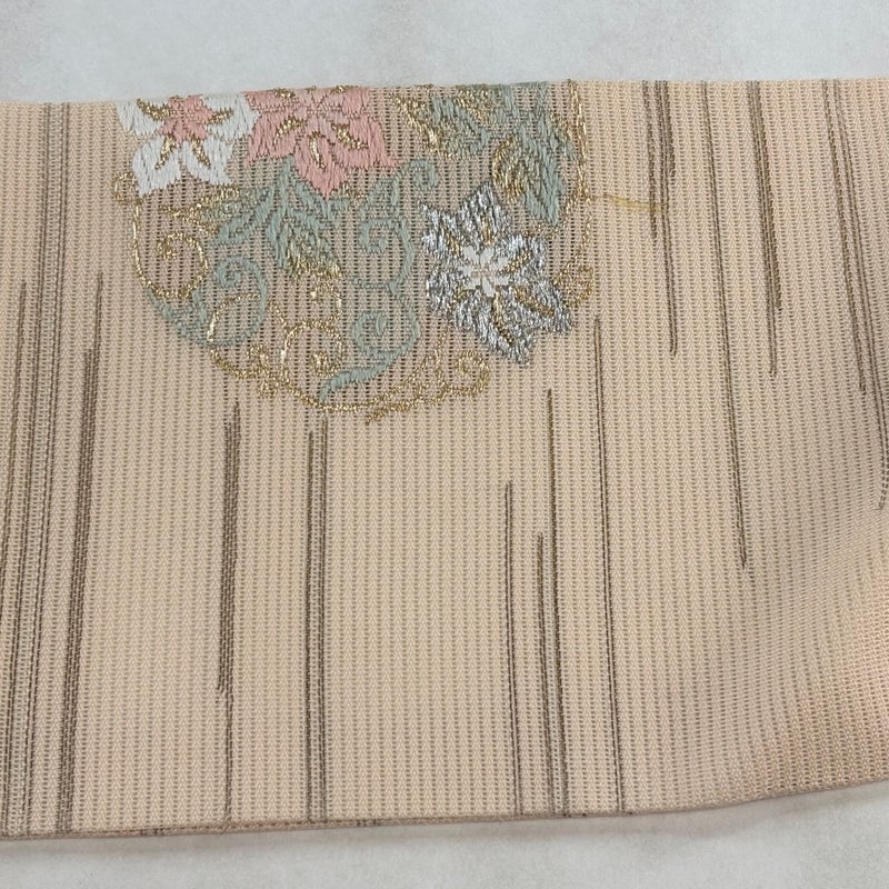 夏帯でございます。 セミフォーマルでお使いいただける名古屋帯でございます。 見る人に重たい印象を感じさせない女性ならではの、気品豊かな一品です。 締め跡がございます。 お太鼓垂先間と手先前柄間にシミ、前柄所々と前柄垂境間に糸のほつれ、表地所々に箔の変色がございます。 裏地所々にシミがございます。 リユース品としては良い状態で、まだまだご活用頂けると思われます。 ※なお、厳しく商品の状態確認を行っておりますが、記載の汚れ以外にも見落とし箇所がある可能性がある旨ご了承いただけますと幸いです。 沢山の商品の中からご覧いただき誠にありがとうございます。