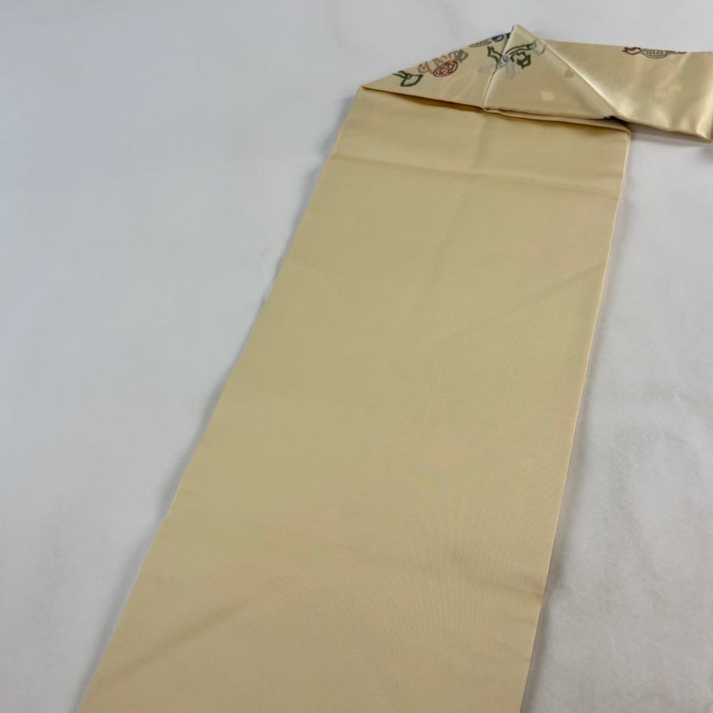 セミフォーマルでお使いいただける名古屋帯でございます。 見る人に重たい印象を感じさせない女性ならではの、気品豊かな一品です。 お太鼓垂先間にシミがございます。 裏地にシミ、裏地の垂先に薄汚れがございます。 リユース品としては目立った染み傷なく、状態の良いお品でございます。 ※なお、厳しく商品の状態確認を行っておりますが、記載の汚れ以外にも見落とし箇所がある可能性がある旨ご了承いただけますと幸いです。 沢山の商品の中からご覧いただき誠にありがとうございます。 【PR2】