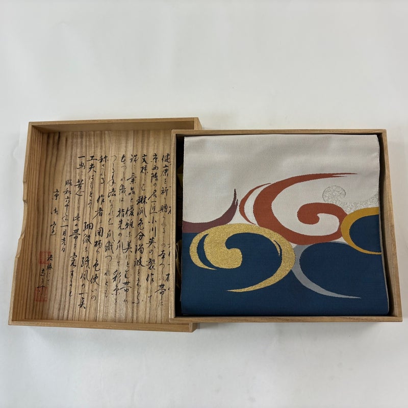 セミフォーマルでお使いいただける名古屋帯でございます。 見る人に重たい印象を感じさせない女性ならではの、気品豊かな一品です。 締め跡がございます。 表地所々にヤケ、締め跡沿いに汚れ、表地全体に薄汚れがございます。 裏地全体に薄汚れがございます。 ご購入の際はその点ご留意ください。 ※なお、厳しく商品の状態確認を行っておりますが、記載の汚れ以外にも見落とし箇所がある可能性がある旨ご了承いただけますと幸いです。 沢山の商品の中からご覧いただき誠にありがとうございます。 ※共箱の裏面に為書きがございます。 【PR2】