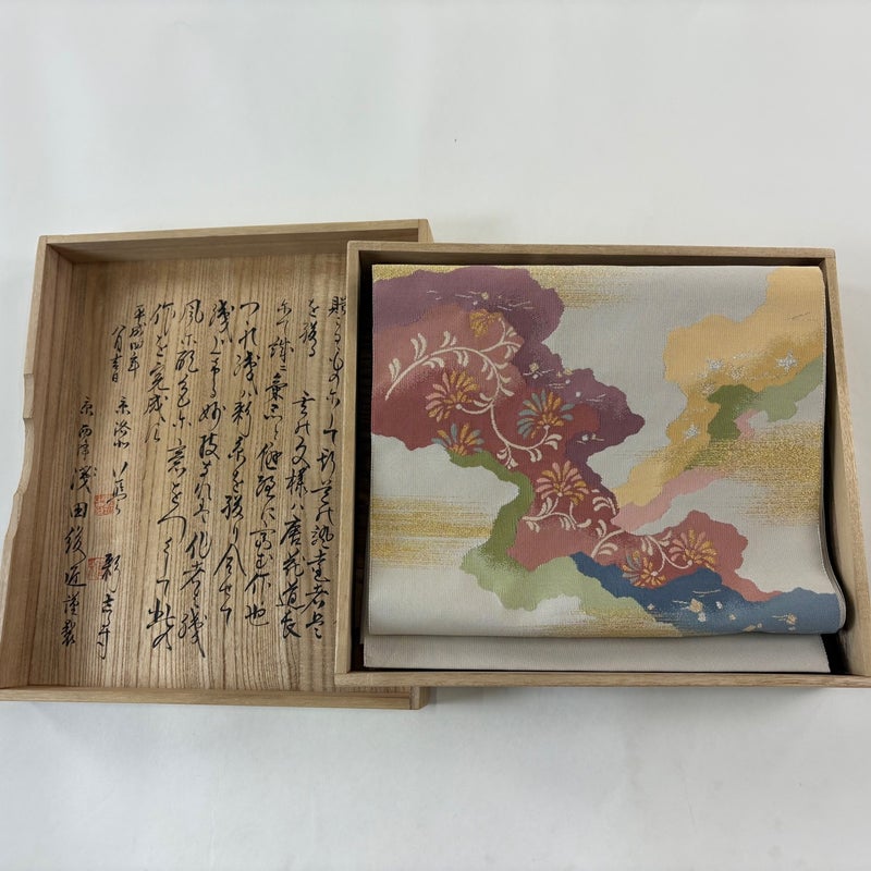 セミフォーマルでお使いいただける名古屋帯でございます。 見る人に重たい印象を感じさせない女性ならではの、気品豊かな一品です。 お太鼓に小さなシミがございます。 リユース品としては良い状態で、まだまだご活用頂けると思われます。 ※なお、厳しく商品の状態確認を行っておりますが、記載の汚れ以外にも見落とし箇所がある可能性がある旨ご了承いただけますと幸いです。 沢山の商品の中からご覧いただき誠にありがとうございます。 ※共箱の裏面に為書きがございます。 【PR2】
