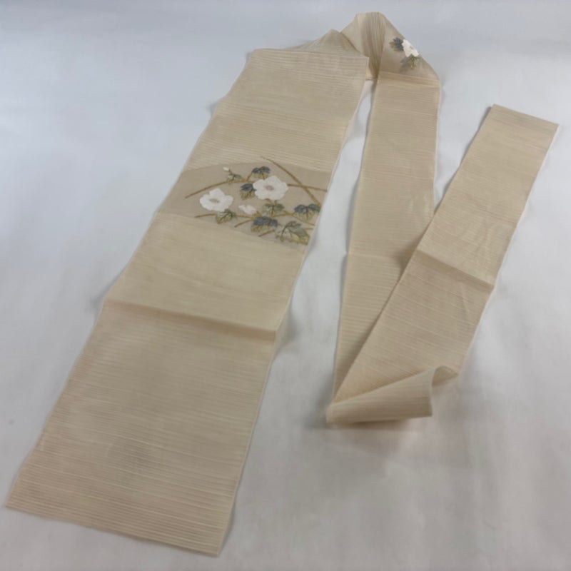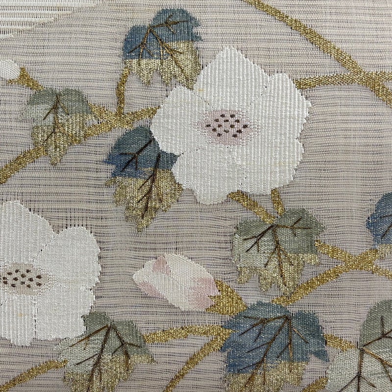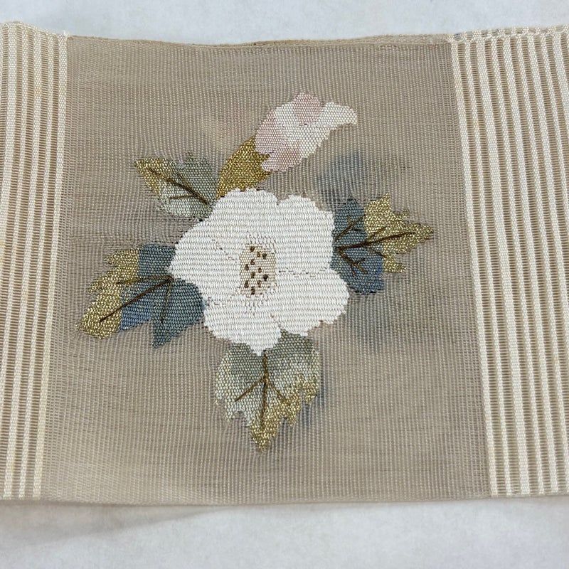 夏帯でございます。 セミフォーマルでお使いいただける名古屋帯でございます。 見る人に重たい印象を感じさせない女性ならではの、気品豊かな一品です。 締め跡がございます。 お太鼓に薄ヤケ、垂境にシワ、お太鼓に糸ゆるみがございます。 ※手先から垂境にかけて一部開いております。 リユース品としては良い状態で、まだまだご活用頂けると思われます。 ※なお、厳しく商品の状態確認を行っておりますが、記載の汚れ以外にも見落とし箇所がある可能性がある旨ご了承いただけますと幸いです。 沢山の商品の中からご覧いただき誠にありがとうございます。