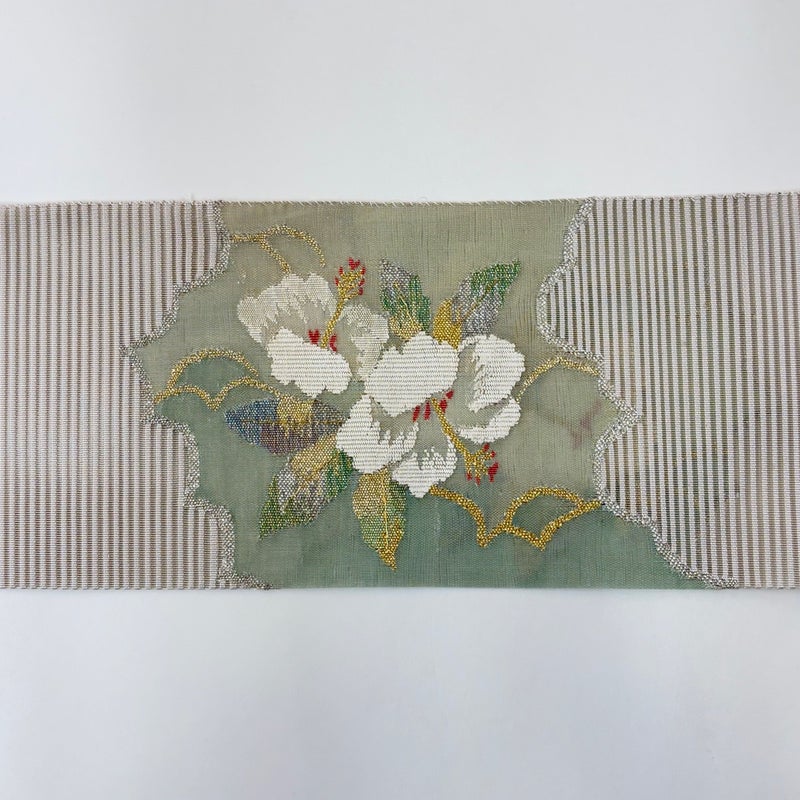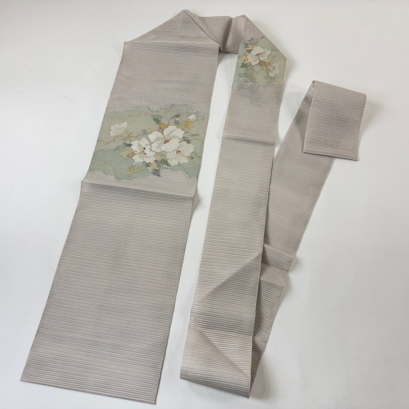 セミフォーマルでお使いいただける夏帯の名古屋帯でございます。 見る人に重たい印象を感じさせない女性ならではの、気品豊かな一品です。 リユース品としては目立った染み傷なく、状態の良いお品でございます。 ※なお、厳しく商品の状態確認を行っておりますが、記載の汚れ以外にも見落とし箇所がある可能性がある旨ご了承いただけますと幸いです。 沢山の商品の中からご覧いただき誠にありがとうございます。
