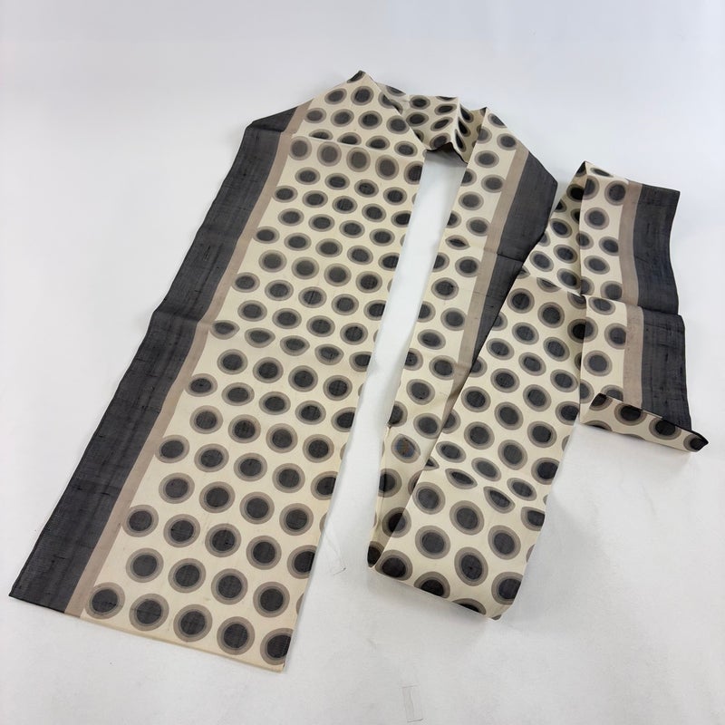 夏帯でございます。 京の名工で染色作家「川村久太郎」の作品でございます。 普段使いでお使いいただける名古屋帯でございます。 カジュアルな装いに合わせてお使いください。 締め跡がございます。 垂先所々にシミ、表地所々に薄いシミ、垂境部分にシワや帯芯のヨレ、お太鼓に染めむらがございます。 裏地所々に薄いシミがございます。 リユース品としては良い状態で、まだまだご活用頂けると思われます。 ※なお、厳しく商品の状態確認を行っておりますが、記載の汚れ以外にも見落とし箇所がある可能性がある旨ご了承いただけますと幸いです。 沢山の商品の中からご覧いただき誠にありがとうございます。