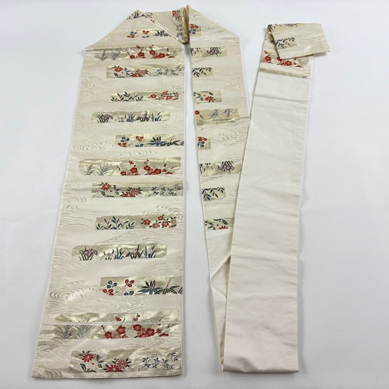 セミフォーマルでお使いいただける名古屋帯でございます。 見る人に重たい印象を感じさせない女性ならではの、気品豊かな一品です。 締め跡がございます。 手先に小さなシミ、お太鼓など表地所々にシワがございます。 リユース品としては良い状態で、まだまだご活用頂けると思われます。 ※なお、厳しく商品の状態確認を行っておりますが、記載の汚れ以外にも見落とし箇所がある可能性がある旨ご了承いただけますと幸いです。 沢山の商品の中からご覧いただき誠にありがとうございます。