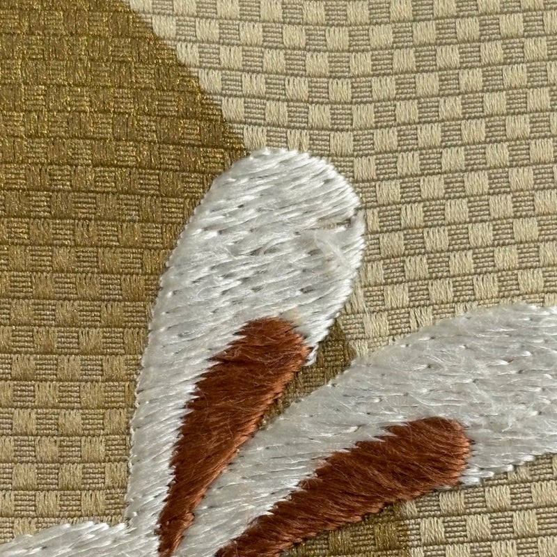 セミフォーマルでお使いいただける名古屋帯でございます。 見る人に重たい印象を感じさせない女性ならではの、気品豊かな一品です。 締め跡がございます。 お太鼓垂先間にシミ、お太鼓付近にシワ、お太鼓に糸のほつれ、お太鼓に若干金彩の変色がございます。 リユース品としては良い状態で、まだまだご活用頂けると思われます。 ※なお、厳しく商品の状態確認を行っておりますが、記載の汚れ以外にも見落とし箇所がある可能性がある旨ご了承いただけますと幸いです。 沢山の商品の中からご覧いただき誠にありがとうございます。