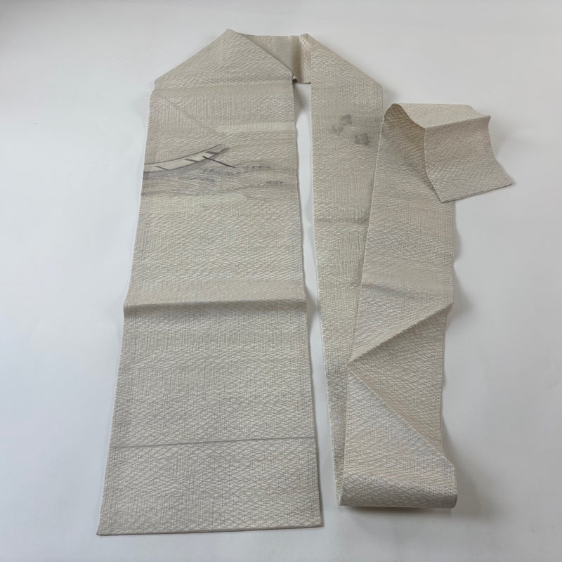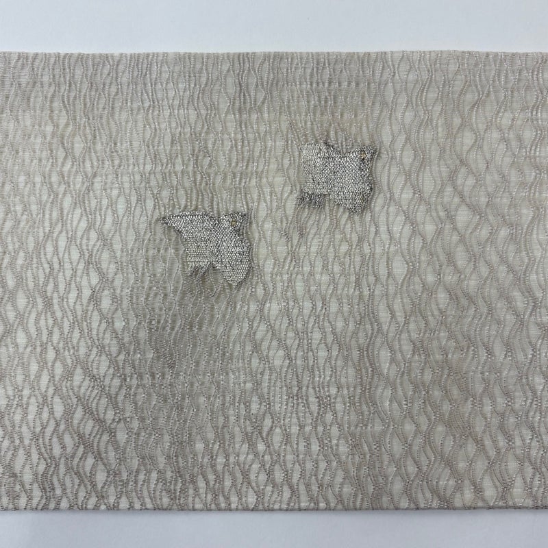夏帯でございます。 セミフォーマルでお使いいただける名古屋帯でございます。 見る人に重たい印象を感じさせない女性ならではの、気品豊かな一品です。 締め跡がございます。 手先前柄間など表地所々にシミ、前柄付近に小さなシミ、お太鼓所々と前柄所々に銀糸の変色がございます。 リユース品としては良い状態で、まだまだご活用頂けると思われます。 ※なお、厳しく商品の状態確認を行っておりますが、記載の汚れ以外にも見落とし箇所がある可能性がある旨ご了承いただけますと幸いです。 沢山の商品の中からご覧いただき誠にありがとうございます。