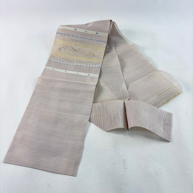 夏帯でございます。 セミフォーマルでお使いいただける名古屋帯でございます。 見る人に重たい印象を感じさせない女性ならではの、気品豊かな一品です。 締め跡がございます。 前柄付近にシワがございます。 裏地にシミがございます。 リユース品としては良い状態で、まだまだご活用頂けると思われます。 ※なお、厳しく商品の状態確認を行っておりますが、記載の汚れ以外にも見落とし箇所がある可能性がある旨ご了承いただけますと幸いです。 沢山の商品の中からご覧いただき誠にありがとうございます。