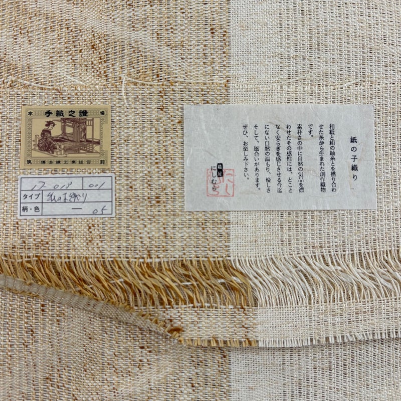 【着物ランク】秀品 【素材】正絹、和紙 【帯丈】約374cm 【帯幅】約31.5cm 【帯仕立て】仕立て上がり 【状態ランク】ランクB 【帯着用シーン】普段使いの洒落帯(紬・小紋)