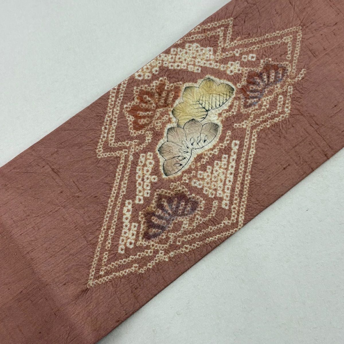 帯の格は着物とは逆で染よりも織のほうが格式が高く、名古屋帯は袋帯よりも格が低く様々な技法や生地で作成されているため組み合わせ数も多く場面によって使い分けることでセミフォーマルからカジュアルまで幅広く着用する事ができる帯です。 名古屋帯の名前の由来は名古屋の女学校の先生が考案したと言われるため名古屋帯という名前で呼ばれるようになりました。 形状はお太鼓部分までは通常の帯幅ですがそれ以降は幅が半分になっていることが多く、袋帯よりも短い作りになっているため一重太鼓でしか結ぶ事ができません。