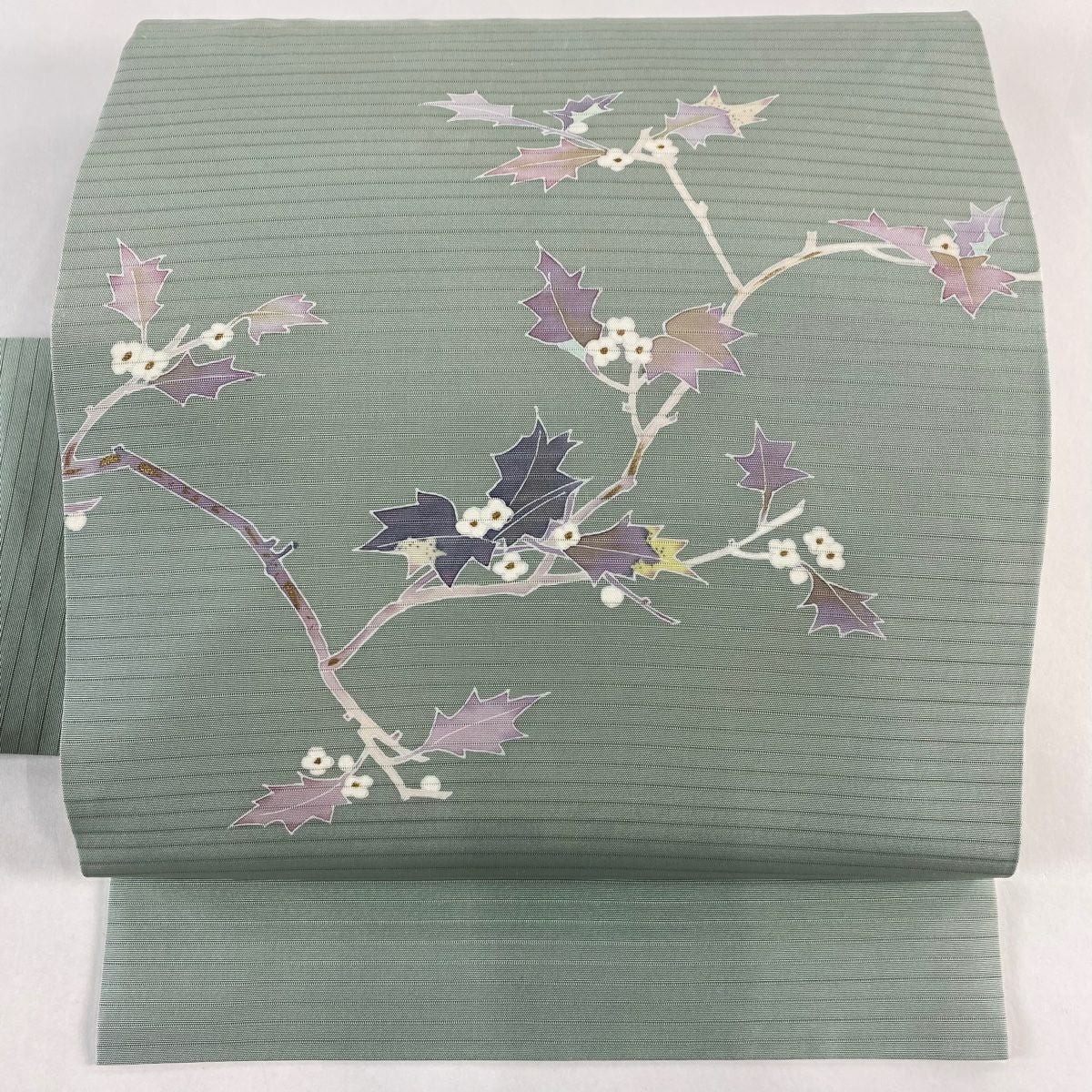 帯の格は着物とは逆で染よりも織のほうが格式が高く、名古屋帯は袋帯よりも格が低く様々な技法や生地で作成されているため組み合わせ数も多く場面によって使い分けることでセミフォーマルからカジュアルまで幅広く着用する事ができる帯です。 名古屋帯の名前の由来は名古屋の女学校の先生が考案したと言われるため名古屋帯という名前で呼ばれるようになりました。 形状はお太鼓部分までは通常の帯幅ですがそれ以降は幅が半分になっていることが多く、袋帯よりも短い作りになっているため一重太鼓でしか結ぶ事ができません。