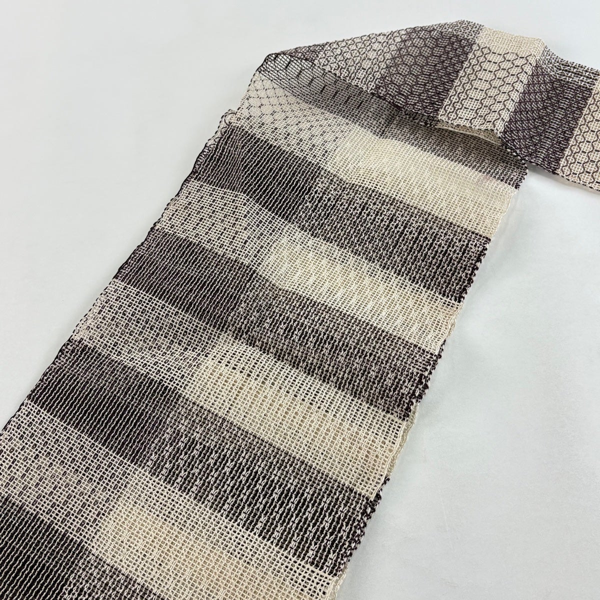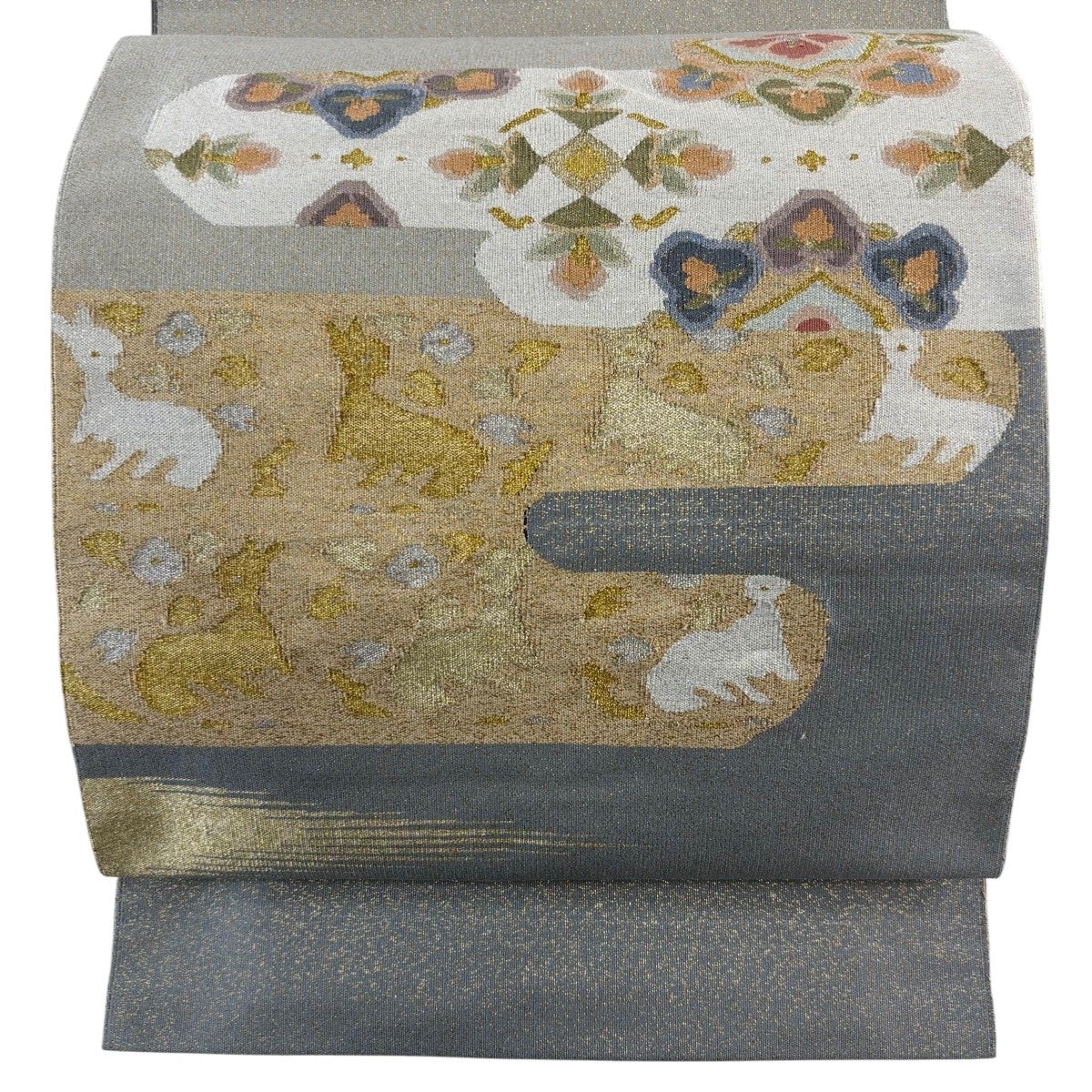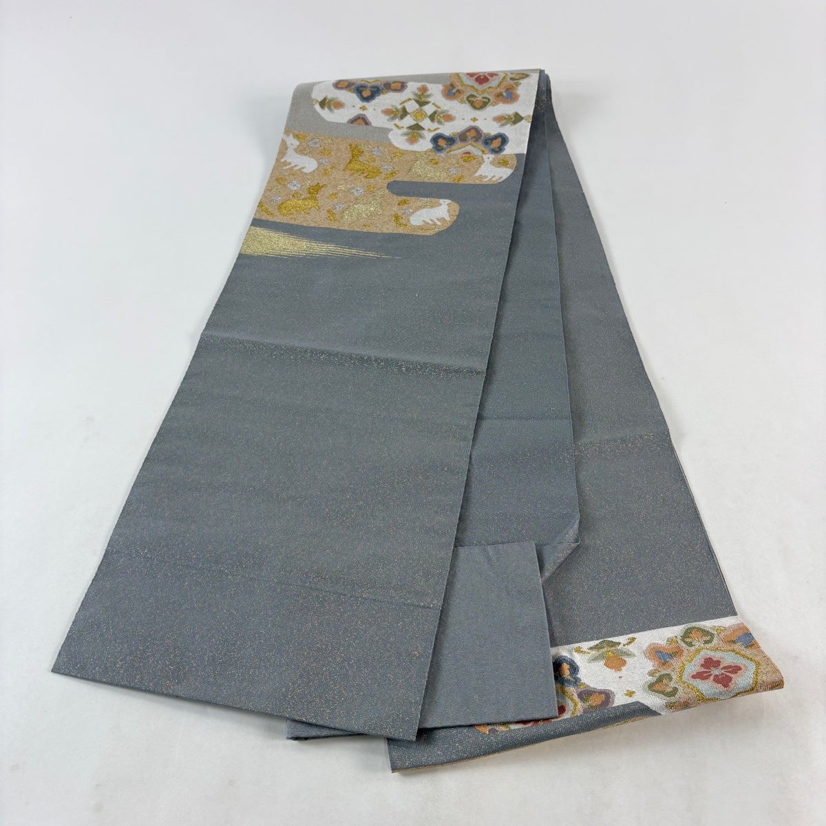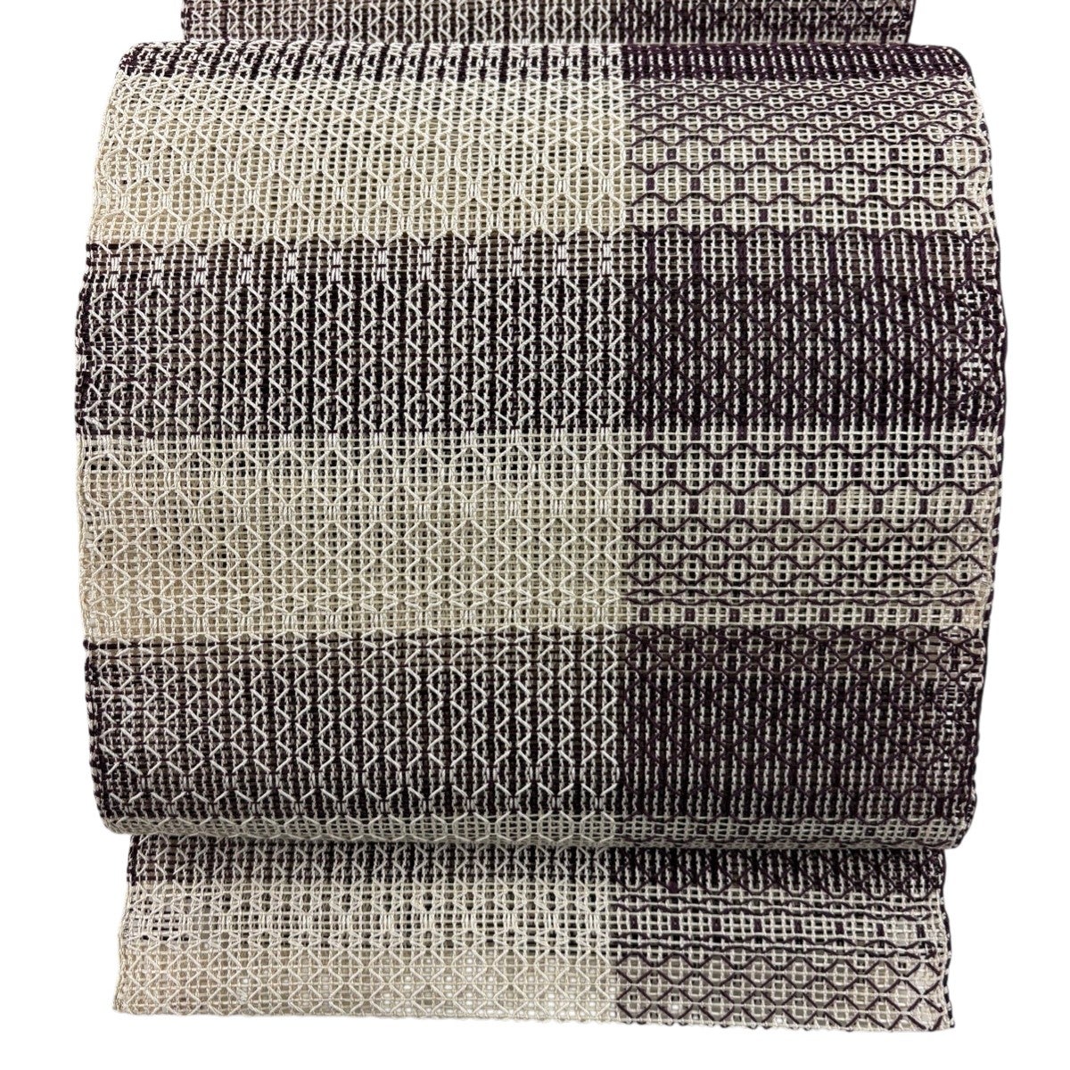 帯の格は着物とは逆で染よりも織のほうが格式が高く、名古屋帯は袋帯よりも格が低く様々な技法や生地で作成されているため組み合わせ数も多く場面によって使い分けることでセミフォーマルからカジュアルまで幅広く着用する事ができる帯です。 名古屋帯の名前の由来は名古屋の女学校の先生が考案したと言われるため名古屋帯という名前で呼ばれるようになりました。 形状はお太鼓部分までは通常の帯幅ですがそれ以降は幅が半分になっていることが多く、袋帯よりも短い作りになっているため一重太鼓でしか結ぶ事ができません。