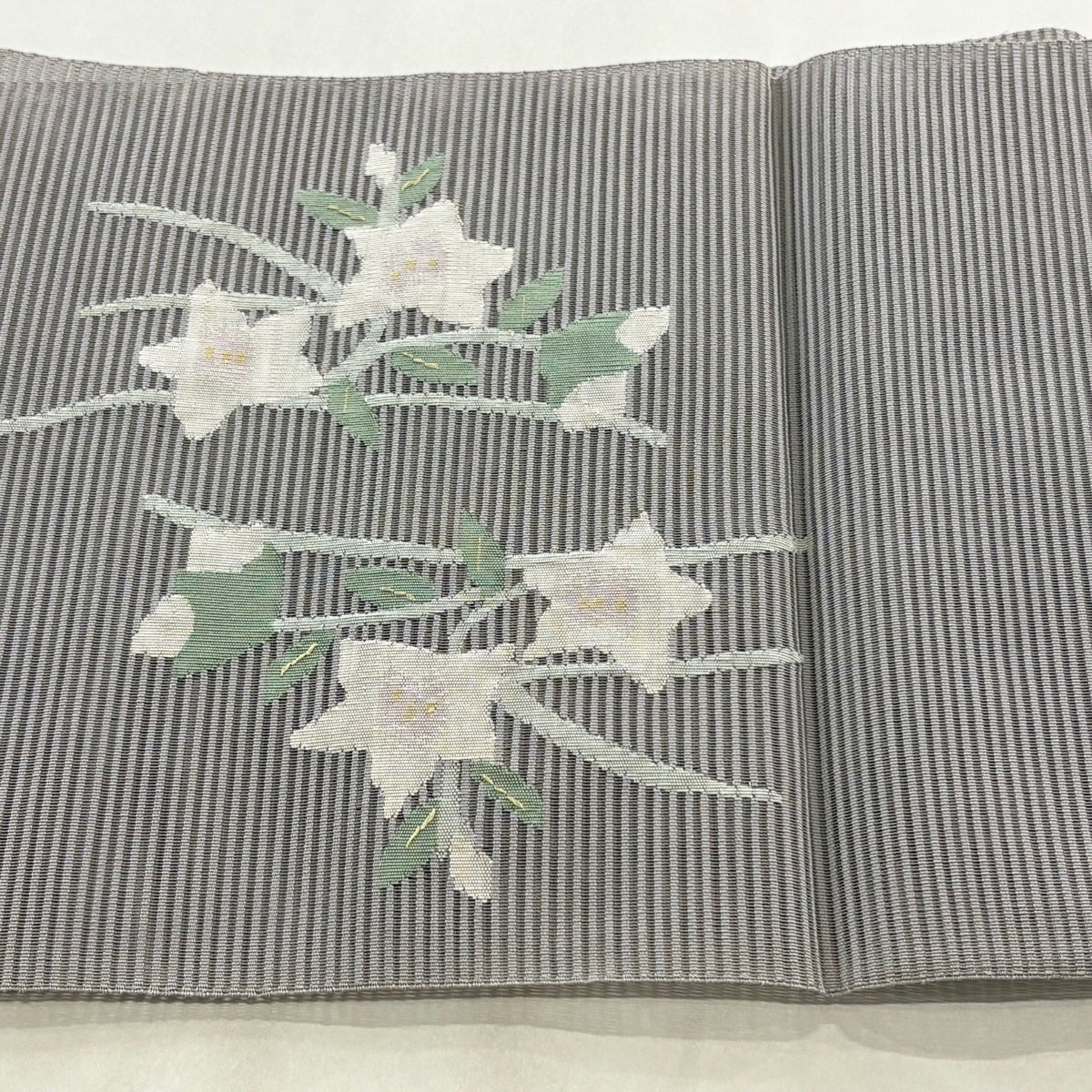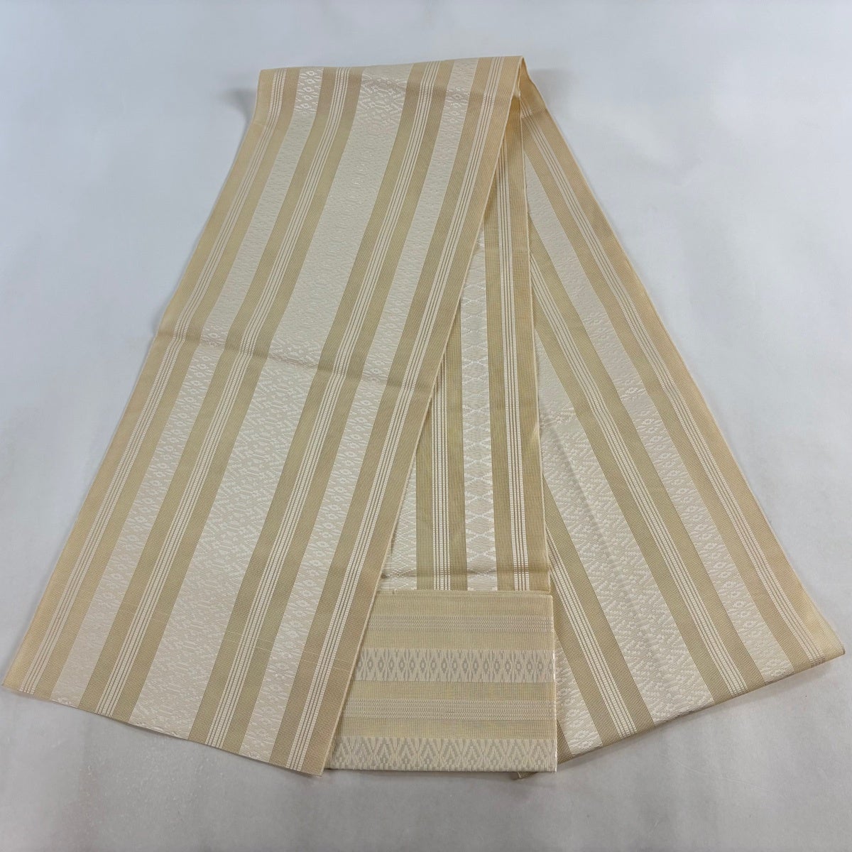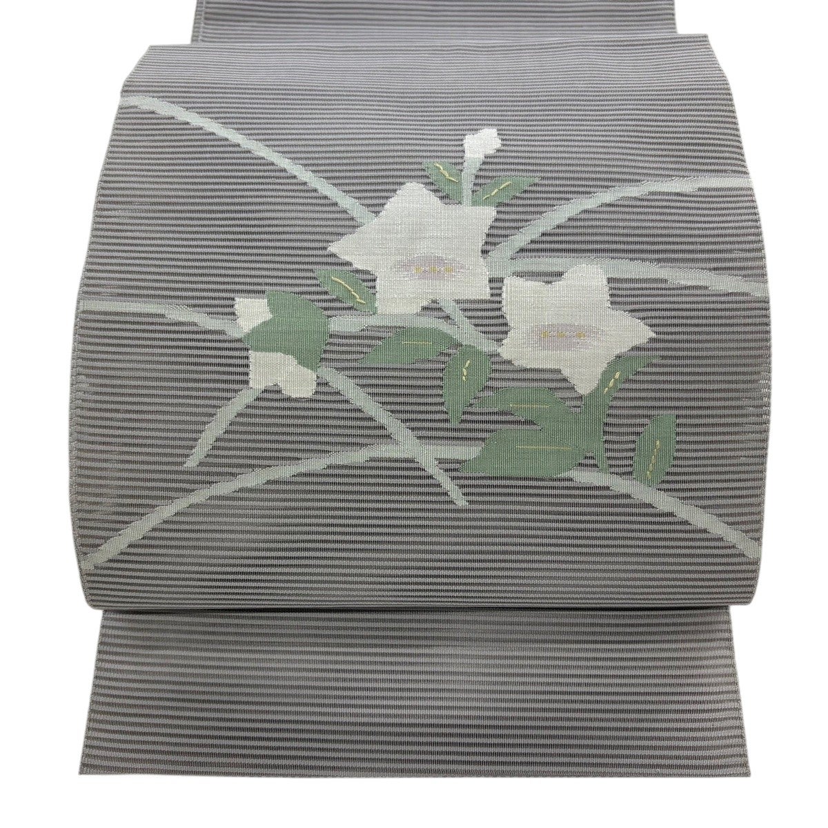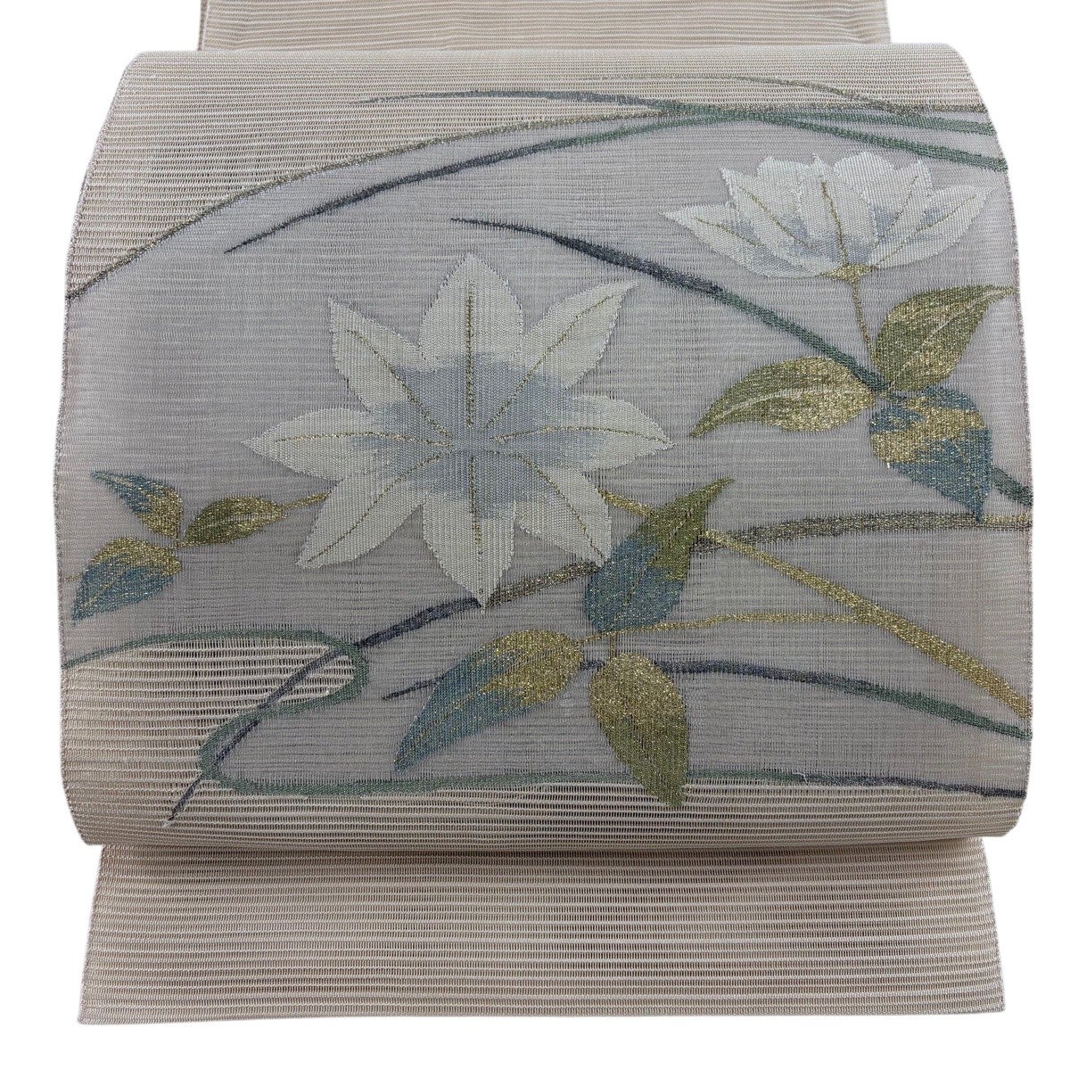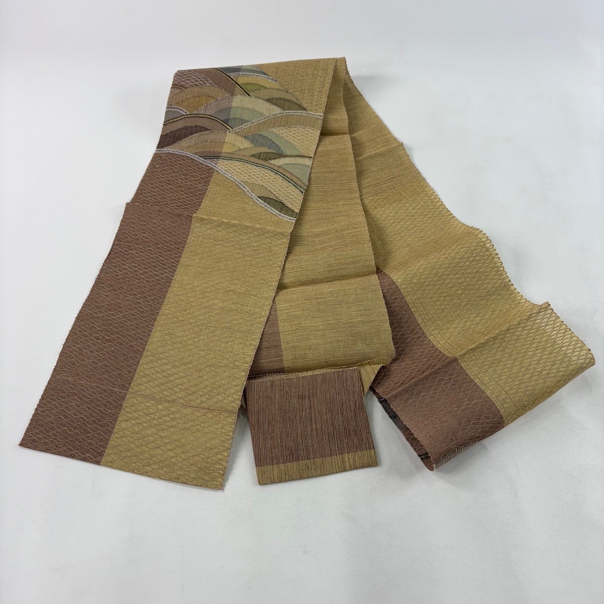 帯の格は着物とは逆で染よりも織のほうが格式が高く、名古屋帯は袋帯よりも格が低く様々な技法や生地で作成されているため組み合わせ数も多く場面によって使い分けることでセミフォーマルからカジュアルまで幅広く着用する事ができる帯です。 名古屋帯の名前の由来は名古屋の女学校の先生が考案したと言われるため名古屋帯という名前で呼ばれるようになりました。 形状はお太鼓部分までは通常の帯幅ですがそれ以降は幅が半分になっていることが多く、袋帯よりも短い作りになっているため一重太鼓でしか結ぶ事ができません。
