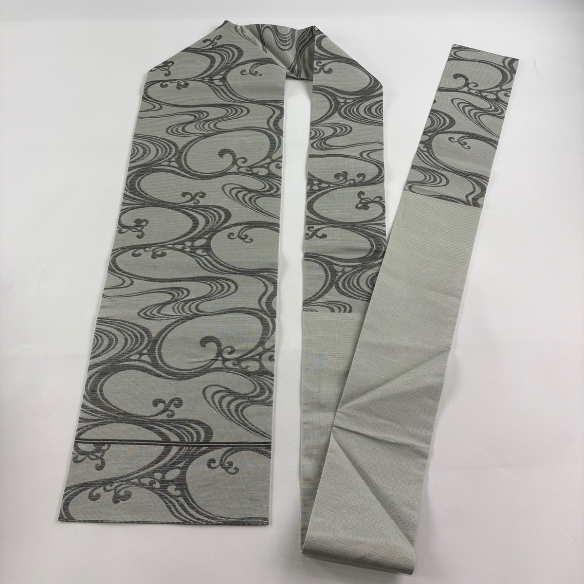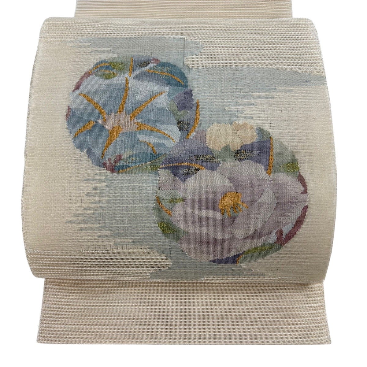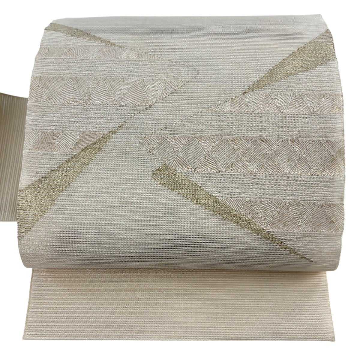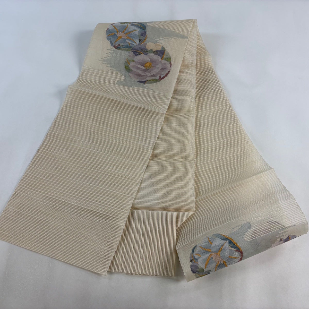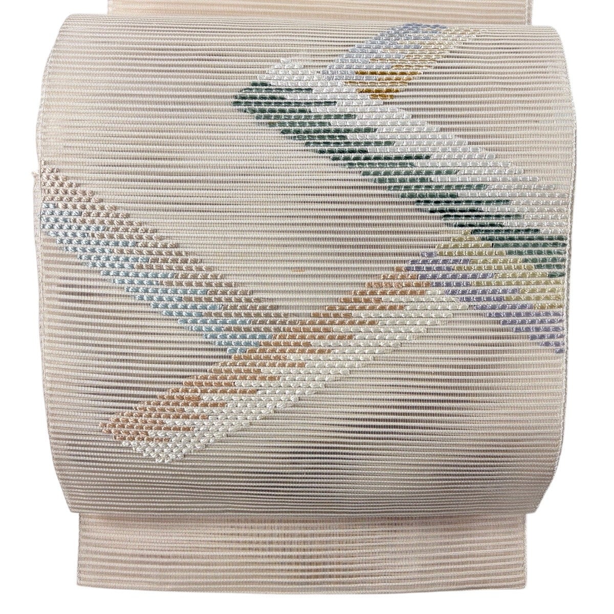 帯の格は着物とは逆で染よりも織のほうが格式が高く、名古屋帯は袋帯よりも格が低く様々な技法や生地で作成されているため組み合わせ数も多く場面によって使い分けることでセミフォーマルからカジュアルまで幅広く着用する事ができる帯です。 名古屋帯の名前の由来は名古屋の女学校の先生が考案したと言われるため名古屋帯という名前で呼ばれるようになりました。 形状はお太鼓部分までは通常の帯幅ですがそれ以降は幅が半分になっていることが多く、袋帯よりも短い作りになっているため一重太鼓でしか結ぶ事ができません。
