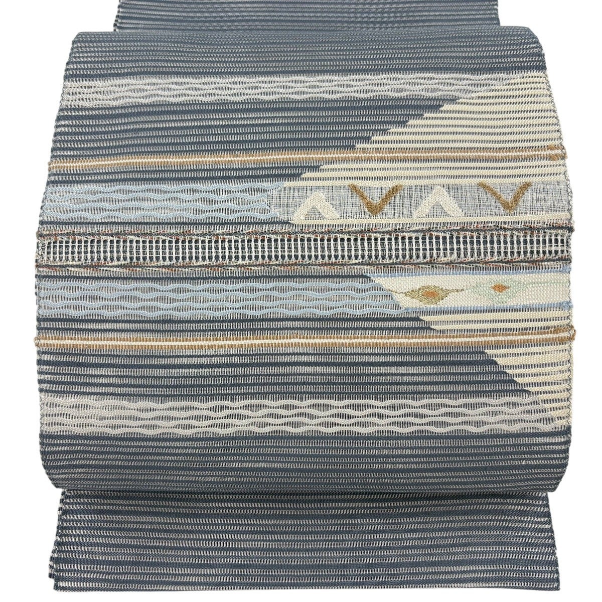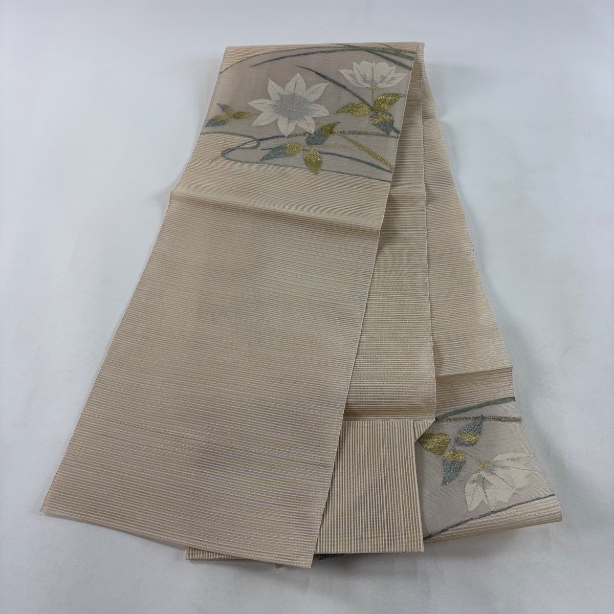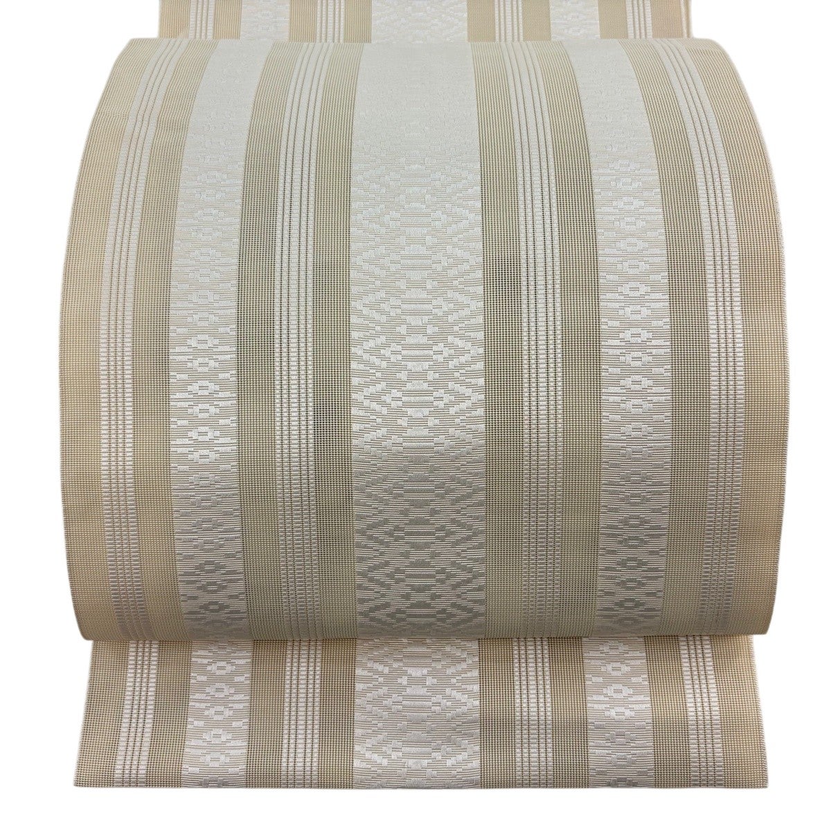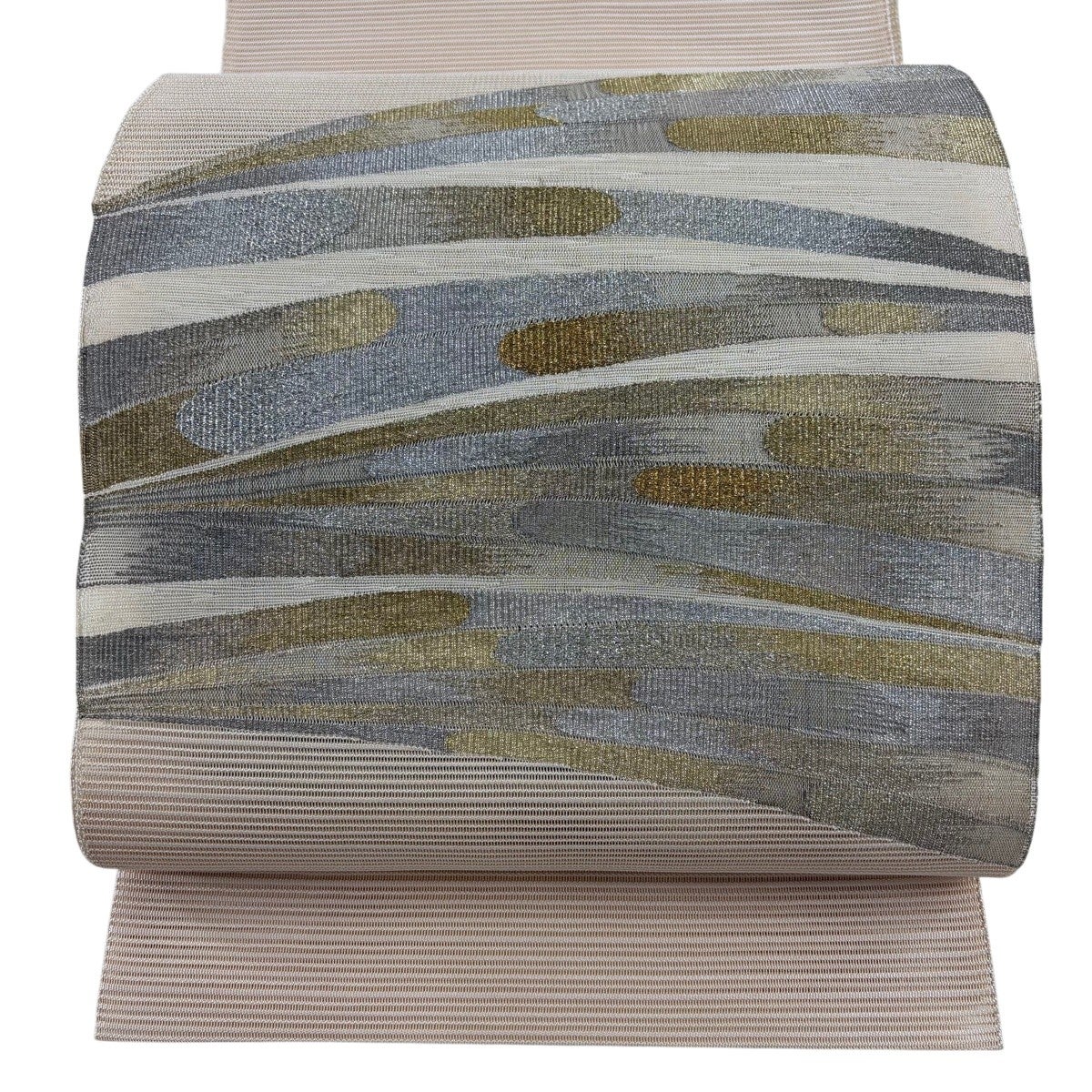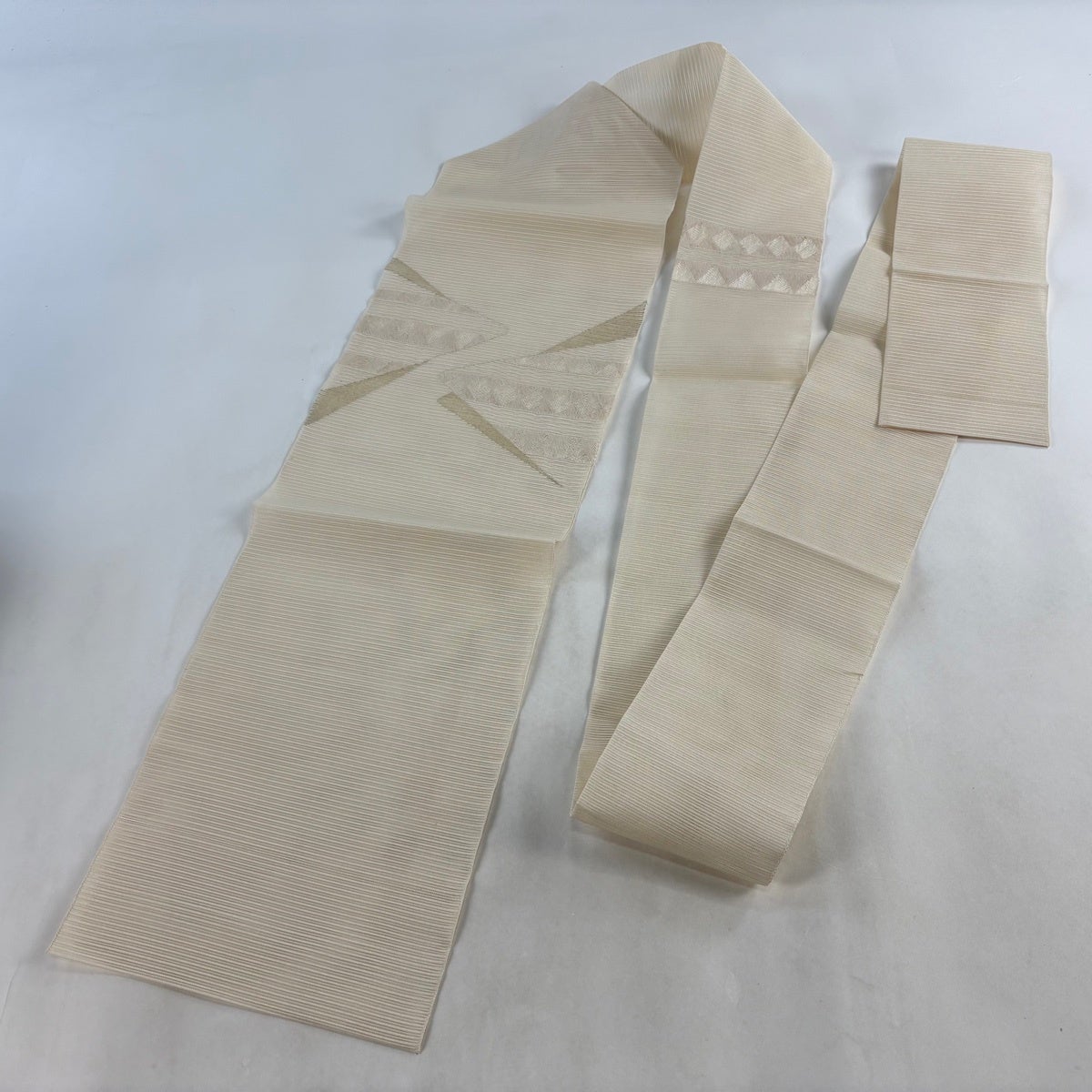 帯の格は着物とは逆で染よりも織のほうが格式が高く、名古屋帯は袋帯よりも格が低く様々な技法や生地で作成されているため組み合わせ数も多く場面によって使い分けることでセミフォーマルからカジュアルまで幅広く着用する事ができる帯です。 名古屋帯の名前の由来は名古屋の女学校の先生が考案したと言われるため名古屋帯という名前で呼ばれるようになりました。 形状はお太鼓部分までは通常の帯幅ですがそれ以降は幅が半分になっていることが多く、袋帯よりも短い作りになっているため一重太鼓でしか結ぶ事ができません。