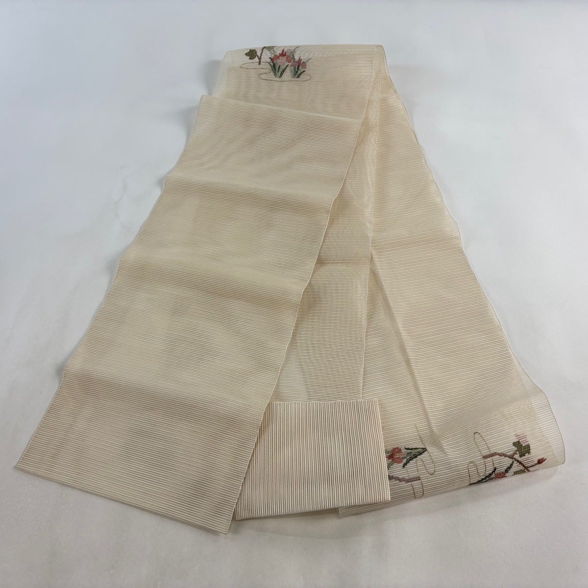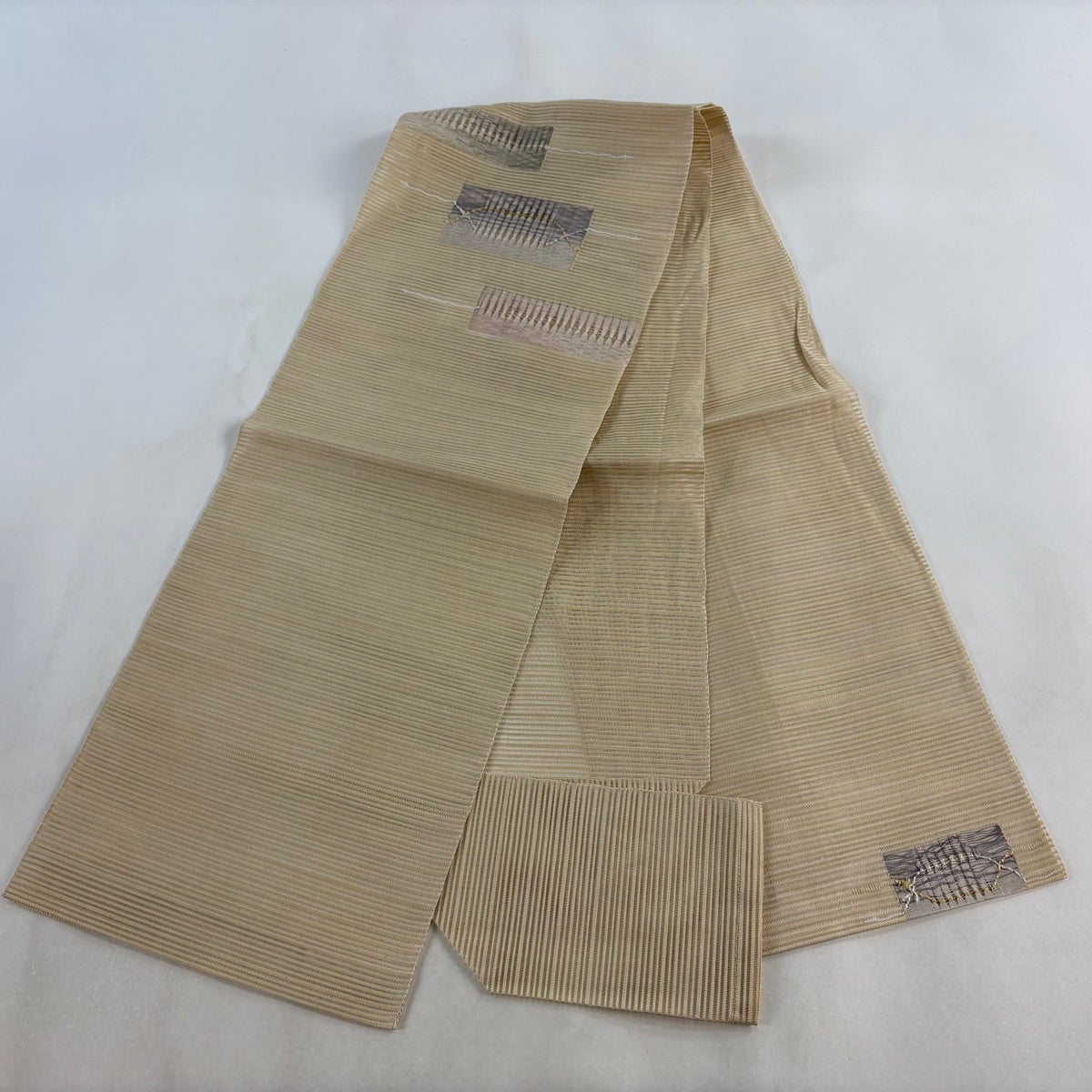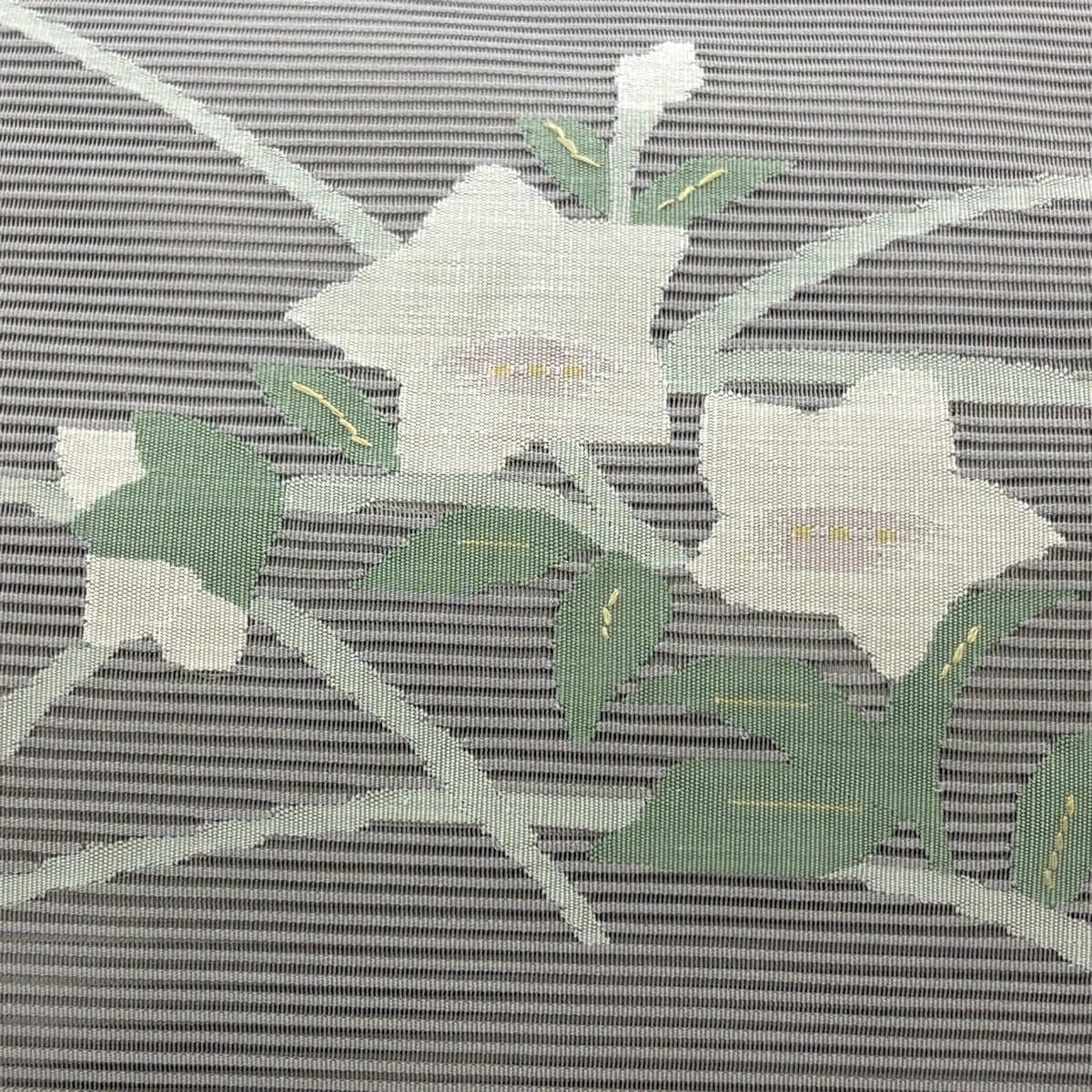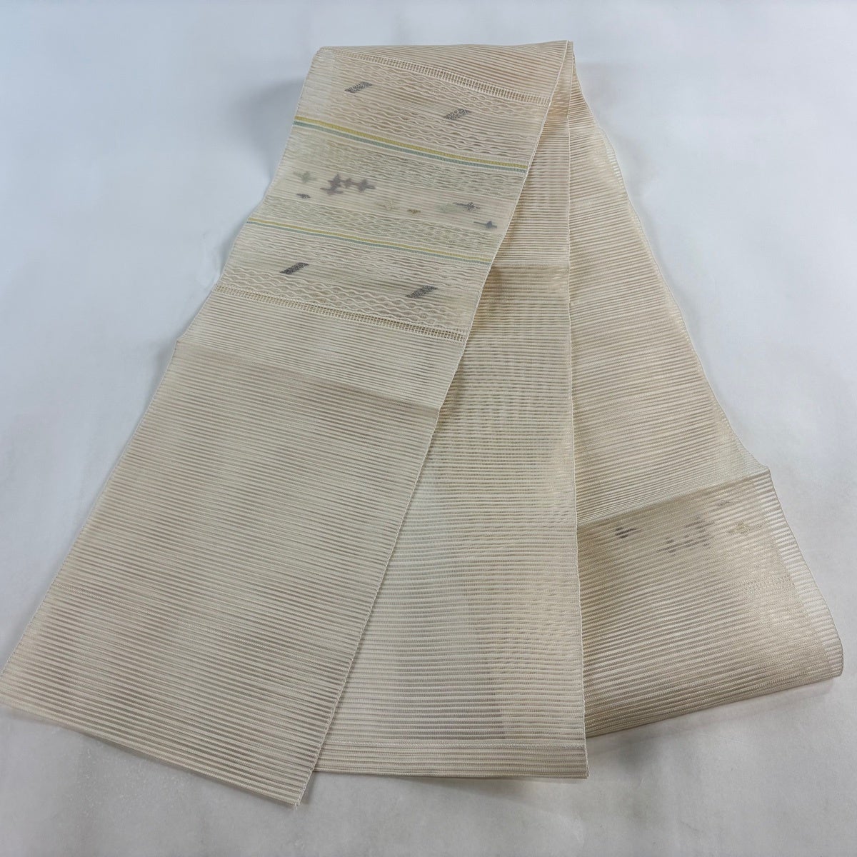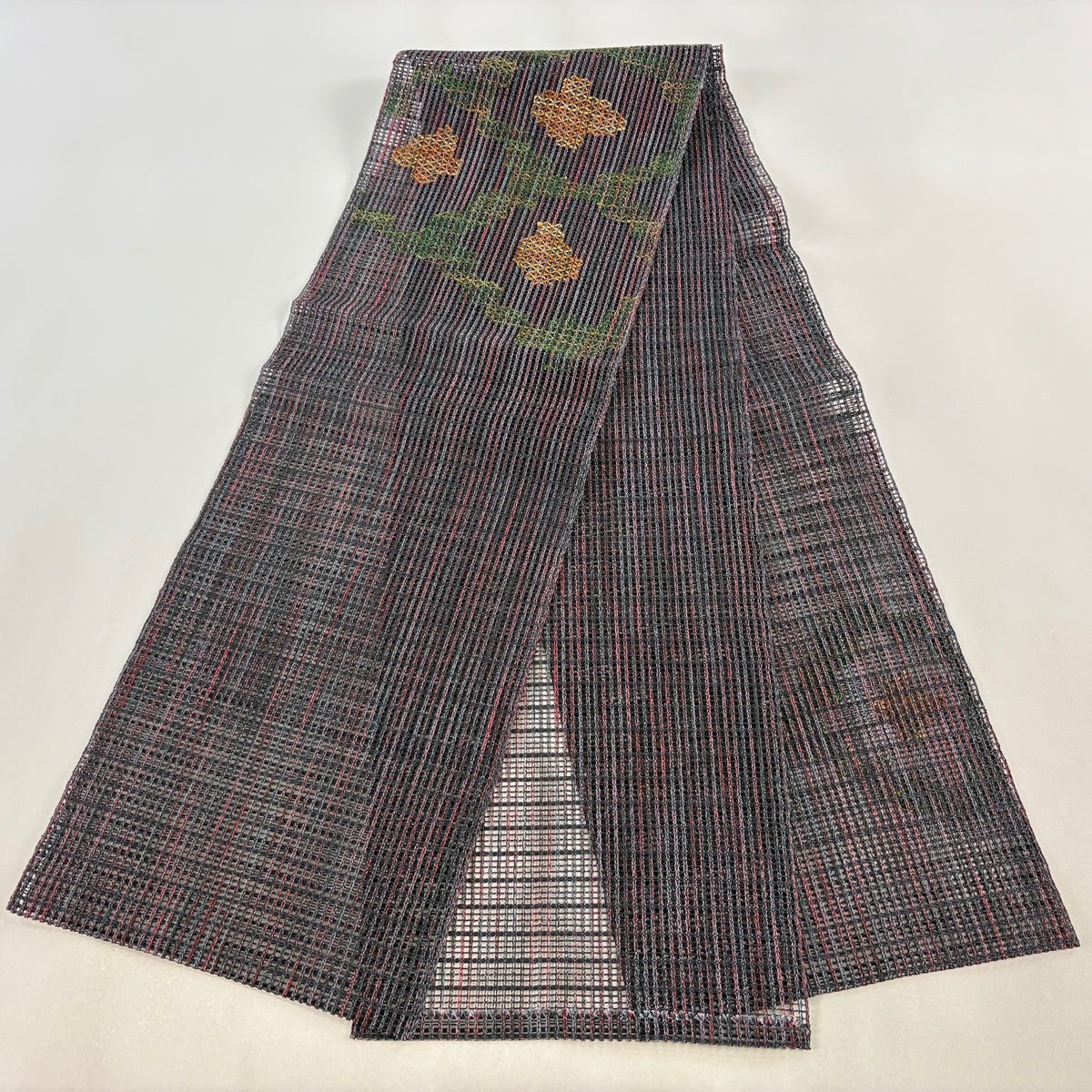 帯の格は着物とは逆で染よりも織のほうが格式が高く、名古屋帯は袋帯よりも格が低く様々な技法や生地で作成されているため組み合わせ数も多く場面によって使い分けることでセミフォーマルからカジュアルまで幅広く着用する事ができる帯です。 名古屋帯の名前の由来は名古屋の女学校の先生が考案したと言われるため名古屋帯という名前で呼ばれるようになりました。 形状はお太鼓部分までは通常の帯幅ですがそれ以降は幅が半分になっていることが多く、袋帯よりも短い作りになっているため一重太鼓でしか結ぶ事ができません。