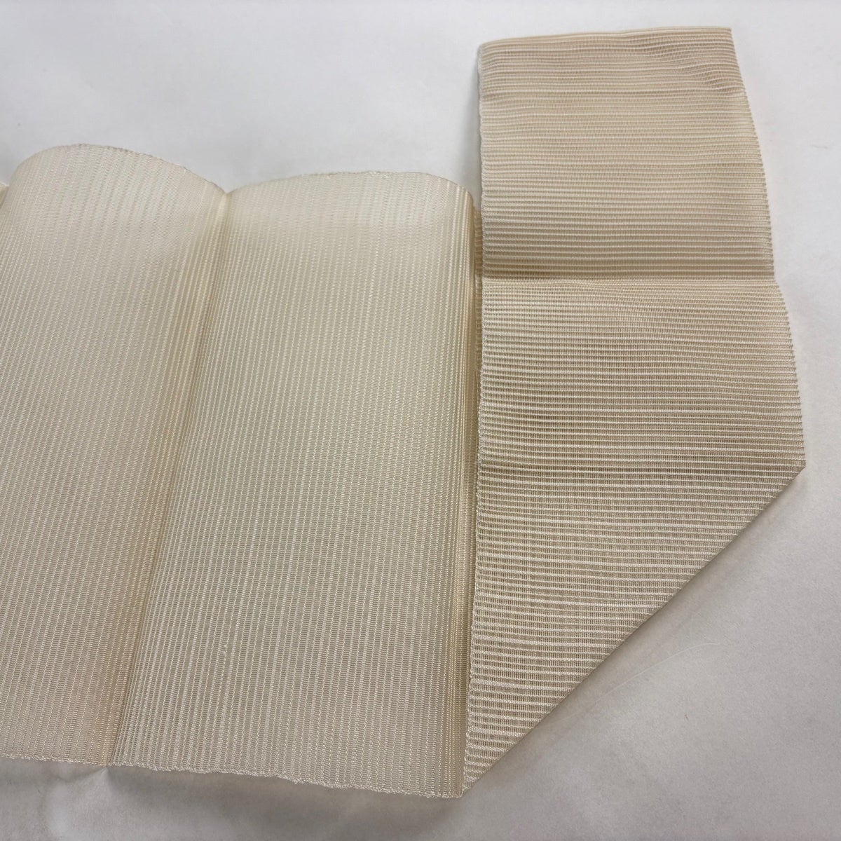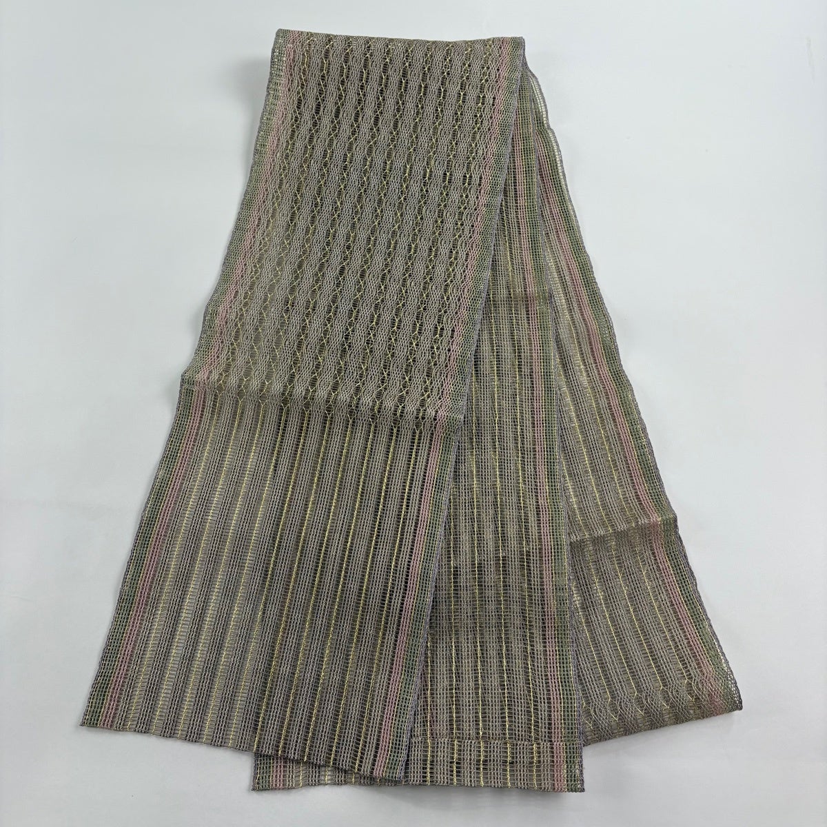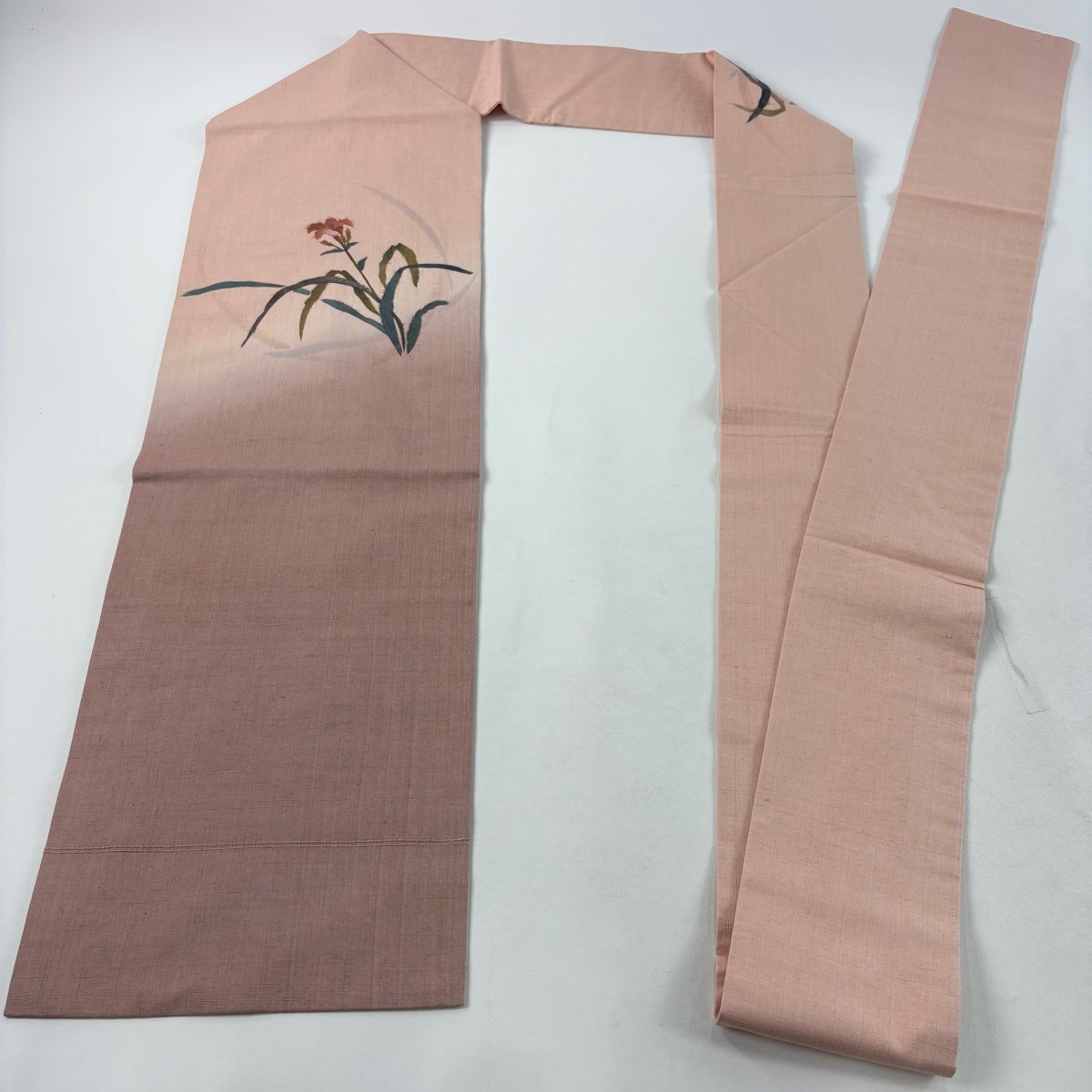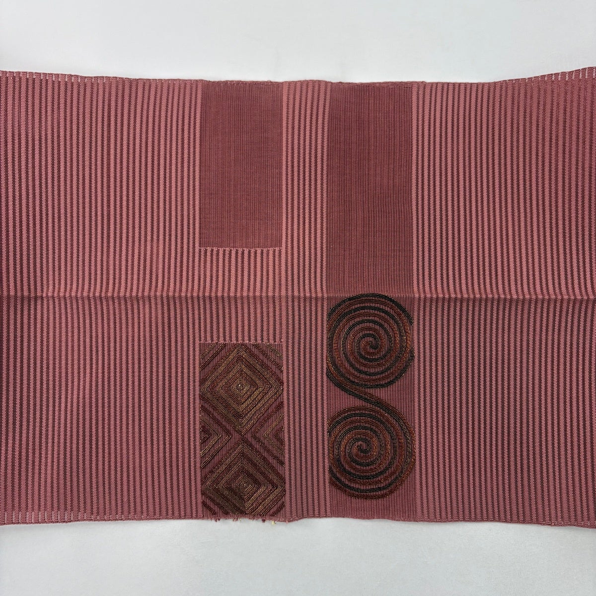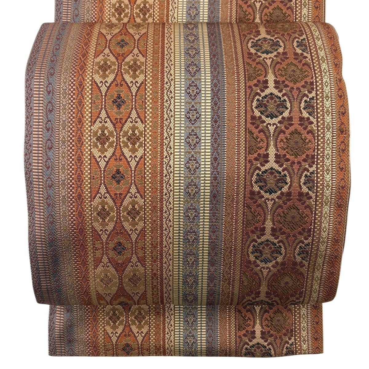 帯の格は着物とは逆で染よりも織のほうが格式が高く、名古屋帯は袋帯よりも格が低く様々な技法や生地で作成されているため組み合わせ数も多く場面によって使い分けることでセミフォーマルからカジュアルまで幅広く着用する事ができる帯です。 名古屋帯の名前の由来は名古屋の女学校の先生が考案したと言われるため名古屋帯という名前で呼ばれるようになりました。 形状はお太鼓部分までは通常の帯幅ですがそれ以降は幅が半分になっていることが多く、袋帯よりも短い作りになっているため一重太鼓でしか結ぶ事ができません。