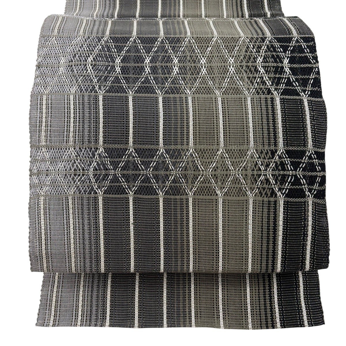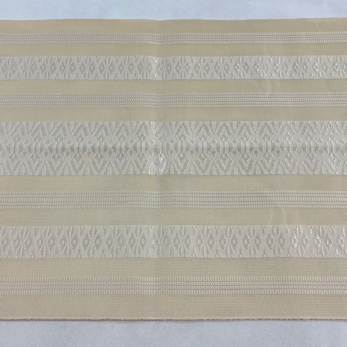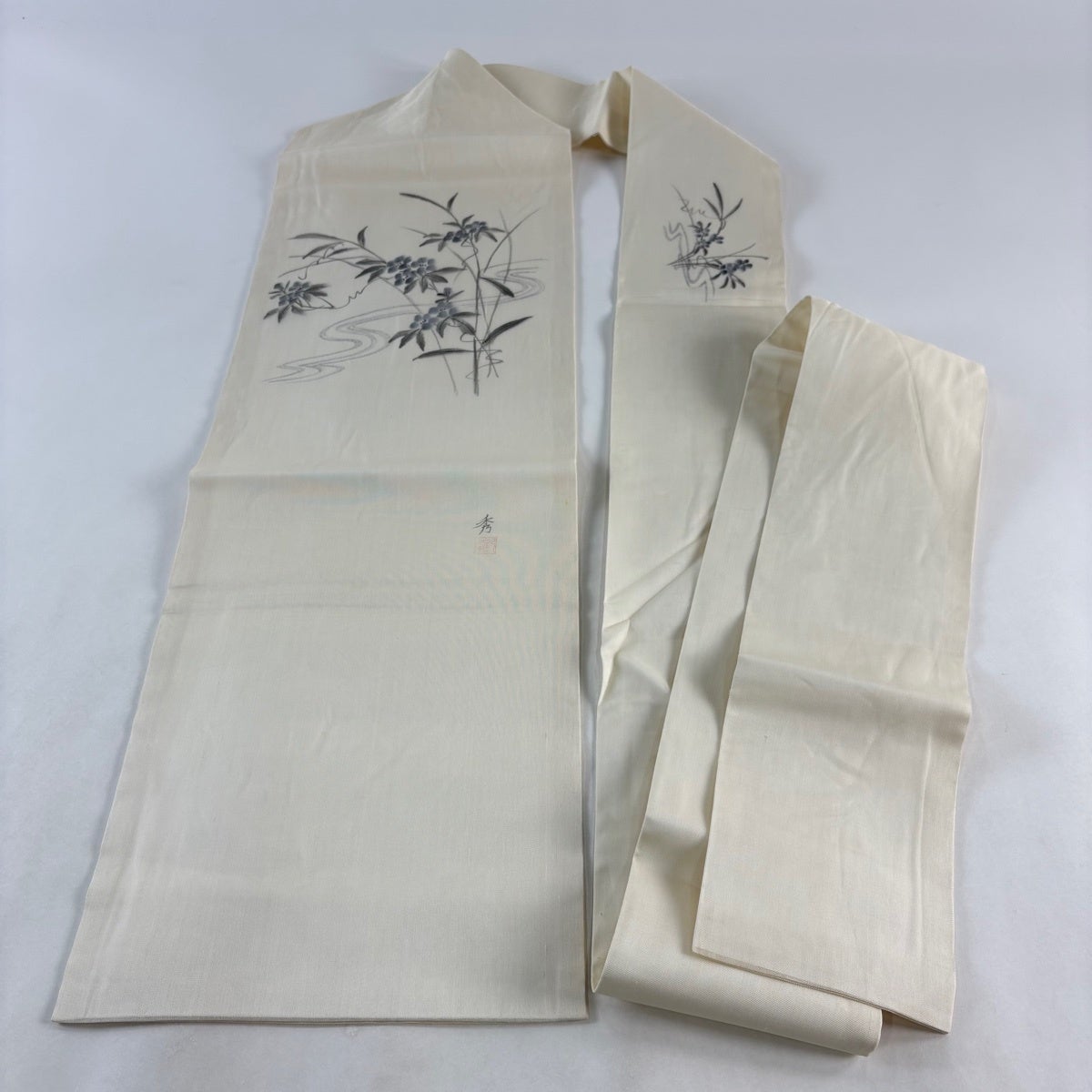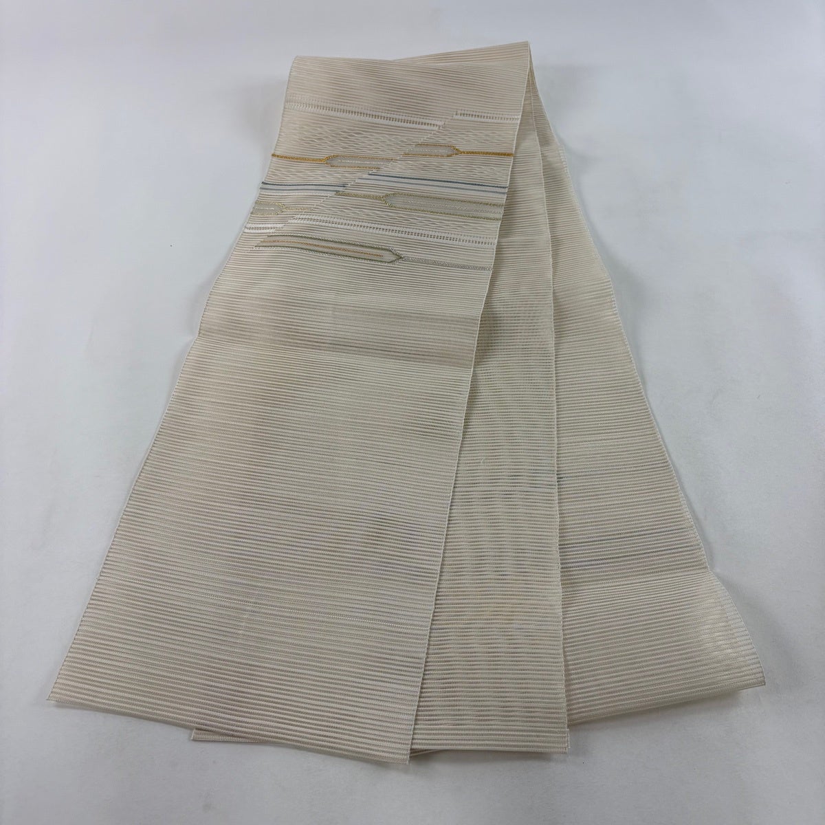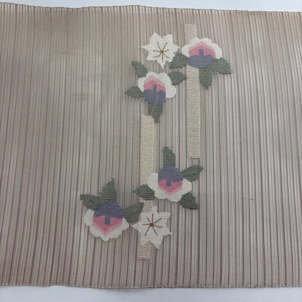 帯の格は着物とは逆で染よりも織のほうが格式が高く、名古屋帯は袋帯よりも格が低く様々な技法や生地で作成されているため組み合わせ数も多く場面によって使い分けることでセミフォーマルからカジュアルまで幅広く着用する事ができる帯です。 名古屋帯の名前の由来は名古屋の女学校の先生が考案したと言われるため名古屋帯という名前で呼ばれるようになりました。 形状はお太鼓部分までは通常の帯幅ですがそれ以降は幅が半分になっていることが多く、袋帯よりも短い作りになっているため一重太鼓でしか結ぶ事ができません。