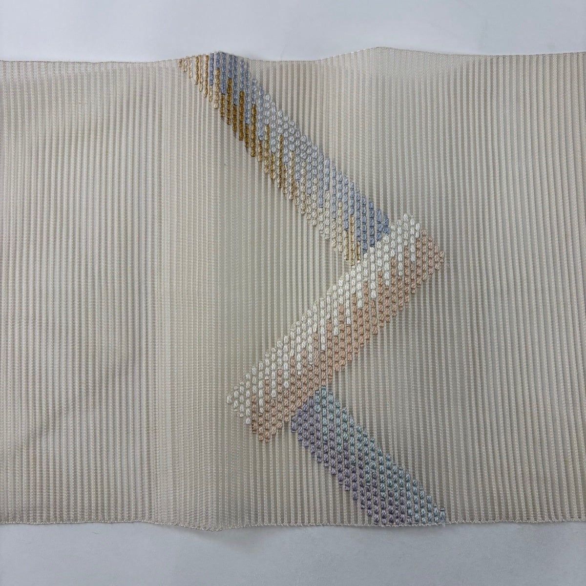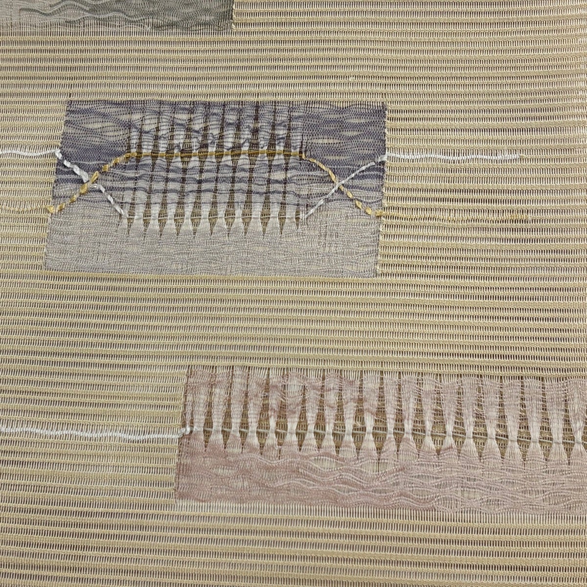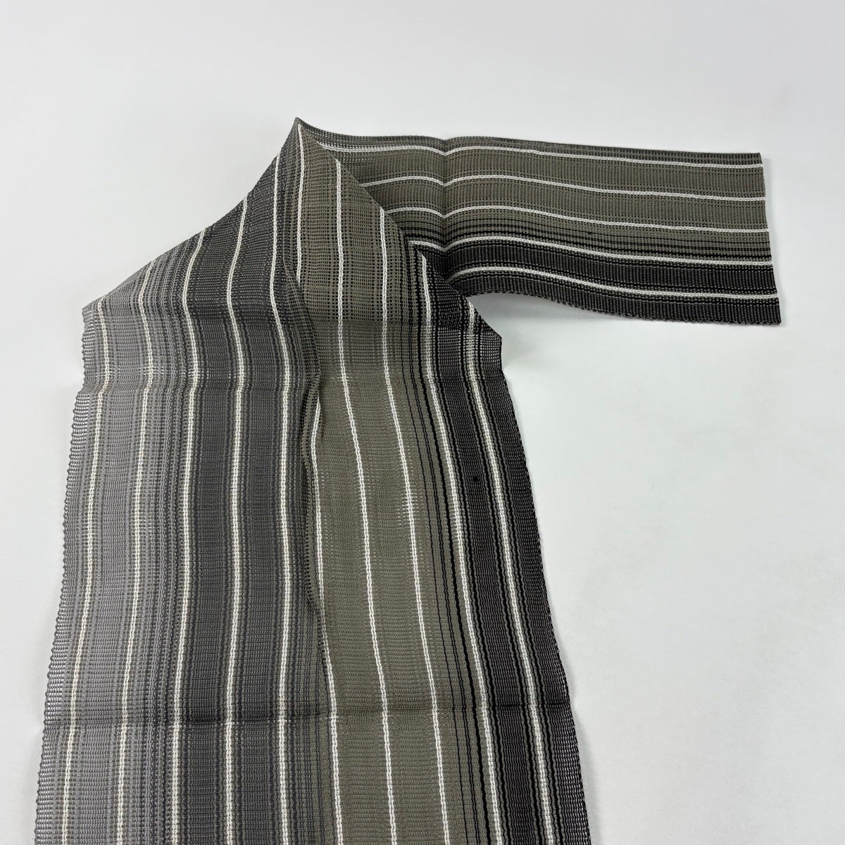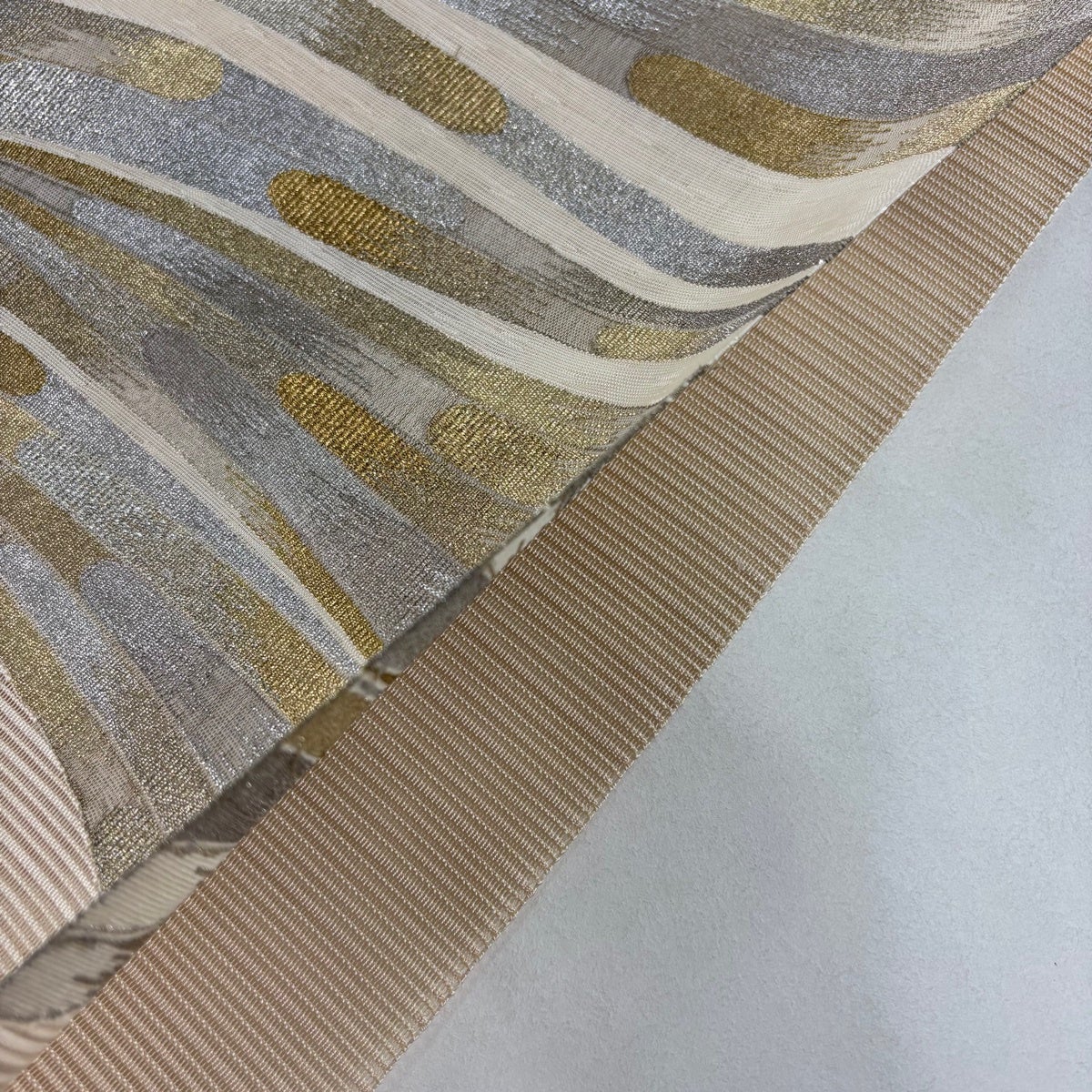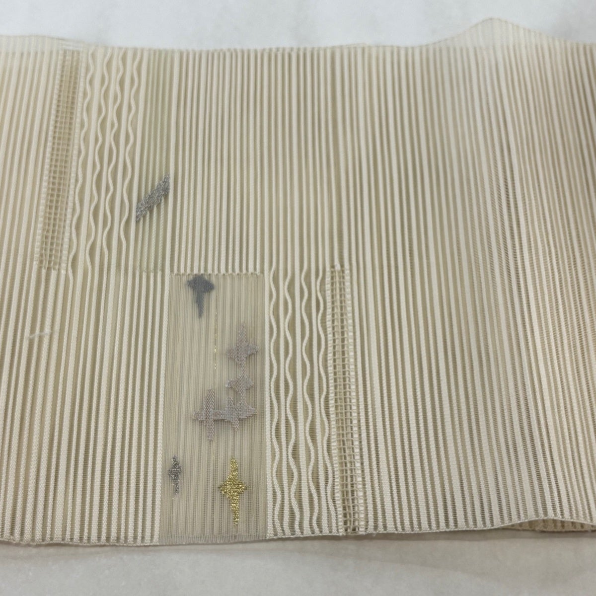 帯の格は着物とは逆で染よりも織のほうが格式が高く、名古屋帯は袋帯よりも格が低く様々な技法や生地で作成されているため組み合わせ数も多く場面によって使い分けることでセミフォーマルからカジュアルまで幅広く着用する事ができる帯です。 名古屋帯の名前の由来は名古屋の女学校の先生が考案したと言われるため名古屋帯という名前で呼ばれるようになりました。 形状はお太鼓部分までは通常の帯幅ですがそれ以降は幅が半分になっていることが多く、袋帯よりも短い作りになっているため一重太鼓でしか結ぶ事ができません。