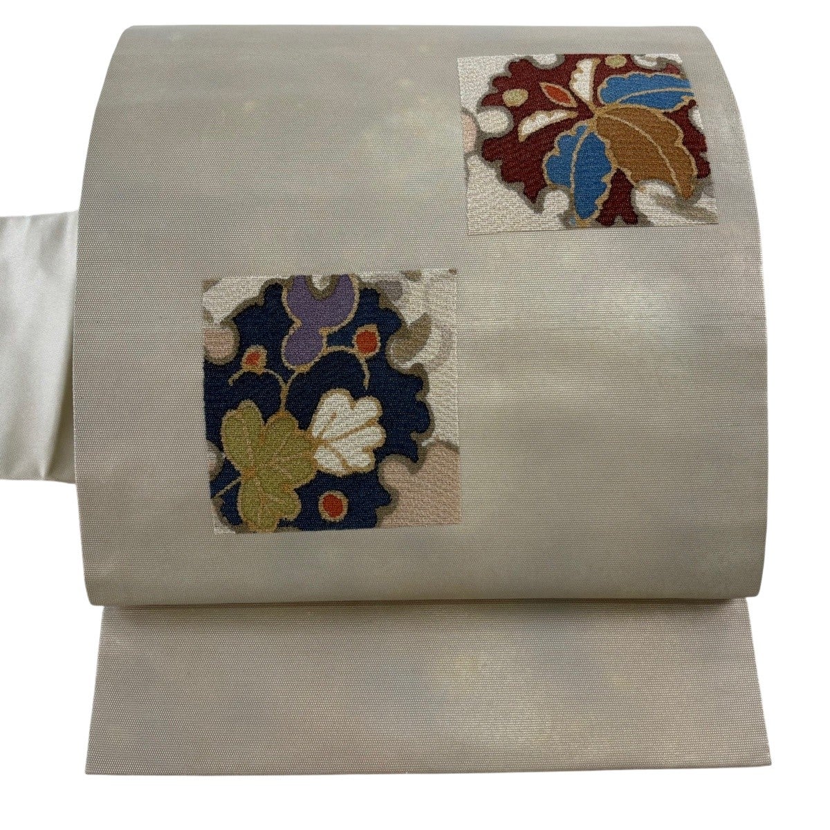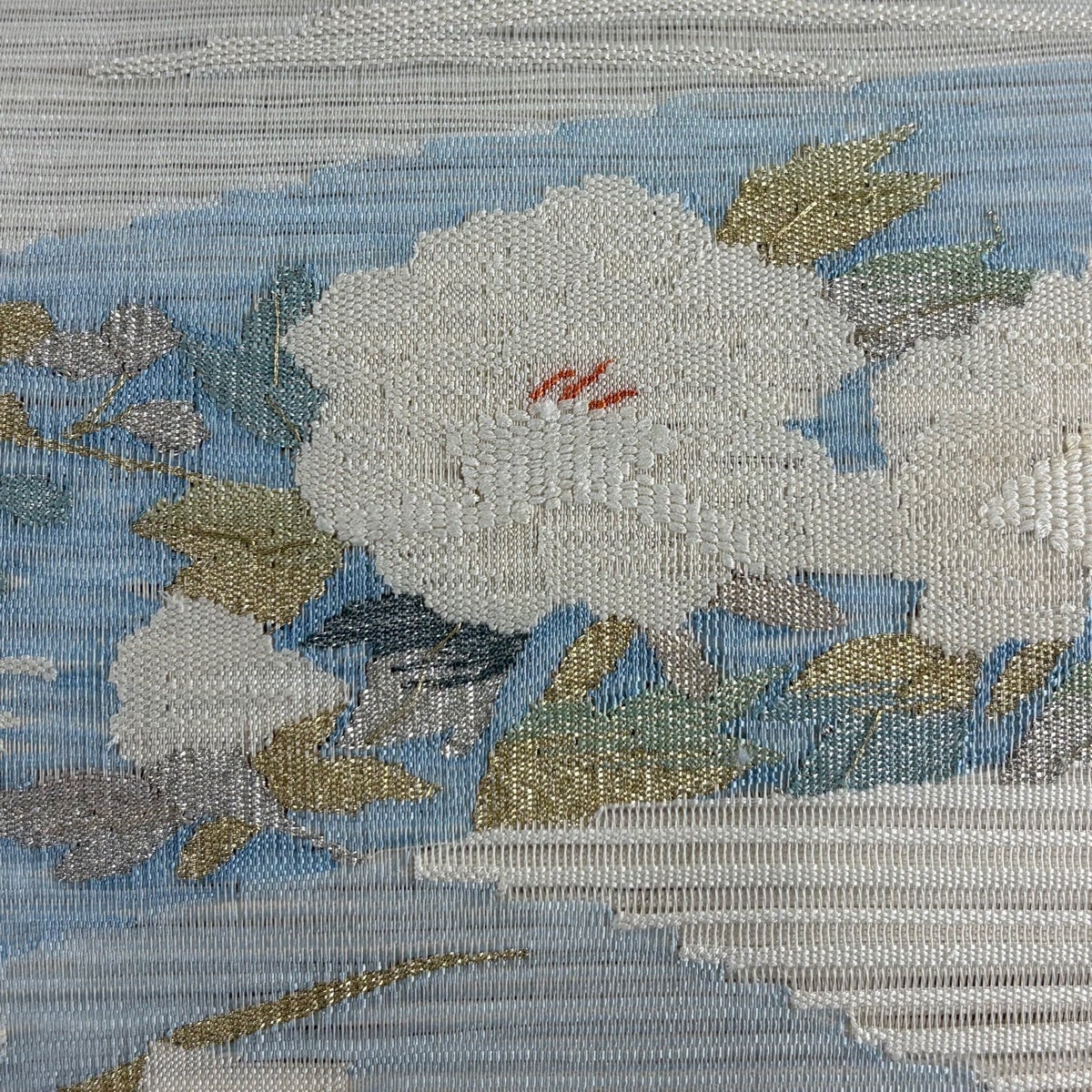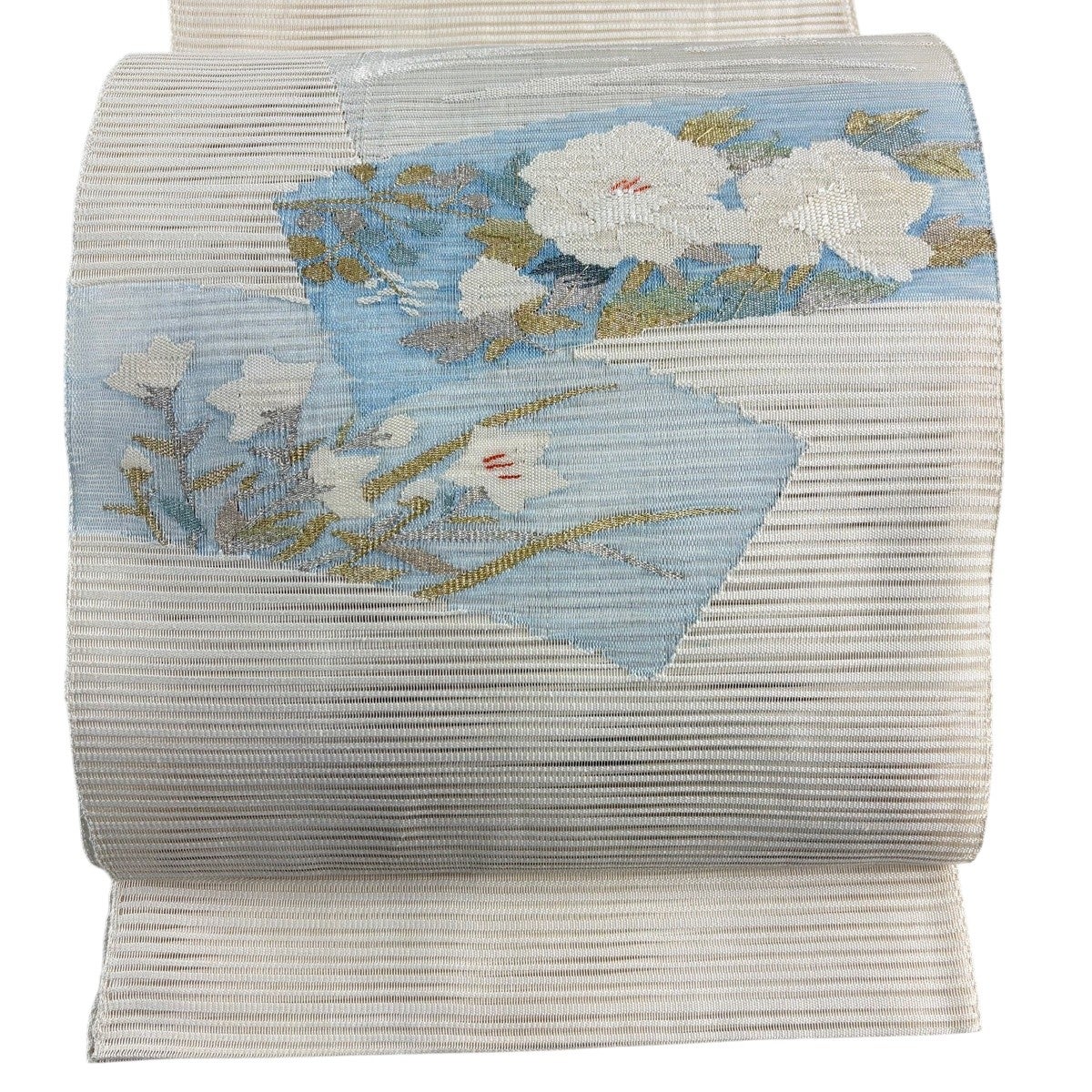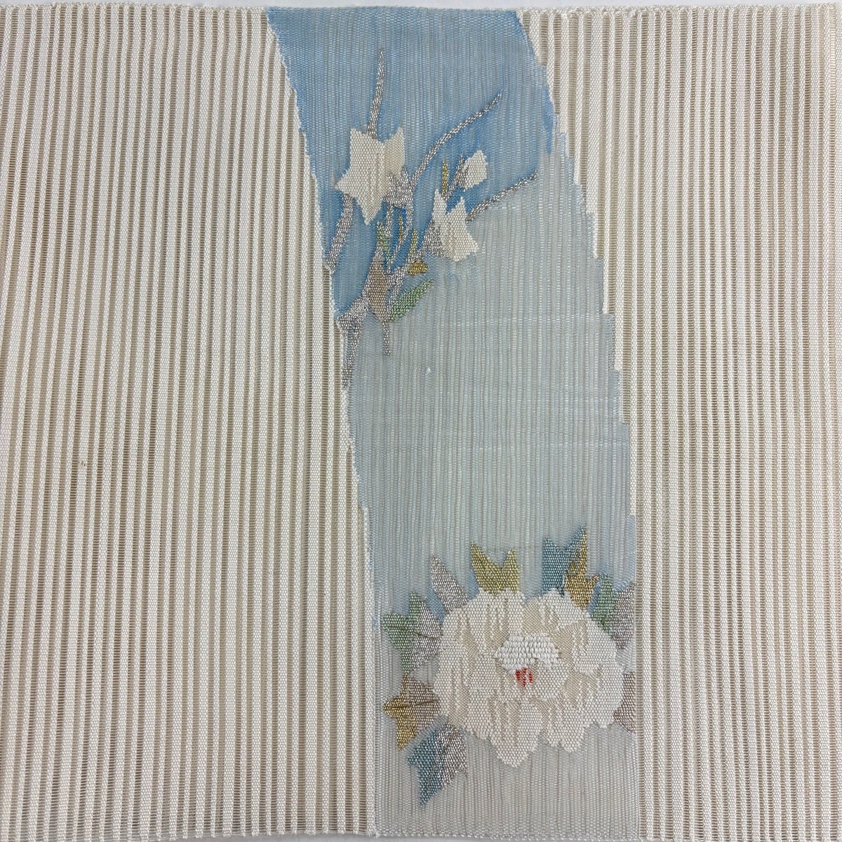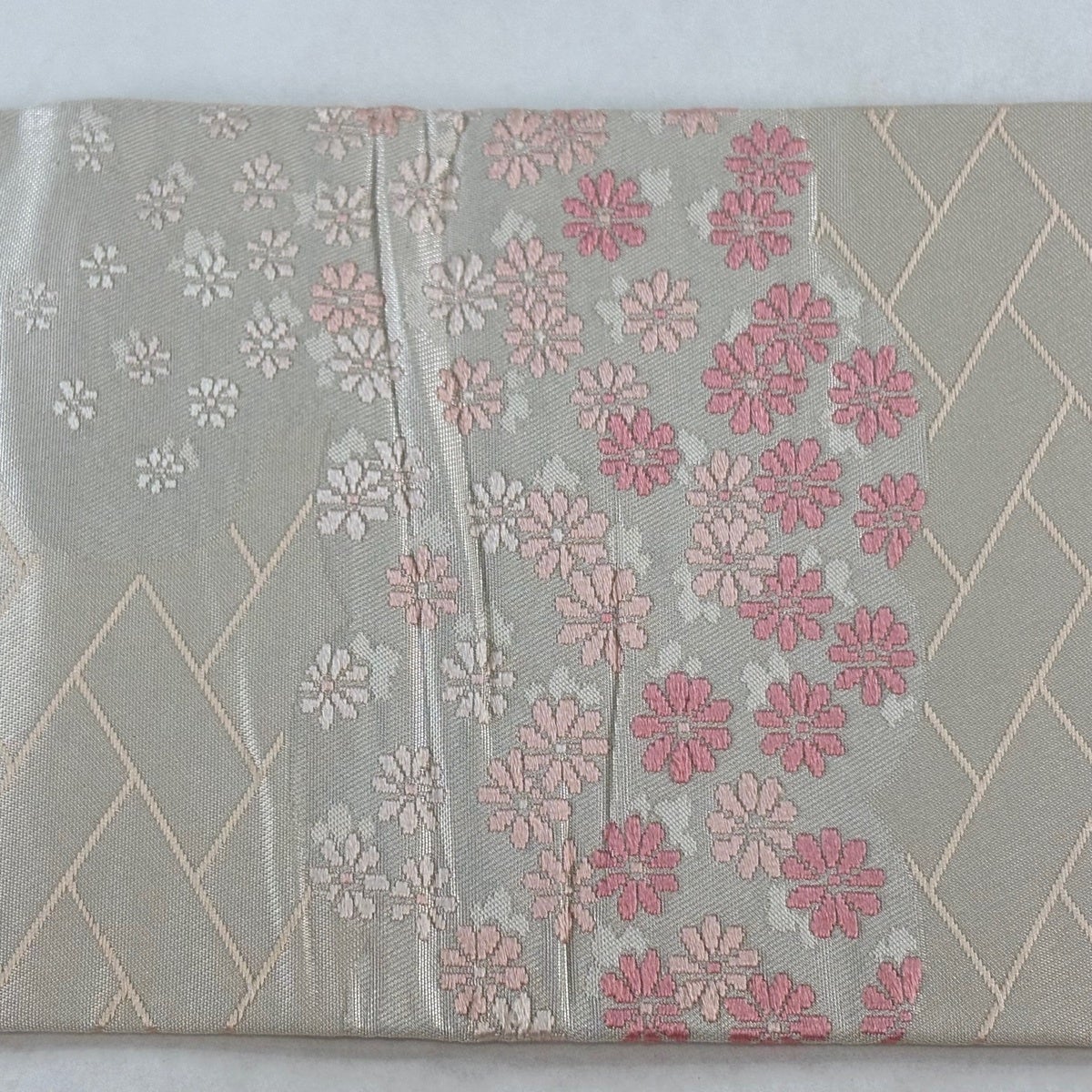 帯の格は着物とは逆で染よりも織のほうが格式が高く、名古屋帯は袋帯よりも格が低く様々な技法や生地で作成されているため組み合わせ数も多く場面によって使い分けることでセミフォーマルからカジュアルまで幅広く着用する事ができる帯です。 名古屋帯の名前の由来は名古屋の女学校の先生が考案したと言われるため名古屋帯という名前で呼ばれるようになりました。 形状はお太鼓部分までは通常の帯幅ですがそれ以降は幅が半分になっていることが多く、袋帯よりも短い作りになっているため一重太鼓でしか結ぶ事ができません。