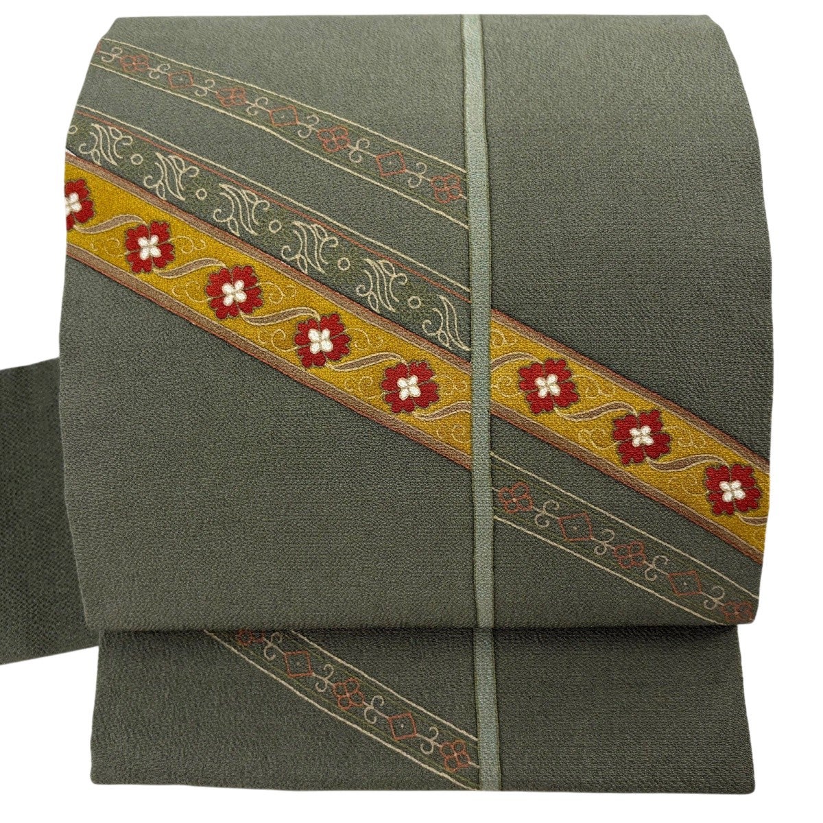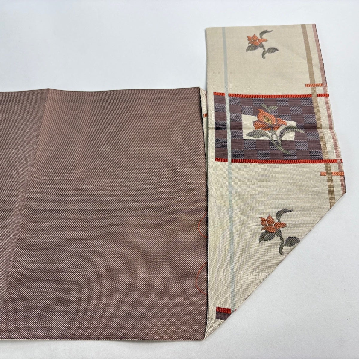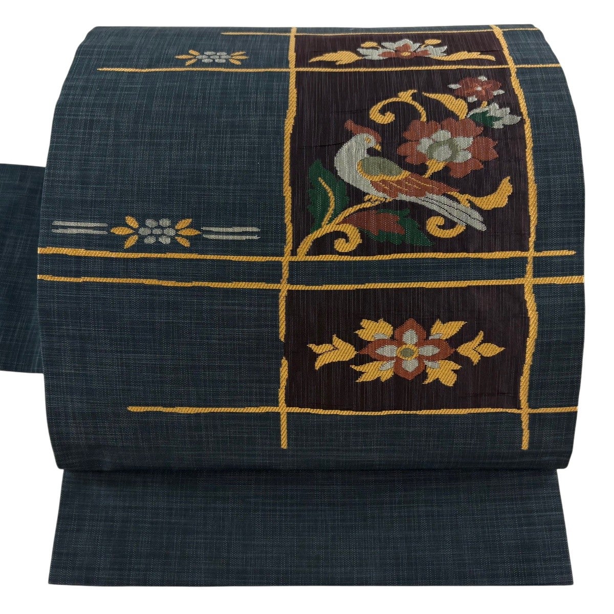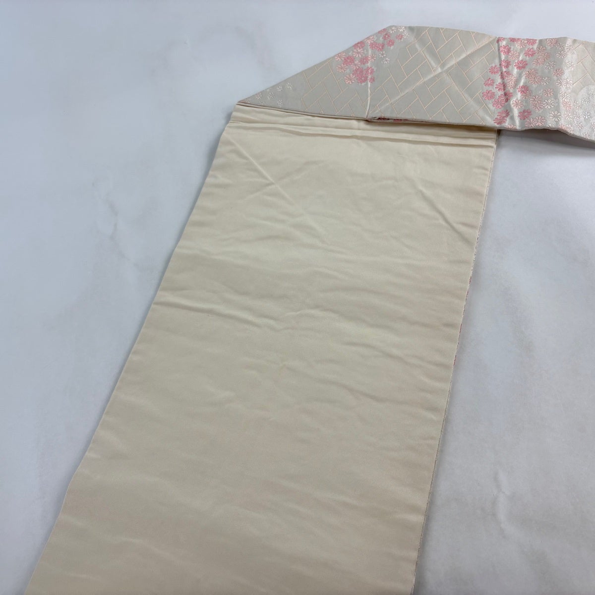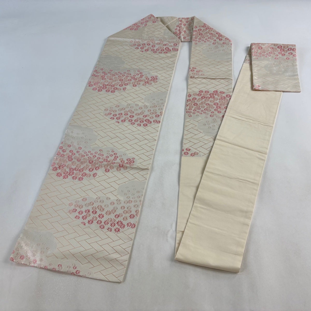 帯の格は着物とは逆で染よりも織のほうが格式が高く、名古屋帯は袋帯よりも格が低く様々な技法や生地で作成されているため組み合わせ数も多く場面によって使い分けることでセミフォーマルからカジュアルまで幅広く着用する事ができる帯です。 名古屋帯の名前の由来は名古屋の女学校の先生が考案したと言われるため名古屋帯という名前で呼ばれるようになりました。 形状はお太鼓部分までは通常の帯幅ですがそれ以降は幅が半分になっていることが多く、袋帯よりも短い作りになっているため一重太鼓でしか結ぶ事ができません。