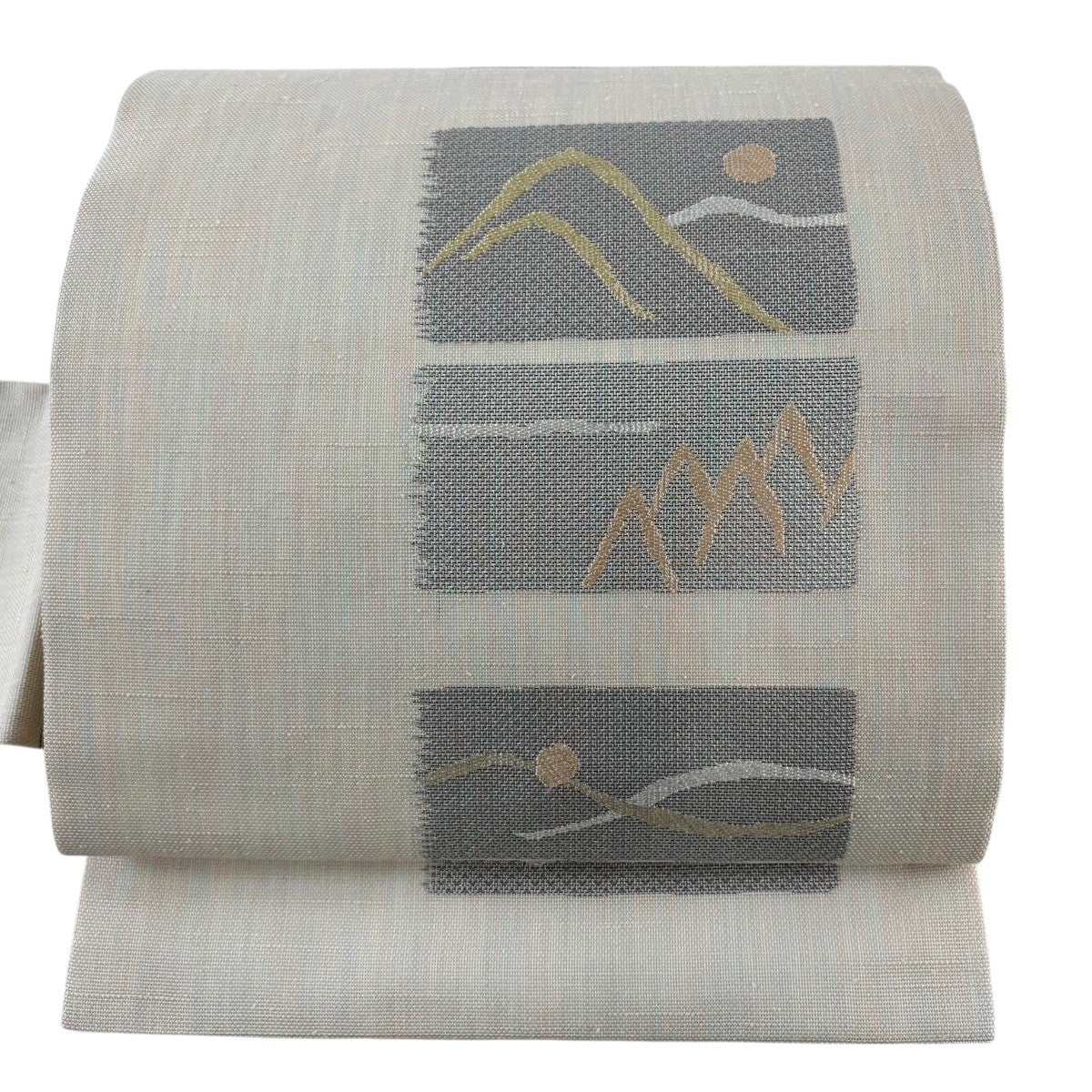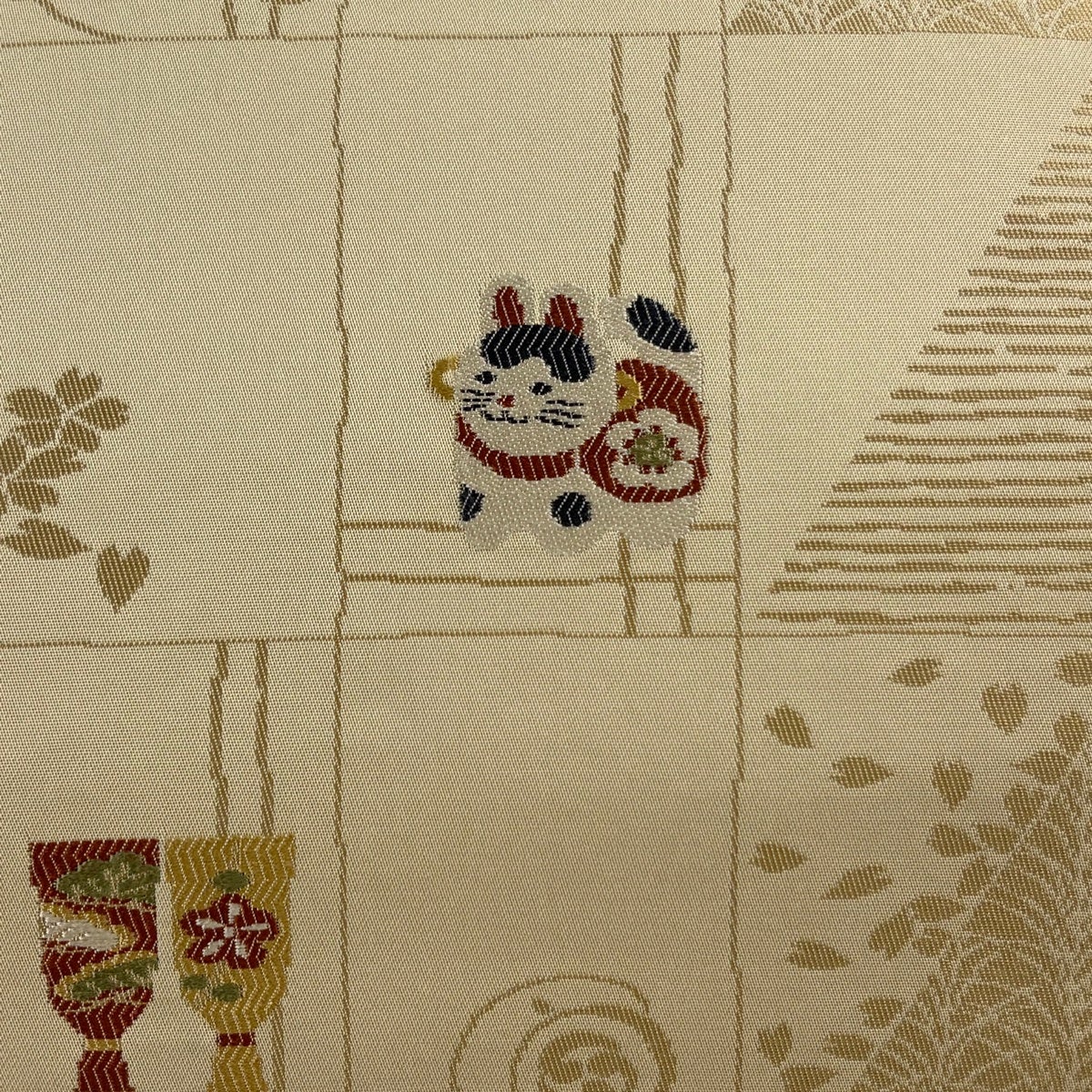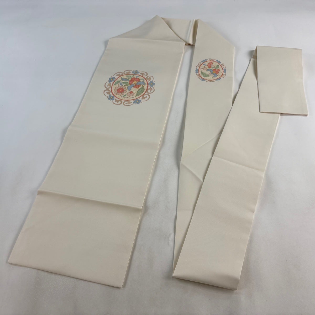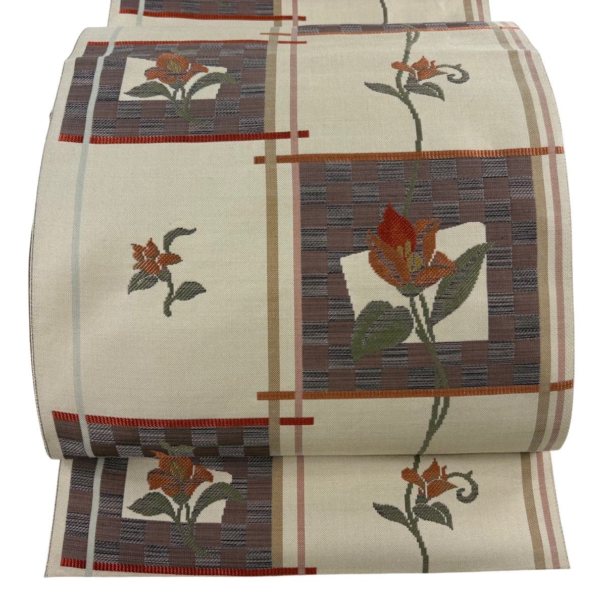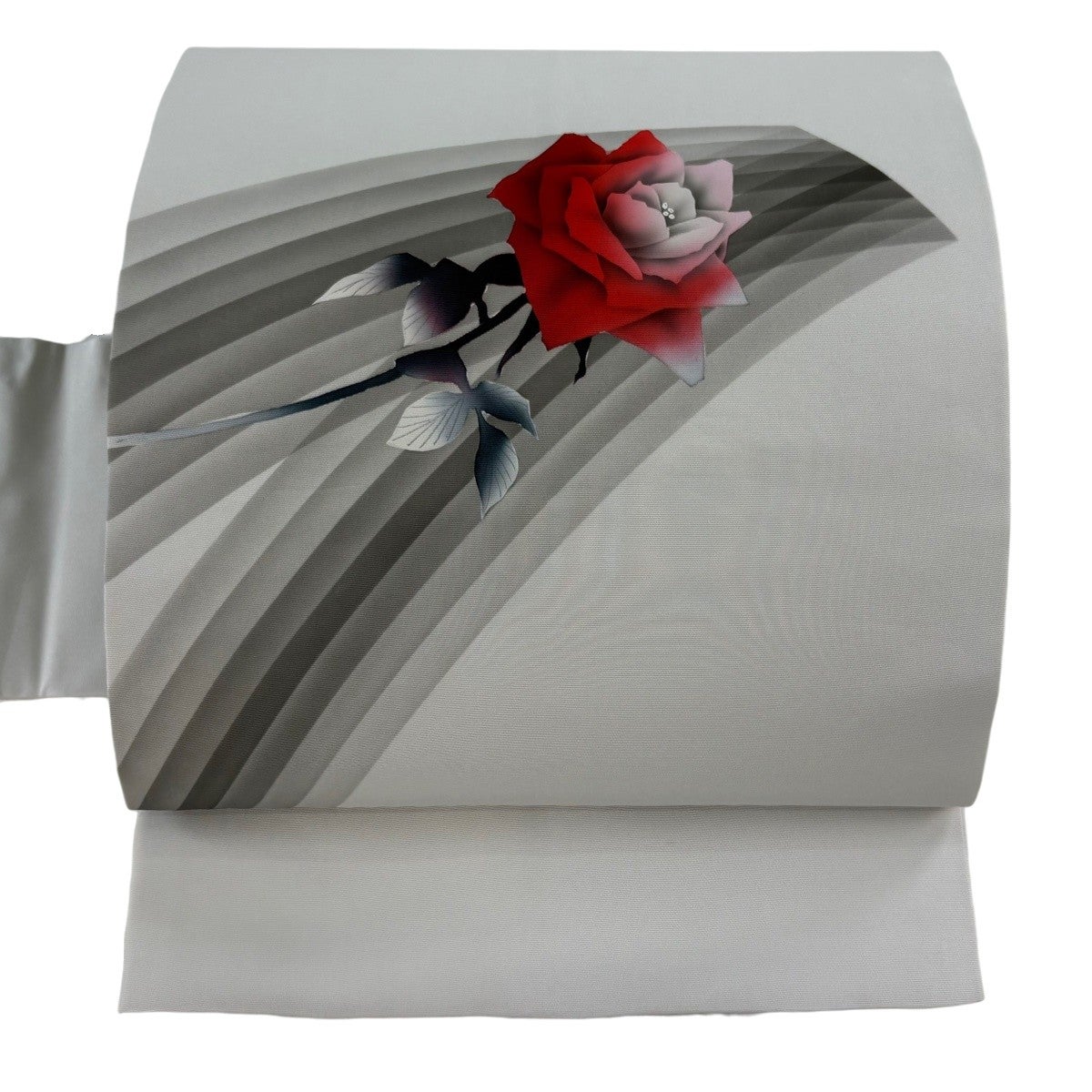 帯の格は着物とは逆で染よりも織のほうが格式が高く、名古屋帯は袋帯よりも格が低く様々な技法や生地で作成されているため組み合わせ数も多く場面によって使い分けることでセミフォーマルからカジュアルまで幅広く着用する事ができる帯です。 名古屋帯の名前の由来は名古屋の女学校の先生が考案したと言われるため名古屋帯という名前で呼ばれるようになりました。 形状はお太鼓部分までは通常の帯幅ですがそれ以降は幅が半分になっていることが多く、袋帯よりも短い作りになっているため一重太鼓でしか結ぶ事ができません。