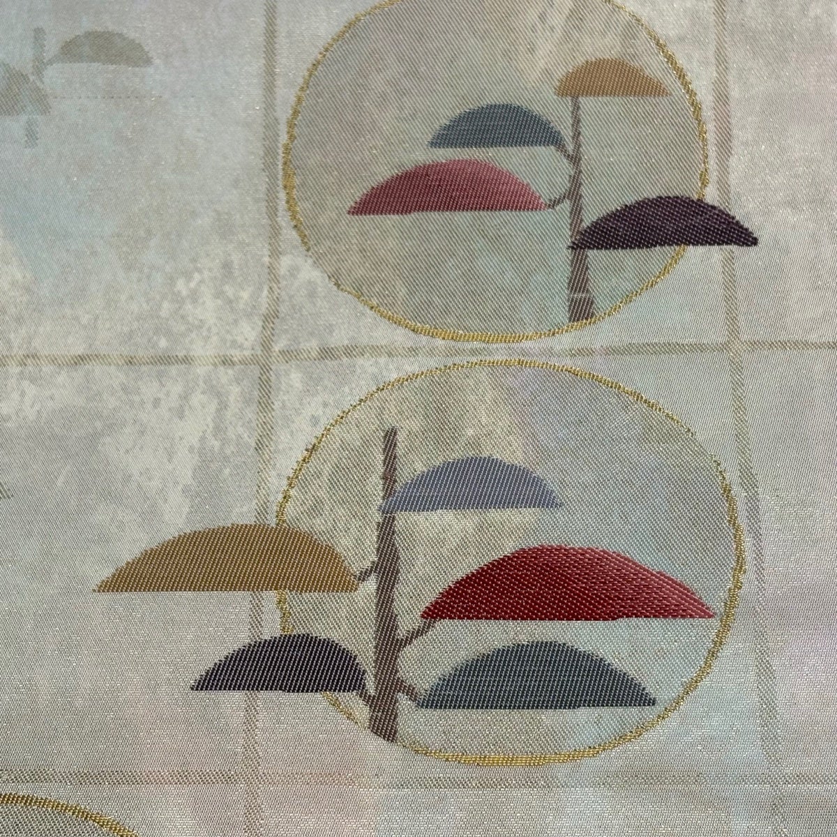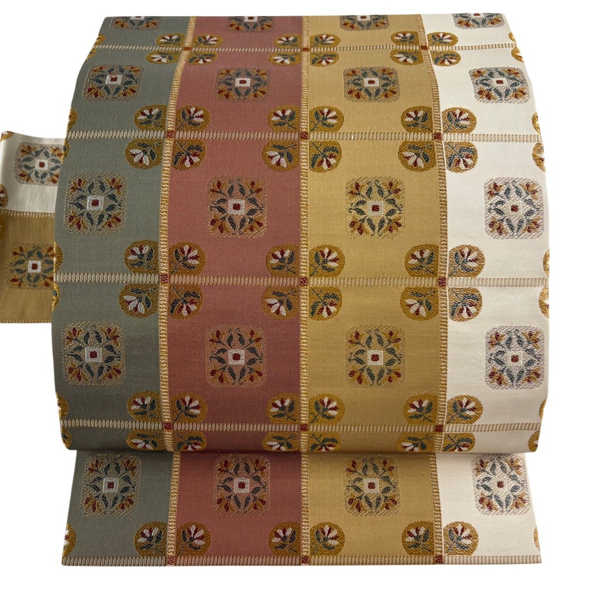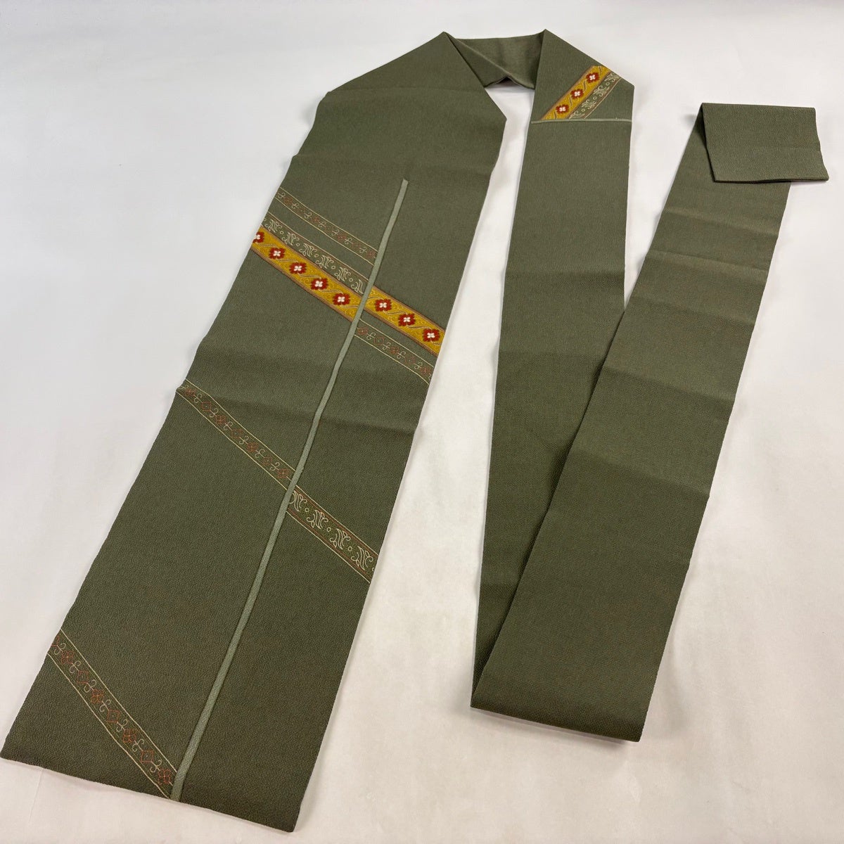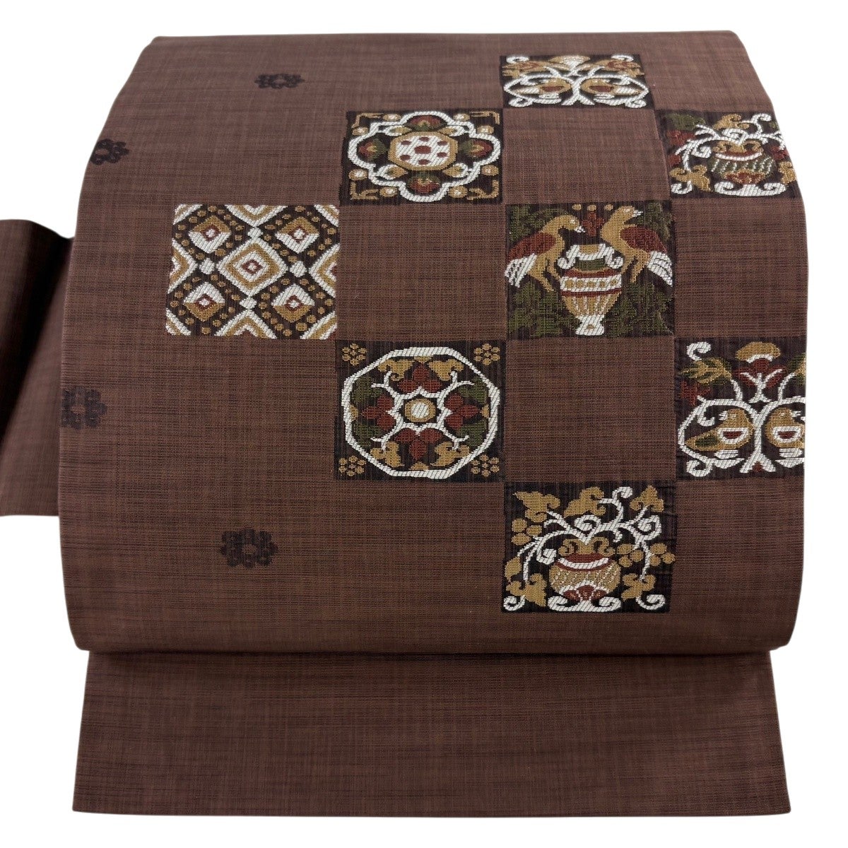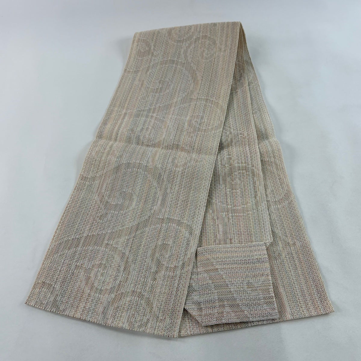 帯の格は着物とは逆で染よりも織のほうが格式が高く、名古屋帯は袋帯よりも格が低く様々な技法や生地で作成されているため組み合わせ数も多く場面によって使い分けることでセミフォーマルからカジュアルまで幅広く着用する事ができる帯です。 名古屋帯の名前の由来は名古屋の女学校の先生が考案したと言われるため名古屋帯という名前で呼ばれるようになりました。 形状はお太鼓部分までは通常の帯幅ですがそれ以降は幅が半分になっていることが多く、袋帯よりも短い作りになっているため一重太鼓でしか結ぶ事ができません。