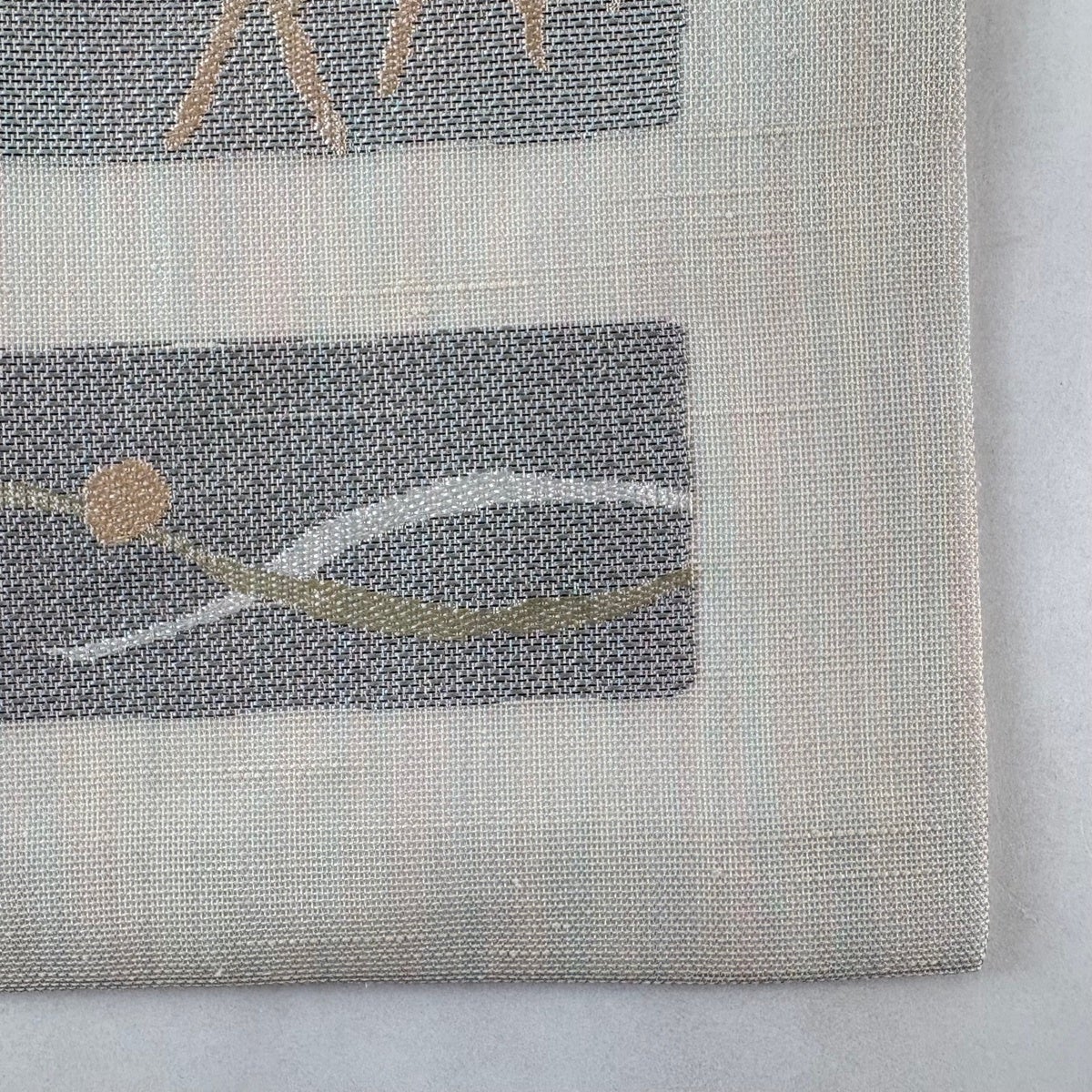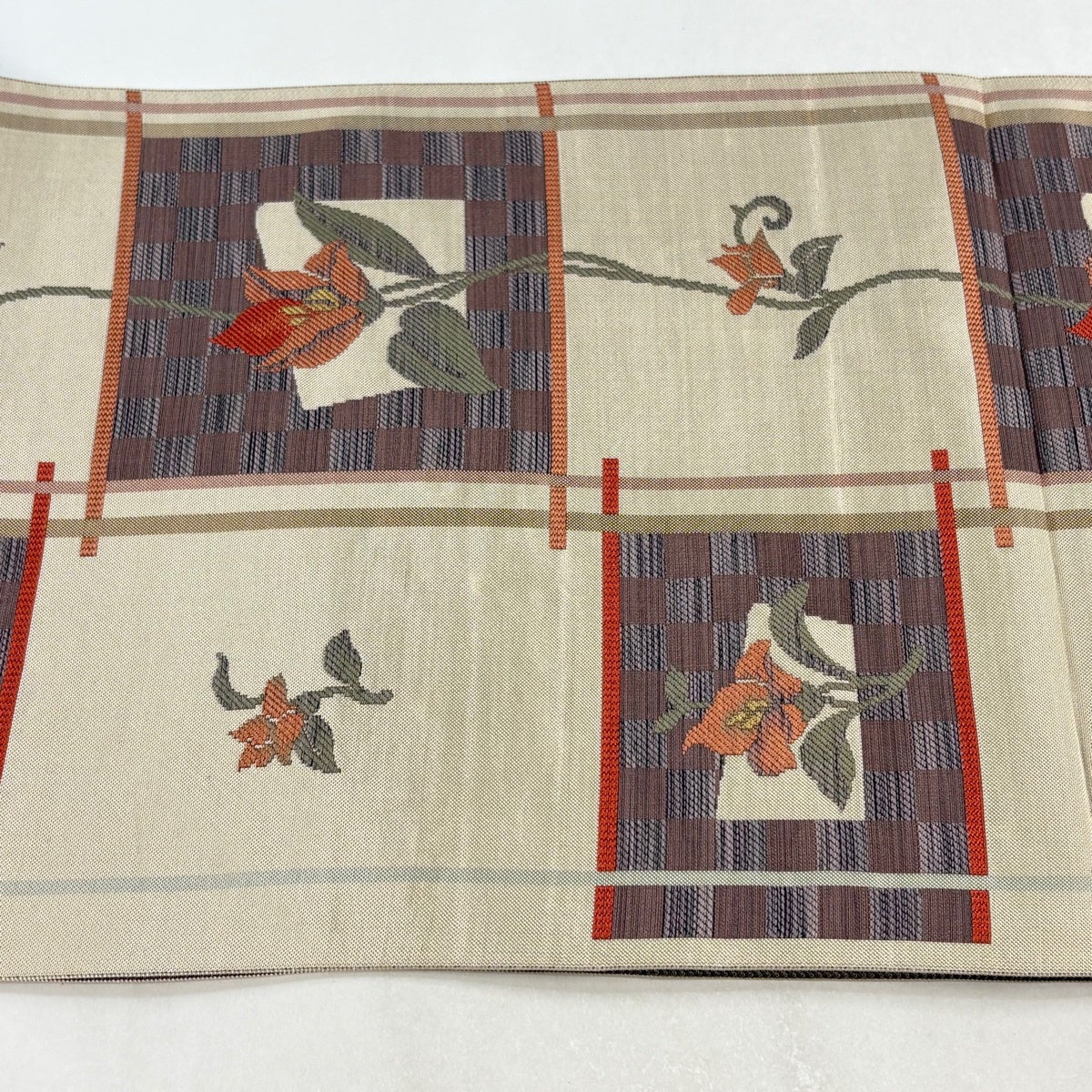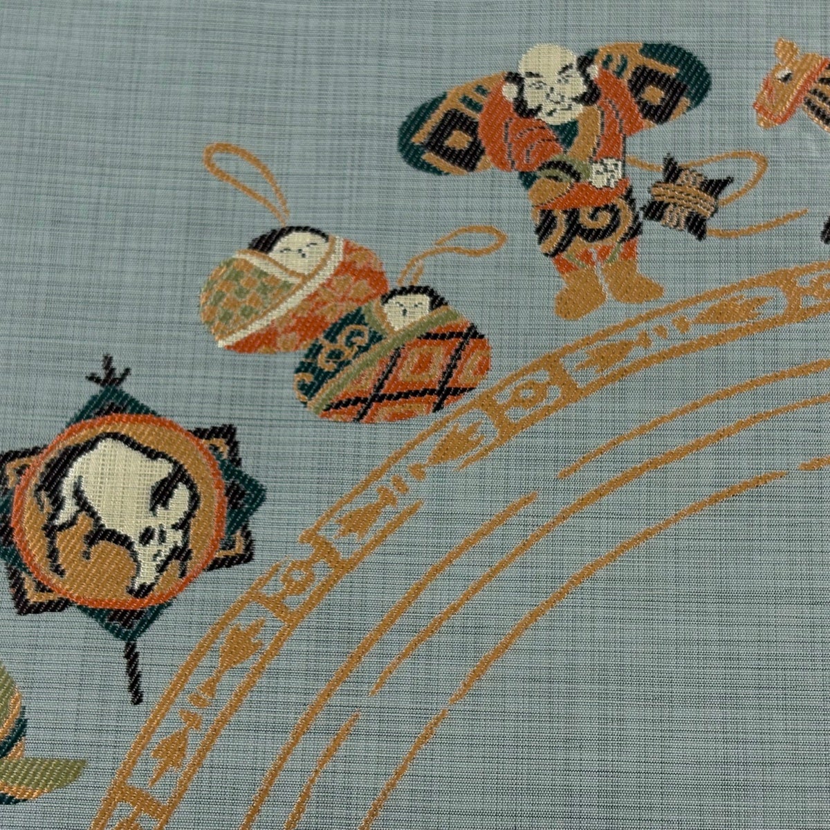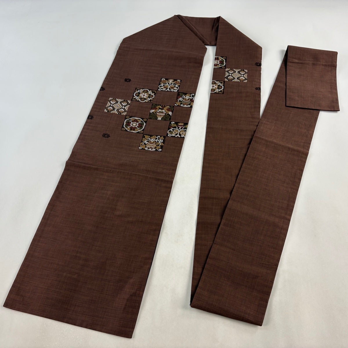 帯の格は着物とは逆で染よりも織のほうが格式が高く、名古屋帯は袋帯よりも格が低く様々な技法や生地で作成されているため組み合わせ数も多く場面によって使い分けることでセミフォーマルからカジュアルまで幅広く着用する事ができる帯です。 名古屋帯の名前の由来は名古屋の女学校の先生が考案したと言われるため名古屋帯という名前で呼ばれるようになりました。 形状はお太鼓部分までは通常の帯幅ですがそれ以降は幅が半分になっていることが多く、袋帯よりも短い作りになっているため一重太鼓でしか結ぶ事ができません。