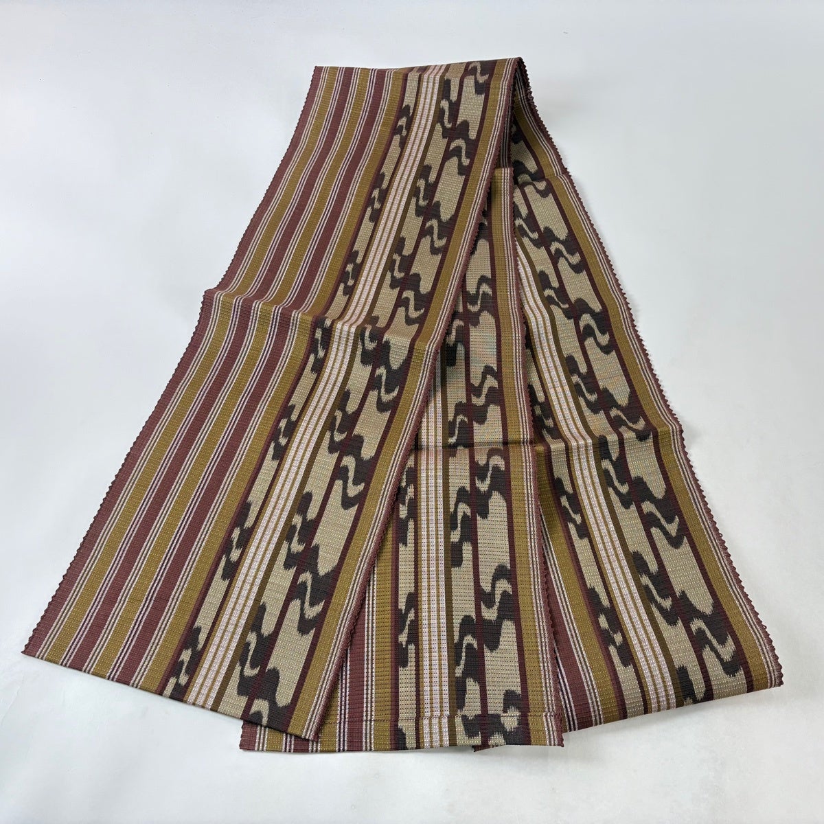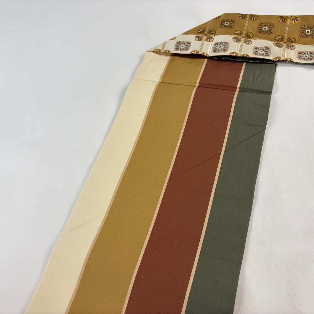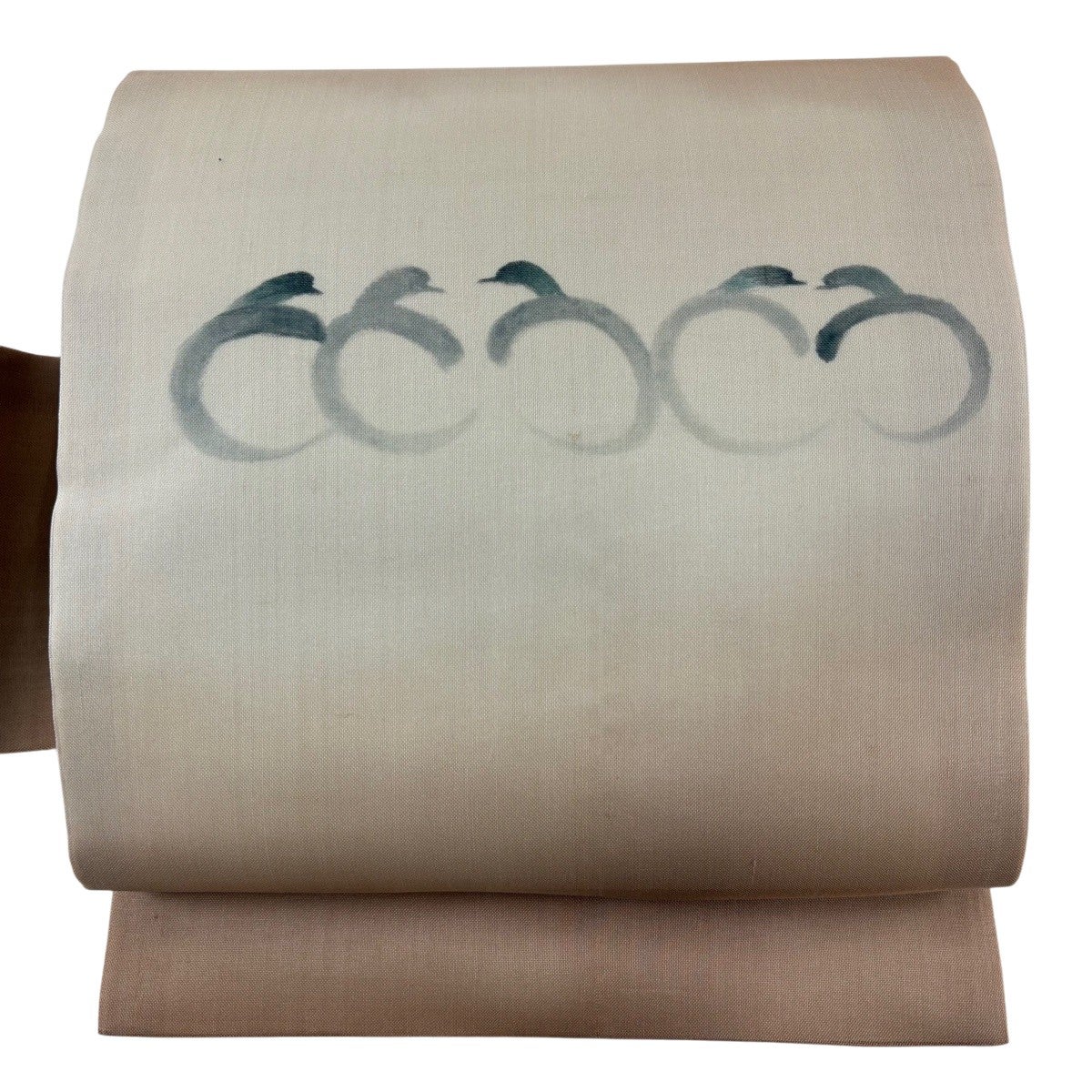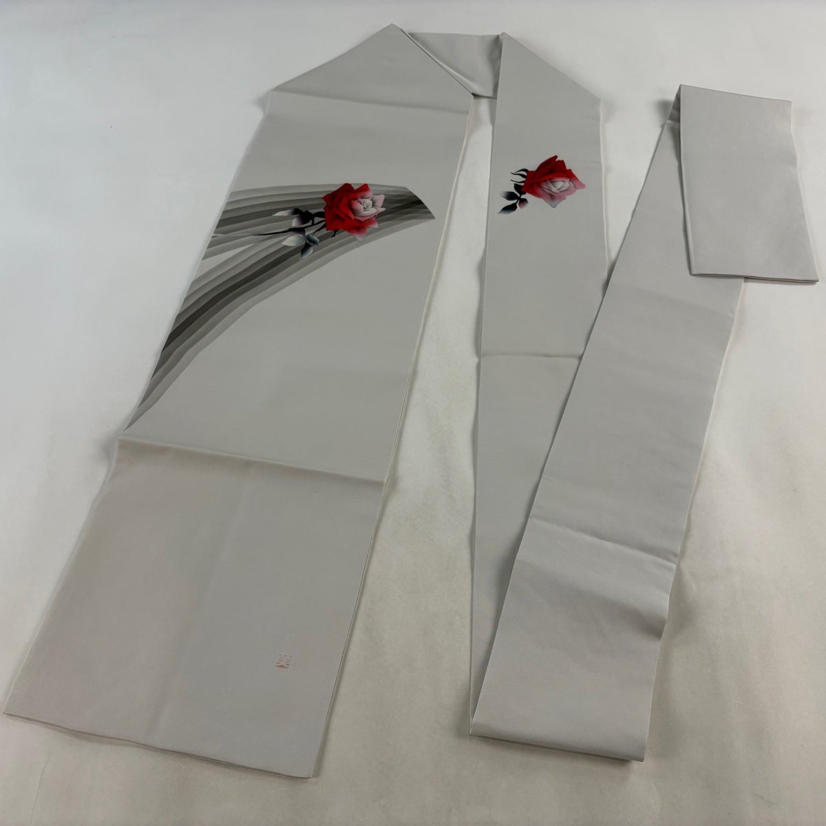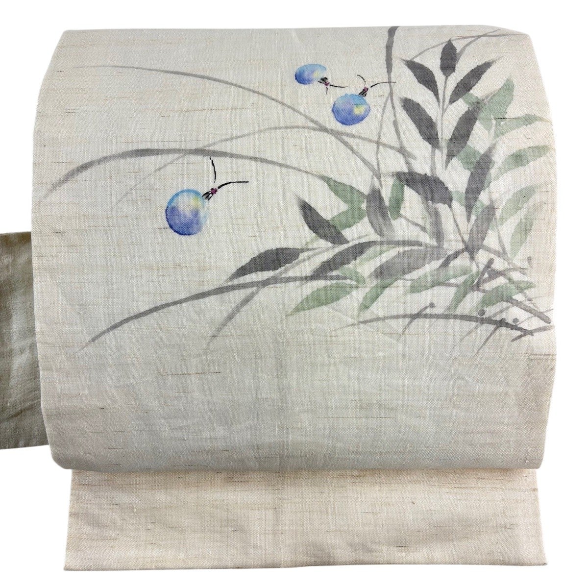 帯の格は着物とは逆で染よりも織のほうが格式が高く、名古屋帯は袋帯よりも格が低く様々な技法や生地で作成されているため組み合わせ数も多く場面によって使い分けることでセミフォーマルからカジュアルまで幅広く着用する事ができる帯です。 名古屋帯の名前の由来は名古屋の女学校の先生が考案したと言われるため名古屋帯という名前で呼ばれるようになりました。 形状はお太鼓部分までは通常の帯幅ですがそれ以降は幅が半分になっていることが多く、袋帯よりも短い作りになっているため一重太鼓でしか結ぶ事ができません。