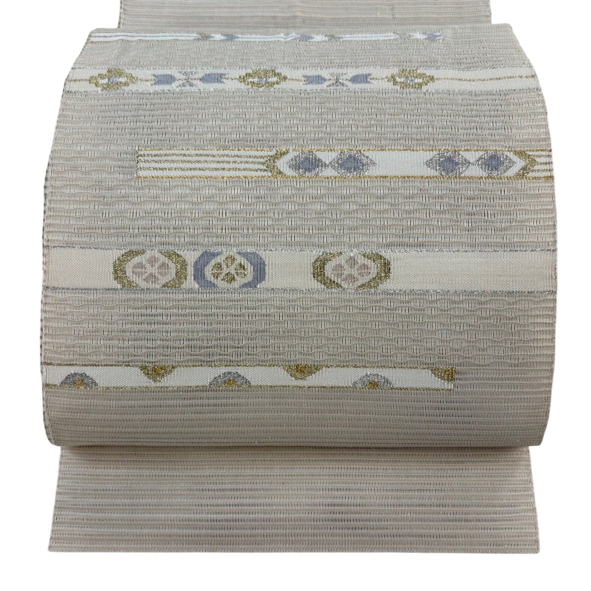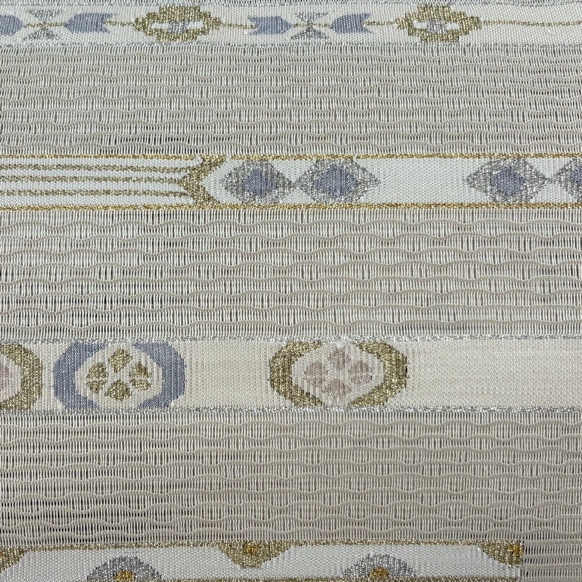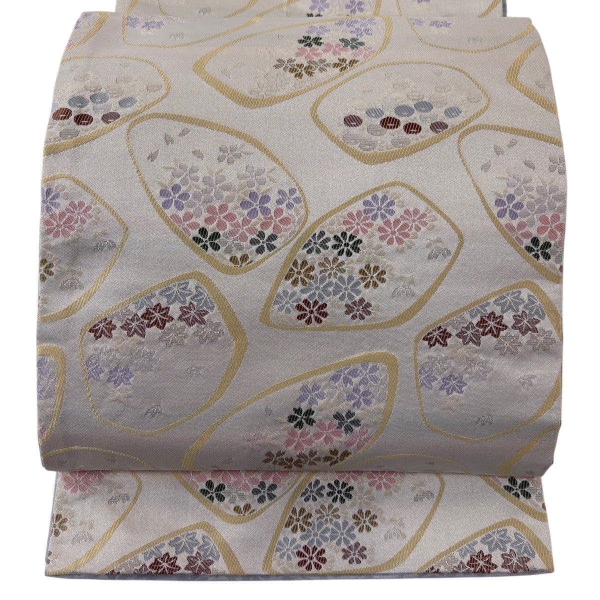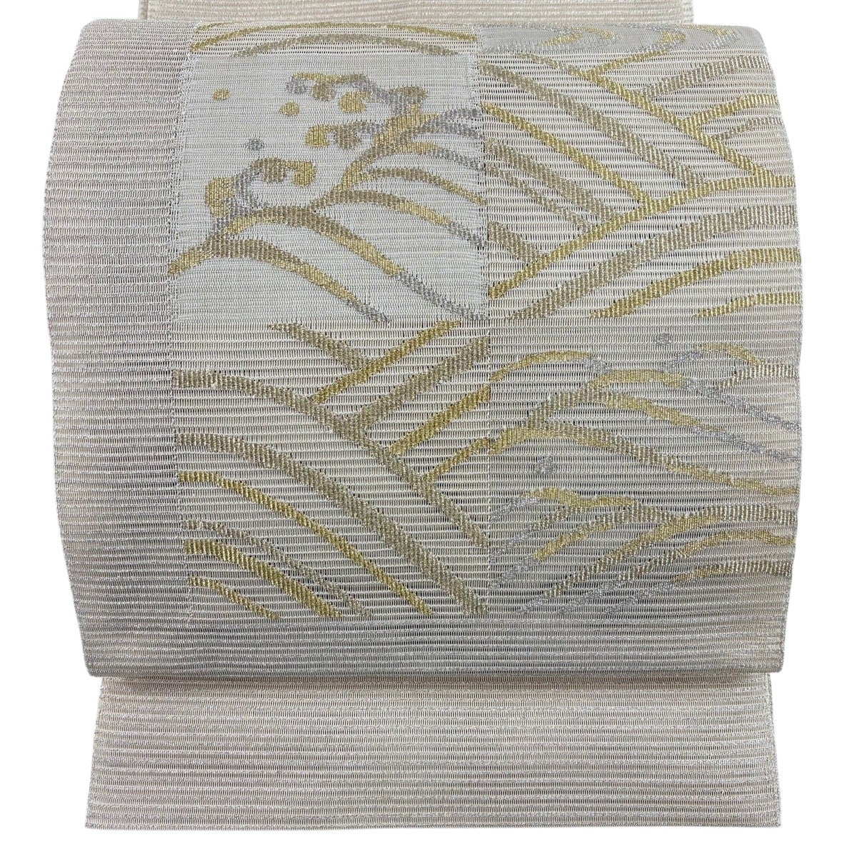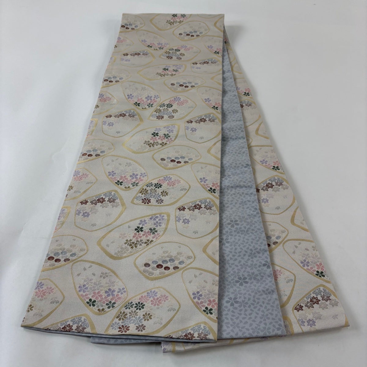帯の格は着物とは逆で染よりも織のほうが格式が高く、名古屋帯は袋帯よりも格が低く様々な技法や生地で作成されているため組み合わせ数も多く場面によって使い分けることでセミフォーマルからカジュアルまで幅広く着用する事ができる帯です。 名古屋帯の名前の由来は名古屋の女学校の先生が考案したと言われるため名古屋帯という名前で呼ばれるようになりました。 形状はお太鼓部分までは通常の帯幅ですがそれ以降は幅が半分になっていることが多く、袋帯よりも短い作りになっているため一重太鼓でしか結ぶ事ができません。