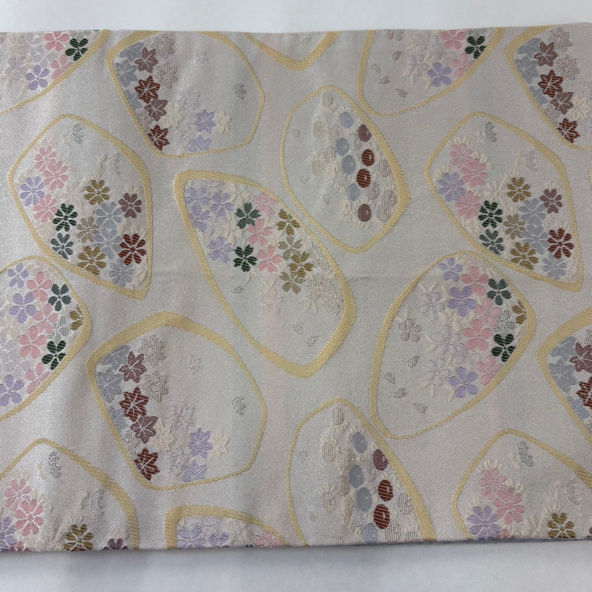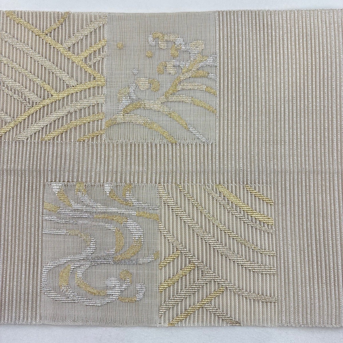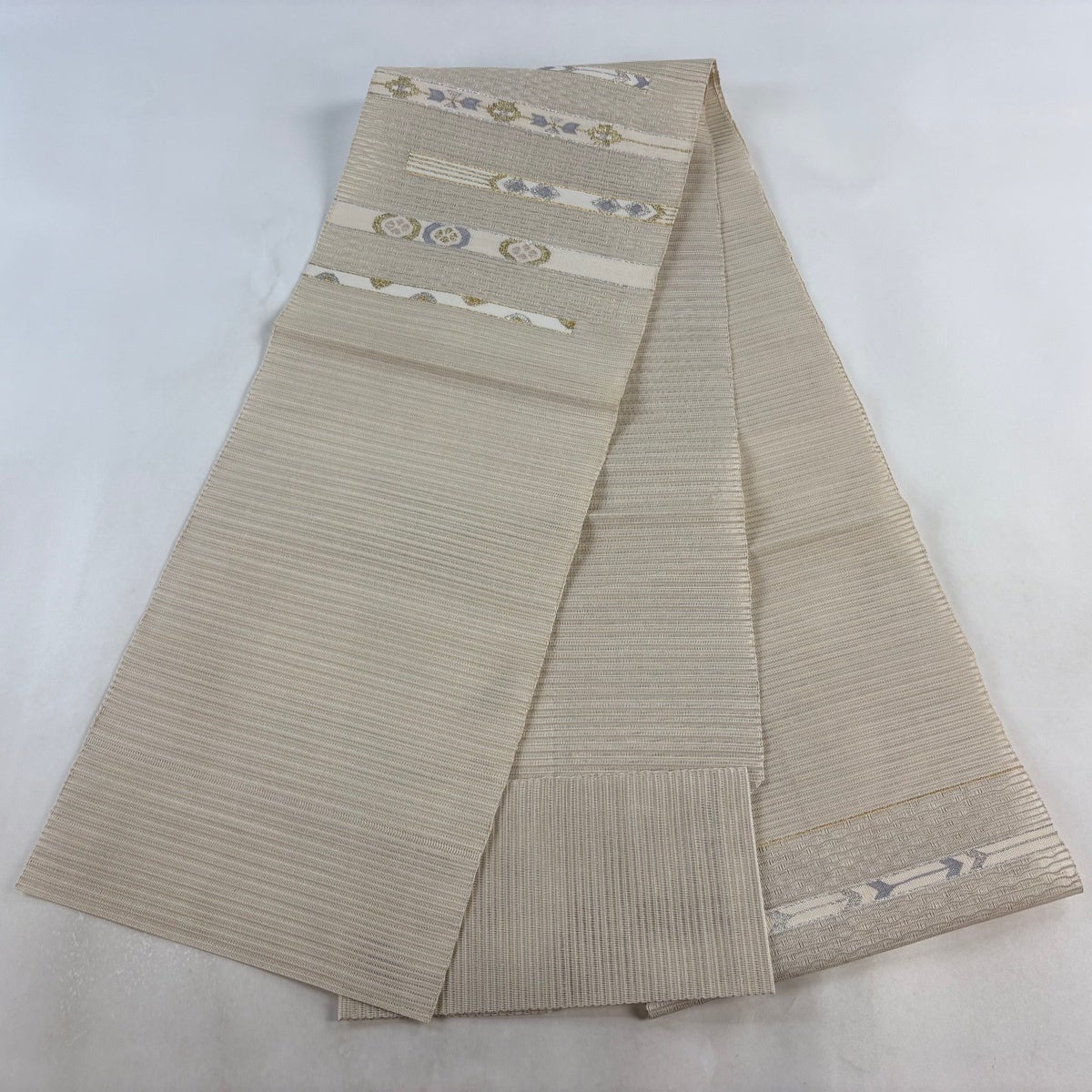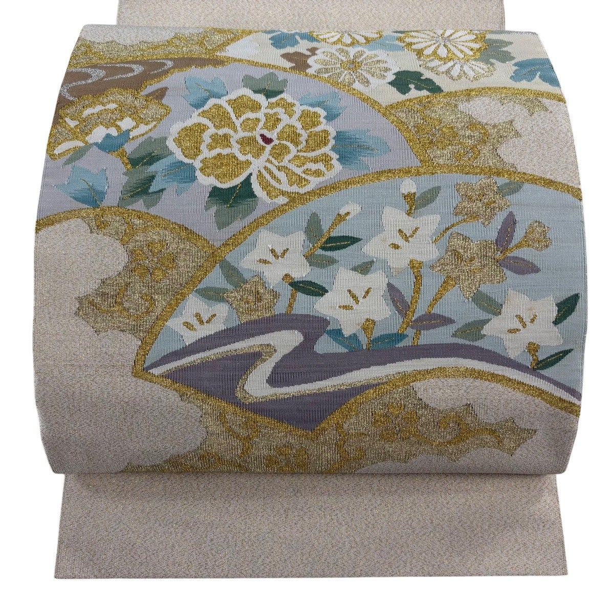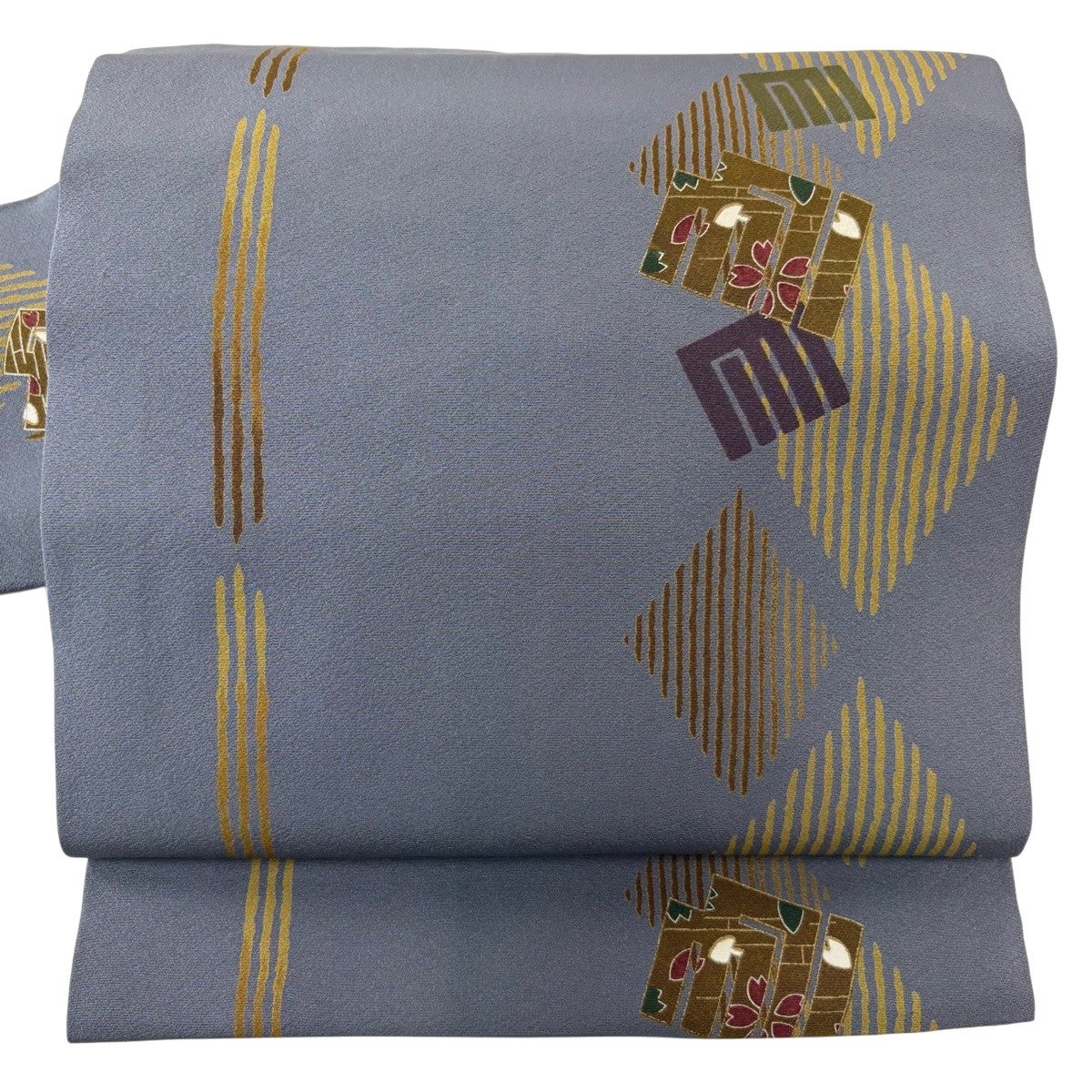 帯の格は着物とは逆で染よりも織のほうが格式が高く、名古屋帯は袋帯よりも格が低く様々な技法や生地で作成されているため組み合わせ数も多く場面によって使い分けることでセミフォーマルからカジュアルまで幅広く着用する事ができる帯です。 名古屋帯の名前の由来は名古屋の女学校の先生が考案したと言われるため名古屋帯という名前で呼ばれるようになりました。 形状はお太鼓部分までは通常の帯幅ですがそれ以降は幅が半分になっていることが多く、袋帯よりも短い作りになっているため一重太鼓でしか結ぶ事ができません。