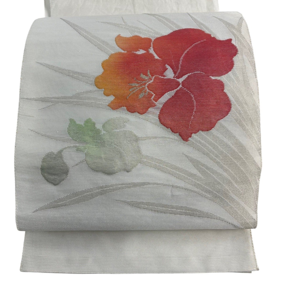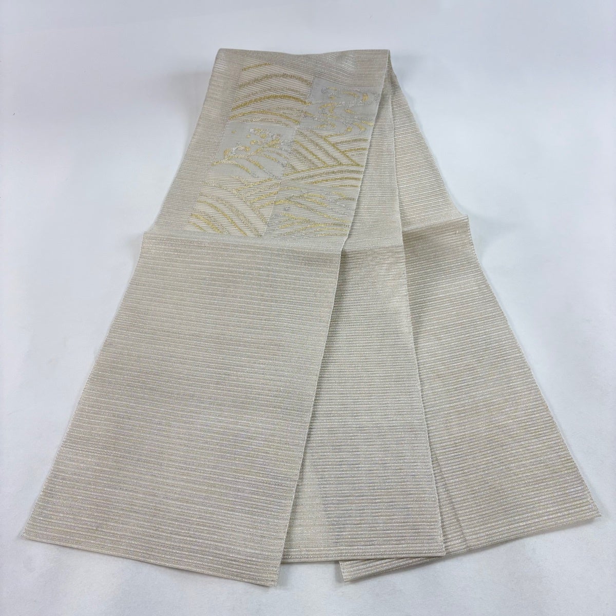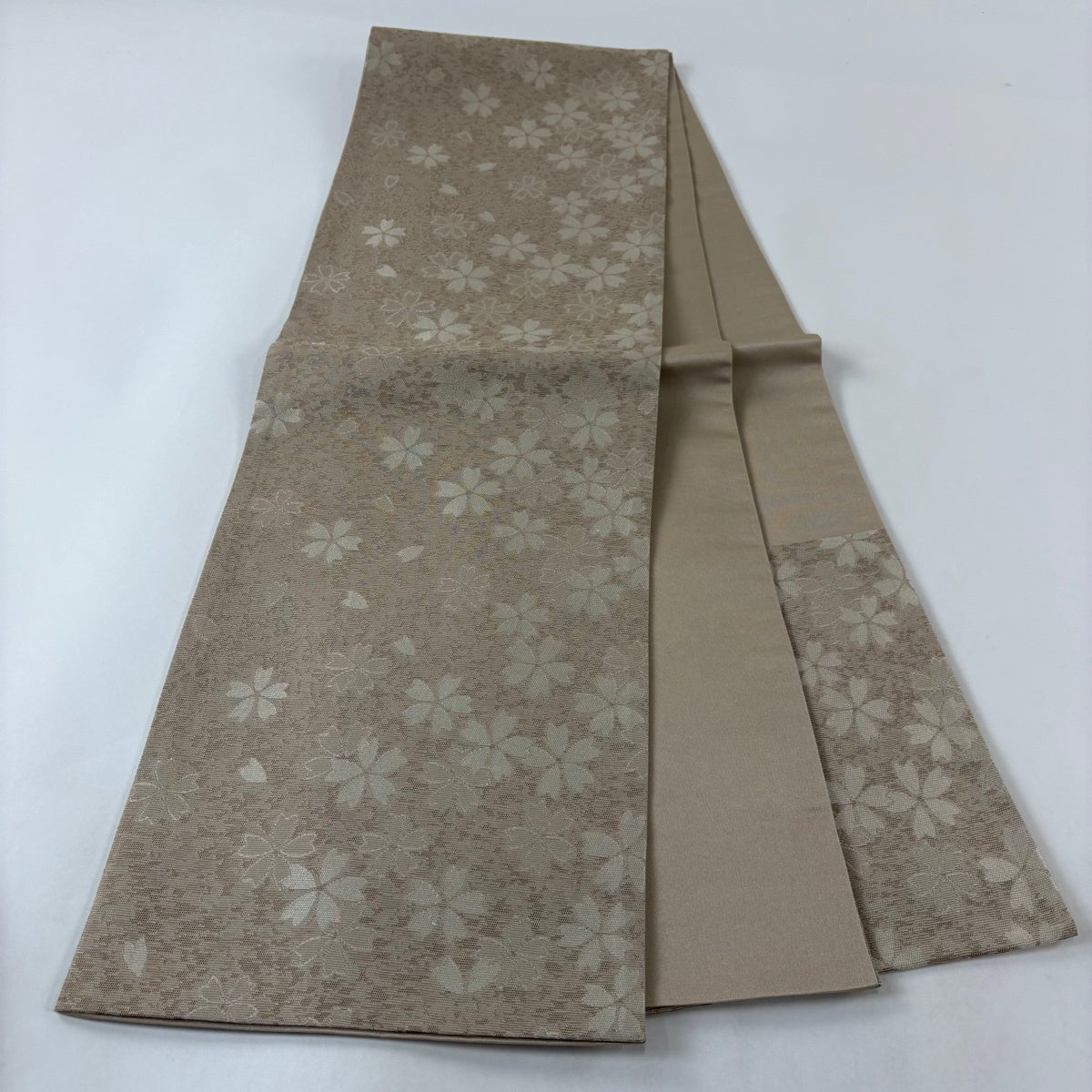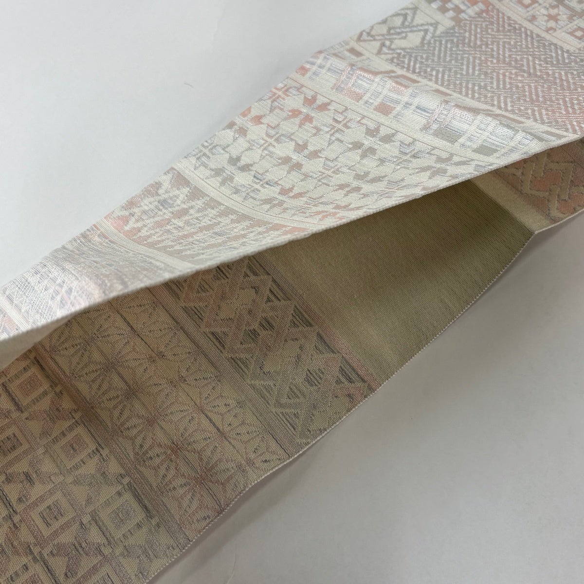 帯の格は着物とは逆で染よりも織のほうが格式が高く、名古屋帯は袋帯よりも格が低く様々な技法や生地で作成されているため組み合わせ数も多く場面によって使い分けることでセミフォーマルからカジュアルまで幅広く着用する事ができる帯です。 名古屋帯の名前の由来は名古屋の女学校の先生が考案したと言われるため名古屋帯という名前で呼ばれるようになりました。 形状はお太鼓部分までは通常の帯幅ですがそれ以降は幅が半分になっていることが多く、袋帯よりも短い作りになっているため一重太鼓でしか結ぶ事ができません。