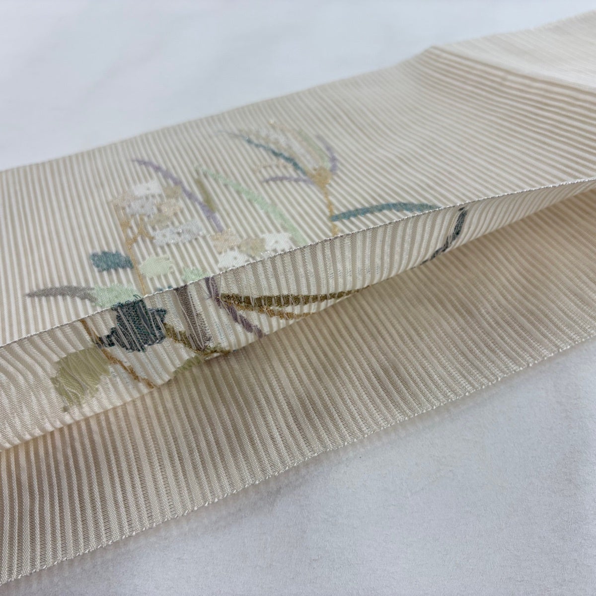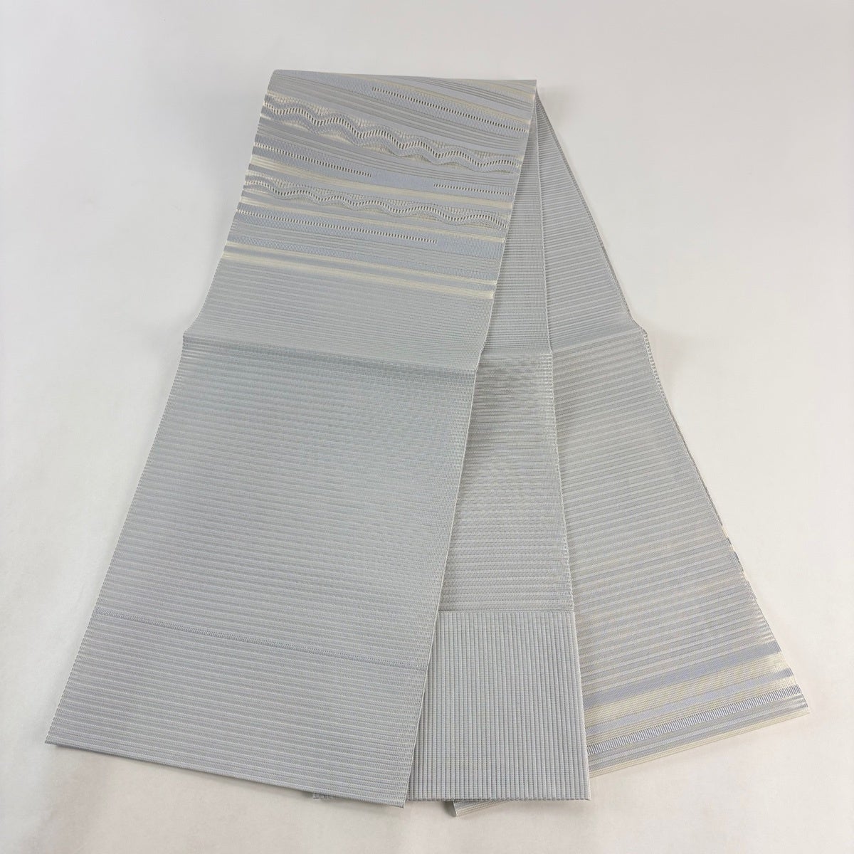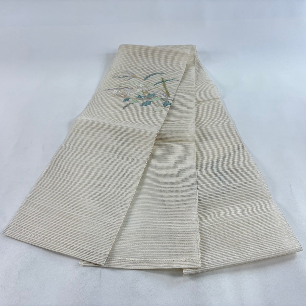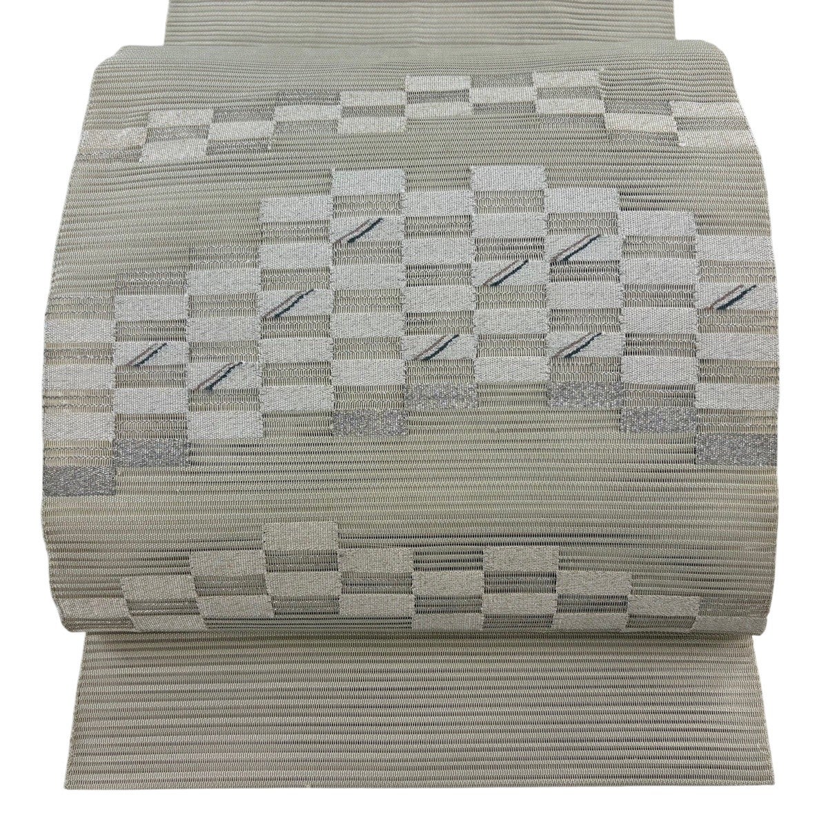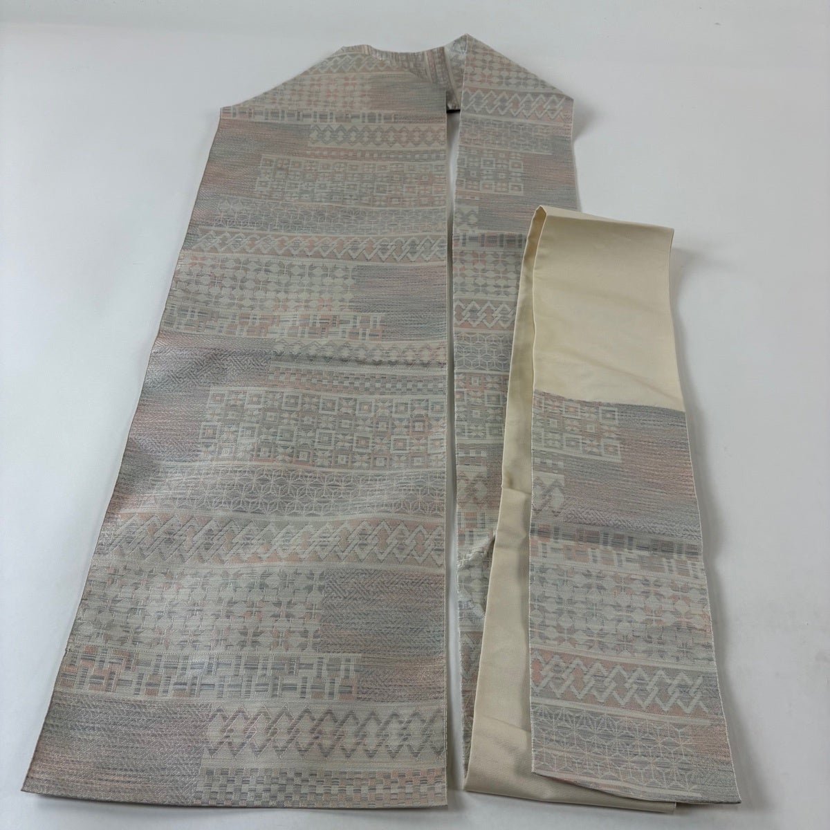 帯の格は着物とは逆で染よりも織のほうが格式が高く、名古屋帯は袋帯よりも格が低く様々な技法や生地で作成されているため組み合わせ数も多く場面によって使い分けることでセミフォーマルからカジュアルまで幅広く着用する事ができる帯です。 名古屋帯の名前の由来は名古屋の女学校の先生が考案したと言われるため名古屋帯という名前で呼ばれるようになりました。 形状はお太鼓部分までは通常の帯幅ですがそれ以降は幅が半分になっていることが多く、袋帯よりも短い作りになっているため一重太鼓でしか結ぶ事ができません。