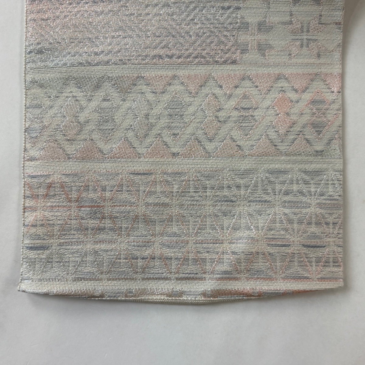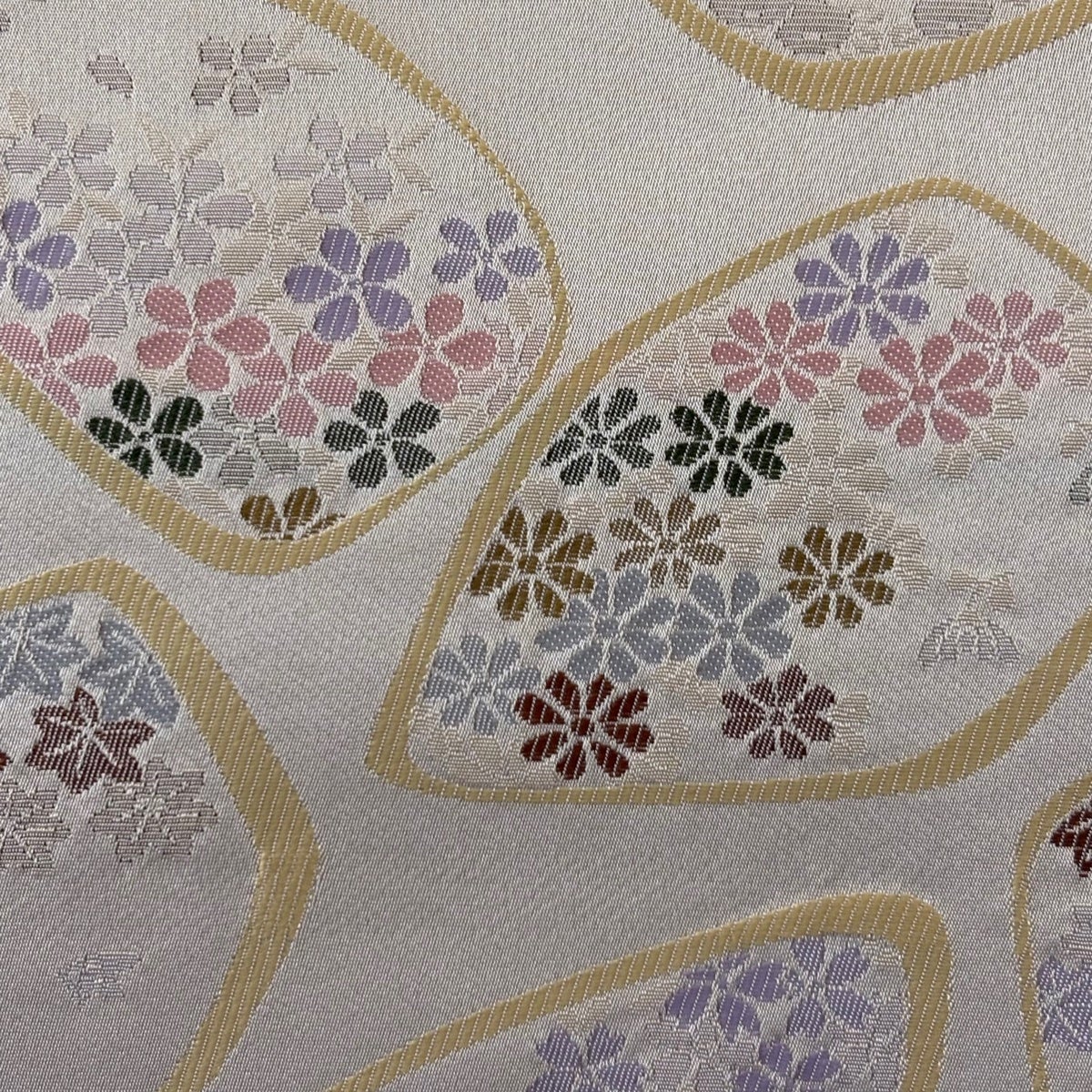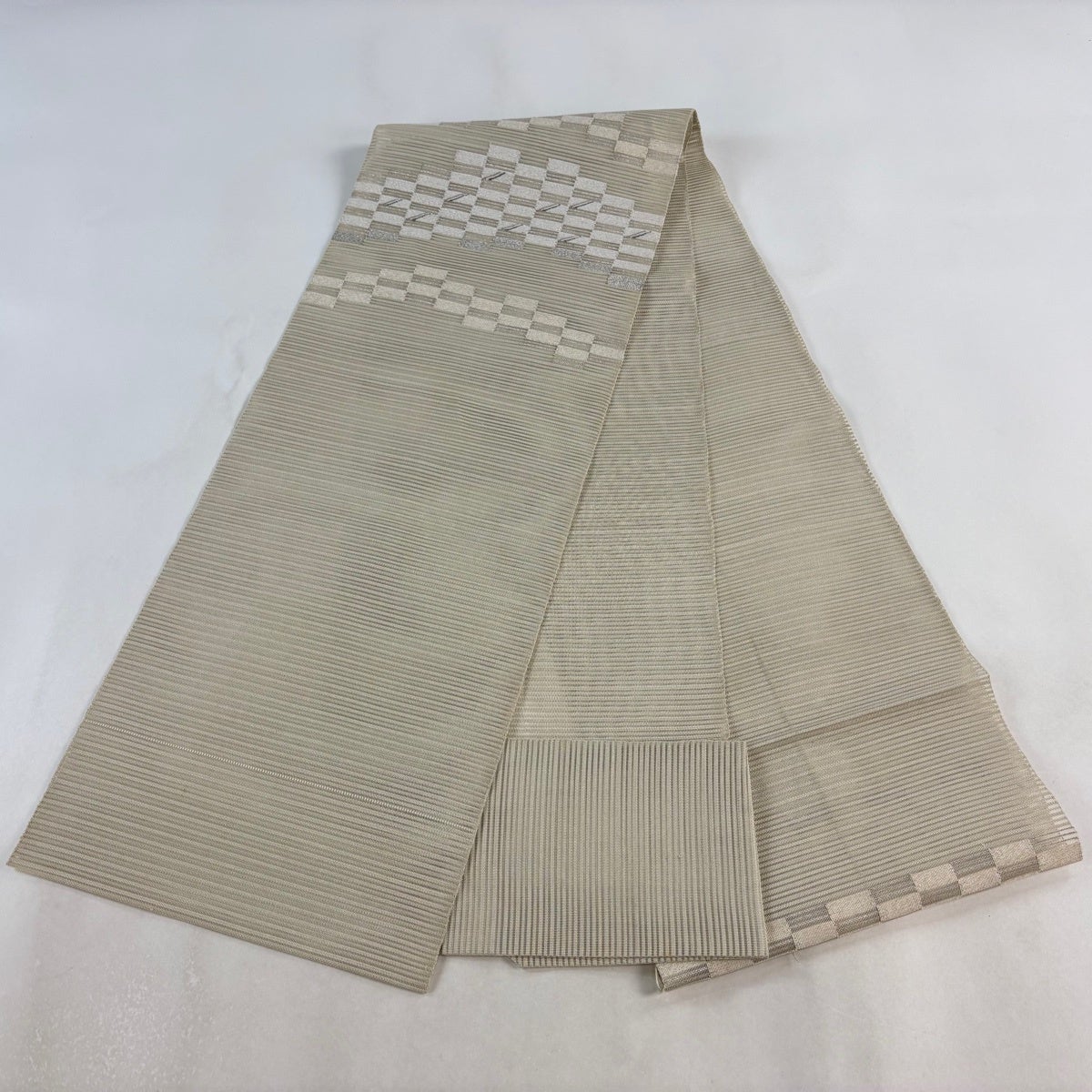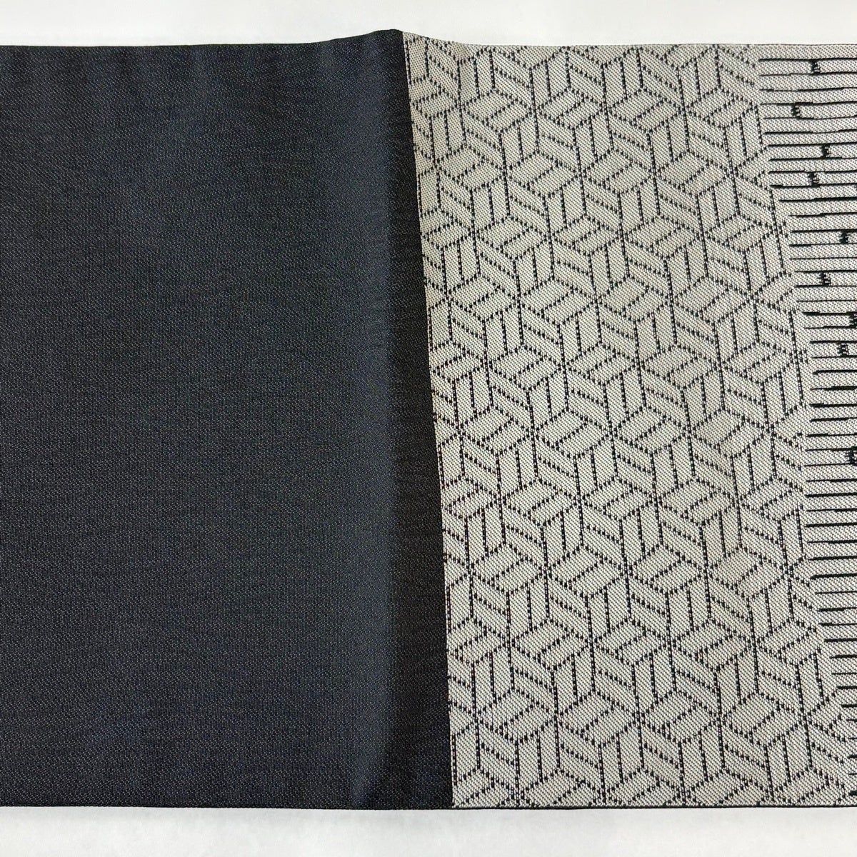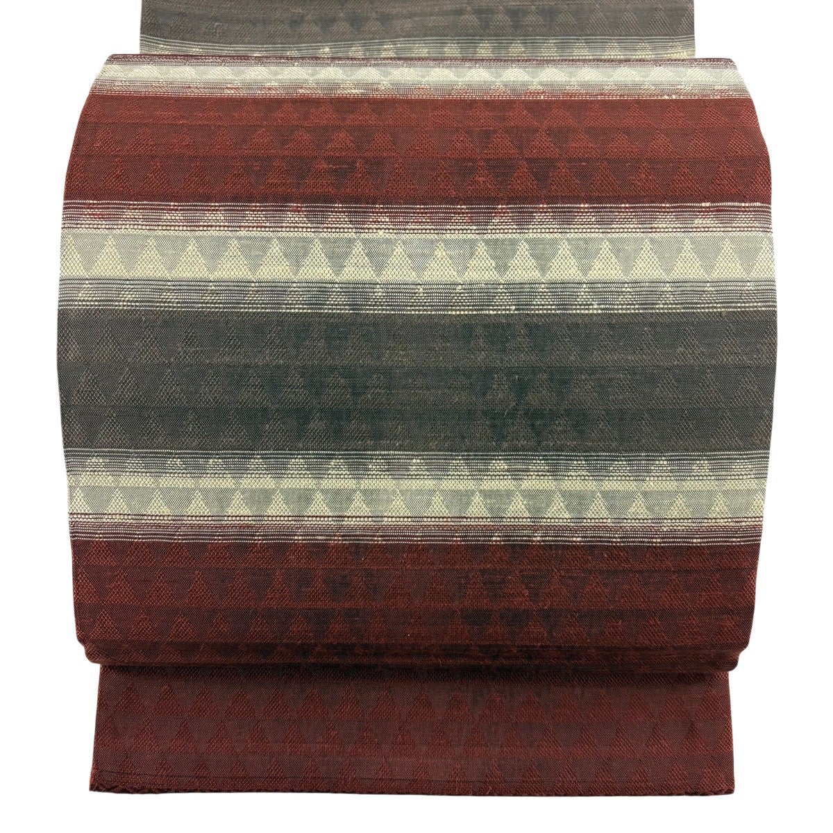 帯の格は着物とは逆で染よりも織のほうが格式が高く、名古屋帯は袋帯よりも格が低く様々な技法や生地で作成されているため組み合わせ数も多く場面によって使い分けることでセミフォーマルからカジュアルまで幅広く着用する事ができる帯です。 名古屋帯の名前の由来は名古屋の女学校の先生が考案したと言われるため名古屋帯という名前で呼ばれるようになりました。 形状はお太鼓部分までは通常の帯幅ですがそれ以降は幅が半分になっていることが多く、袋帯よりも短い作りになっているため一重太鼓でしか結ぶ事ができません。