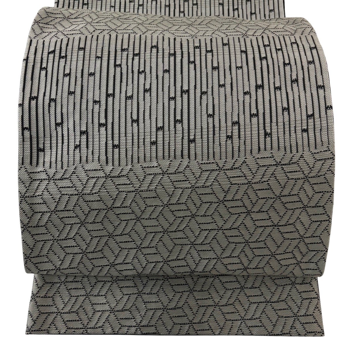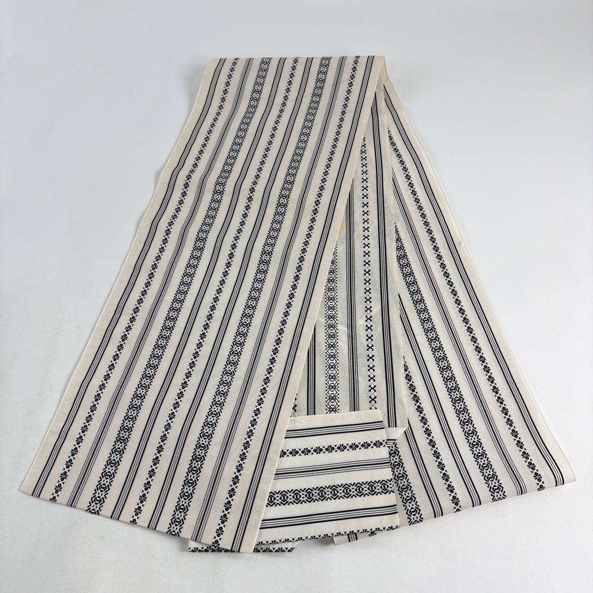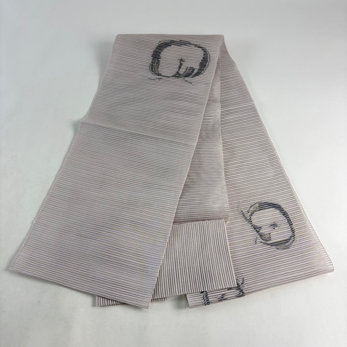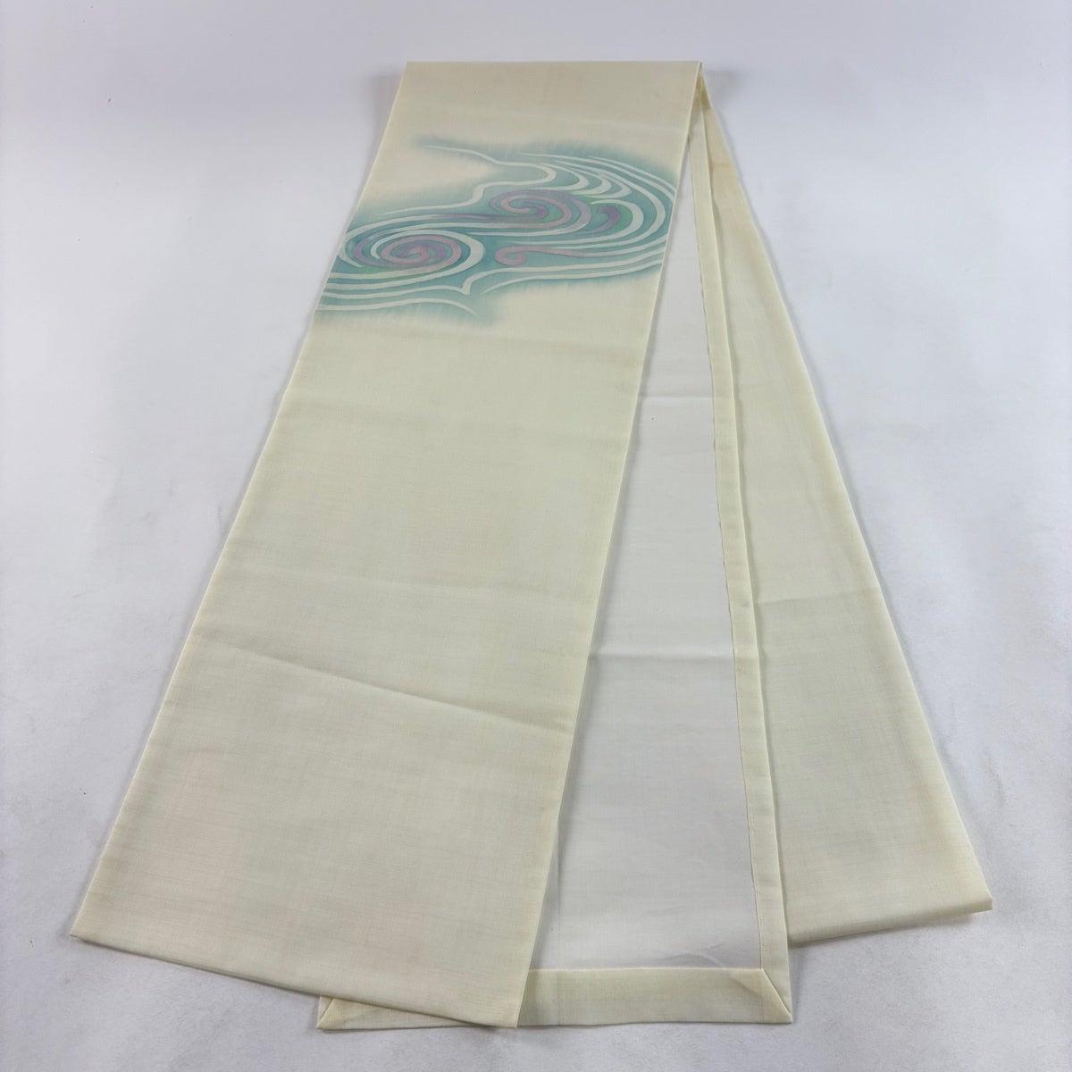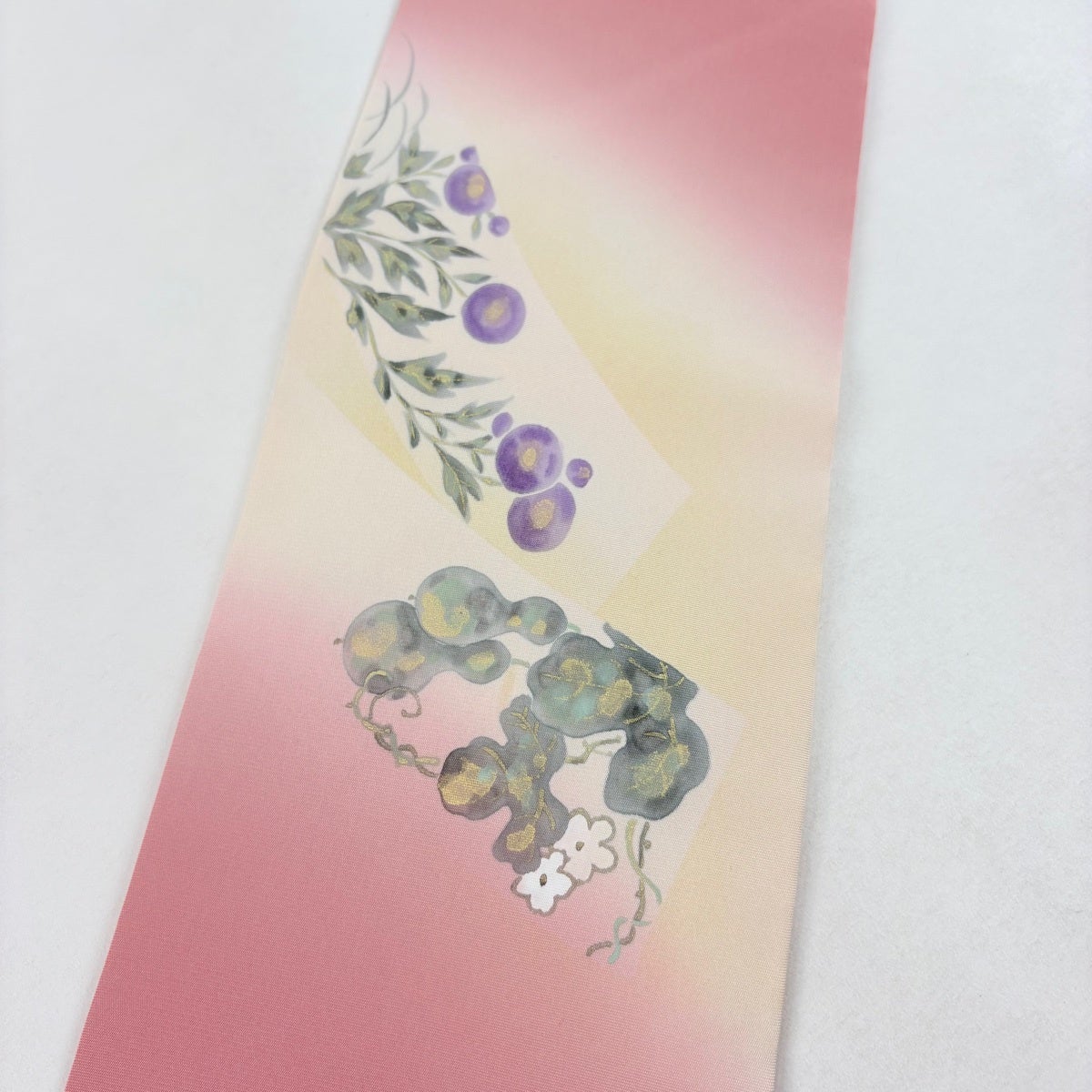 帯の格は着物とは逆で染よりも織のほうが格式が高く、名古屋帯は袋帯よりも格が低く様々な技法や生地で作成されているため組み合わせ数も多く場面によって使い分けることでセミフォーマルからカジュアルまで幅広く着用する事ができる帯です。 名古屋帯の名前の由来は名古屋の女学校の先生が考案したと言われるため名古屋帯という名前で呼ばれるようになりました。 形状はお太鼓部分までは通常の帯幅ですがそれ以降は幅が半分になっていることが多く、袋帯よりも短い作りになっているため一重太鼓でしか結ぶ事ができません。