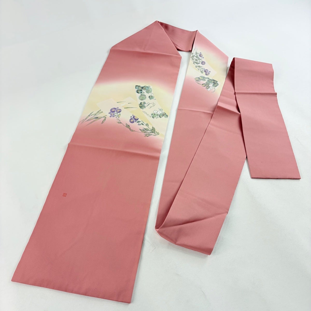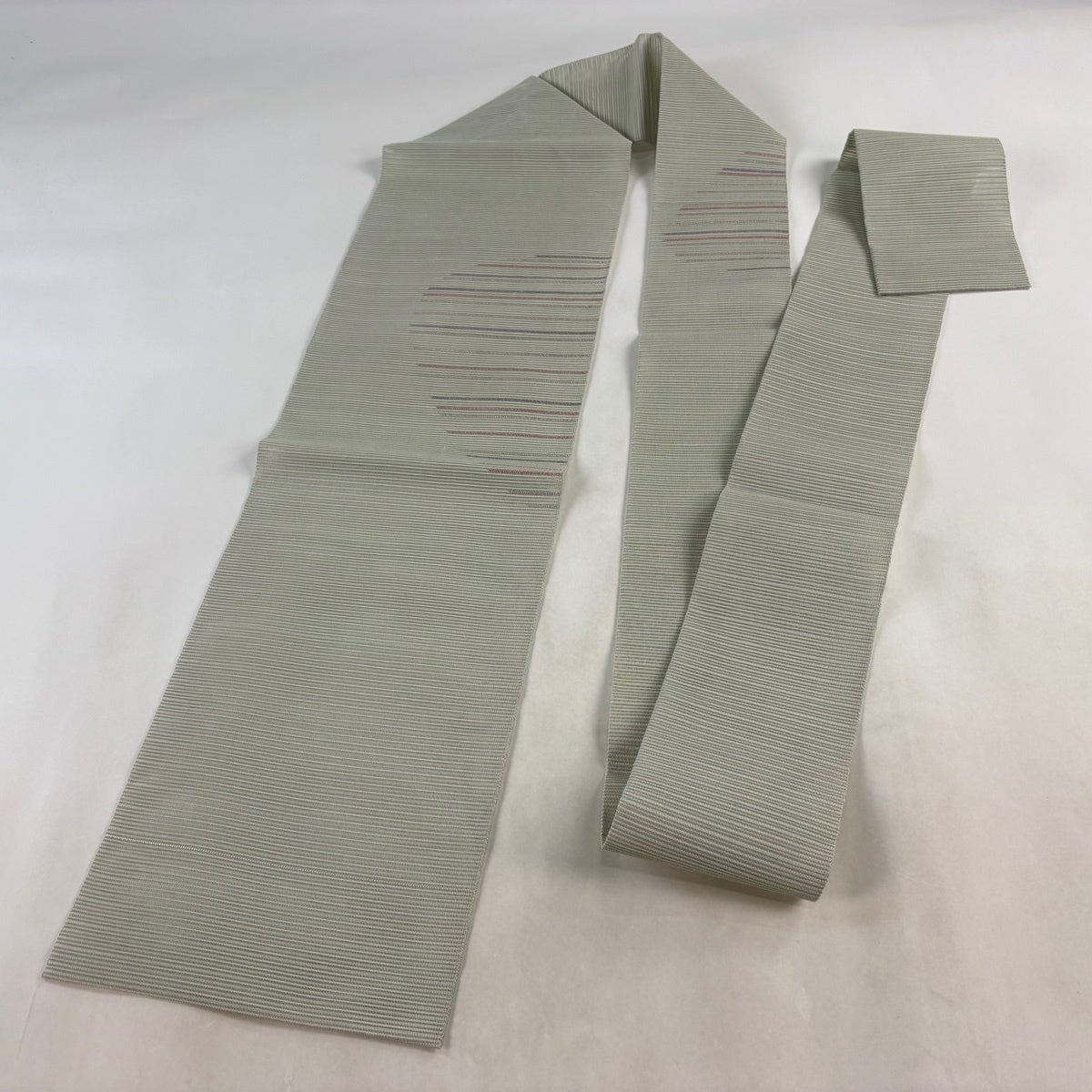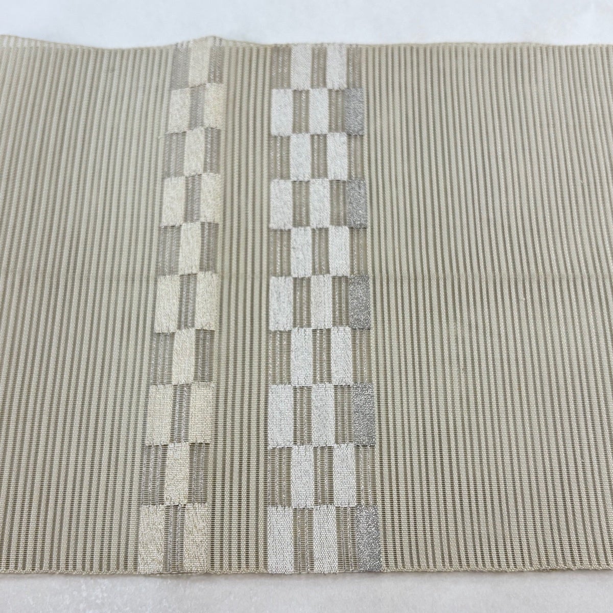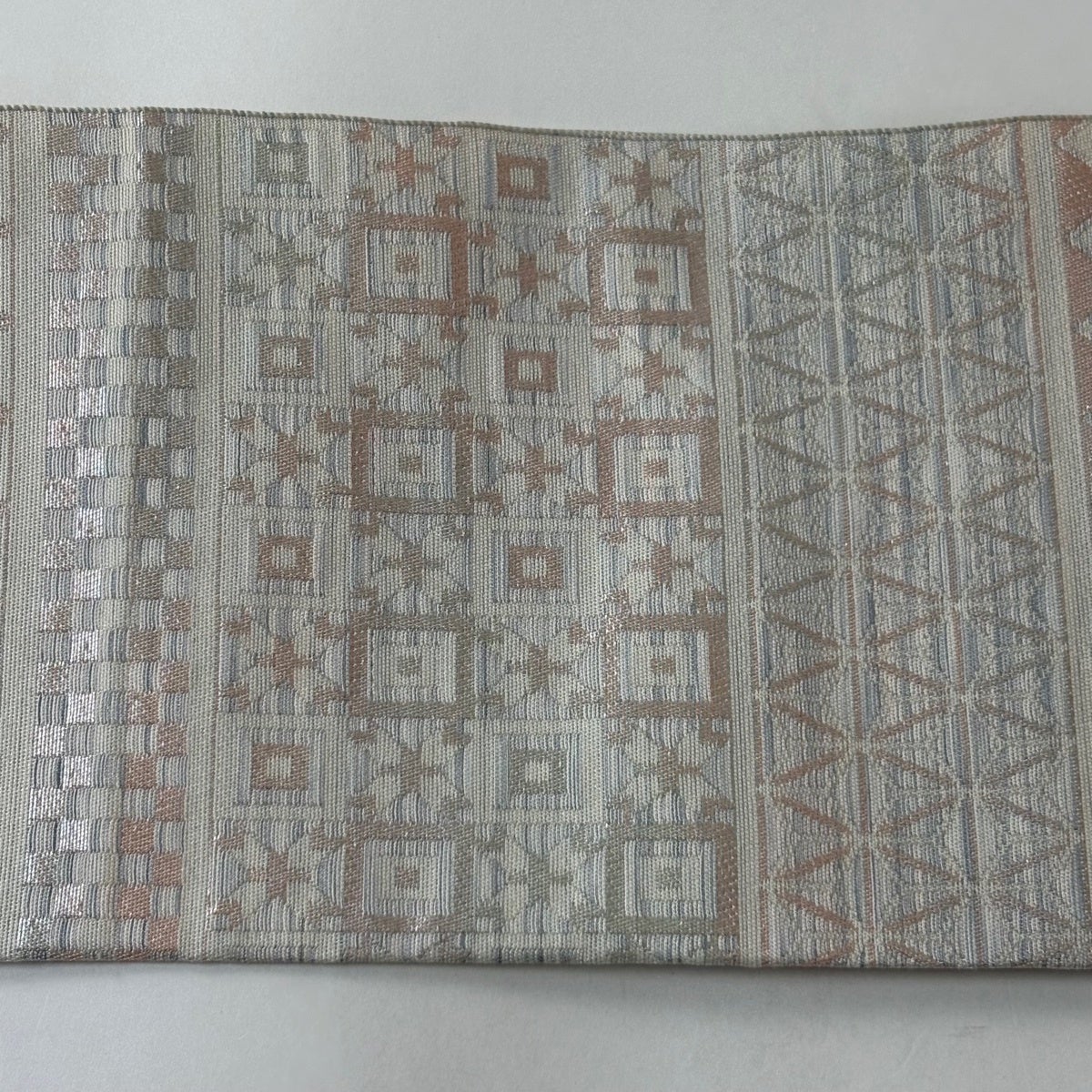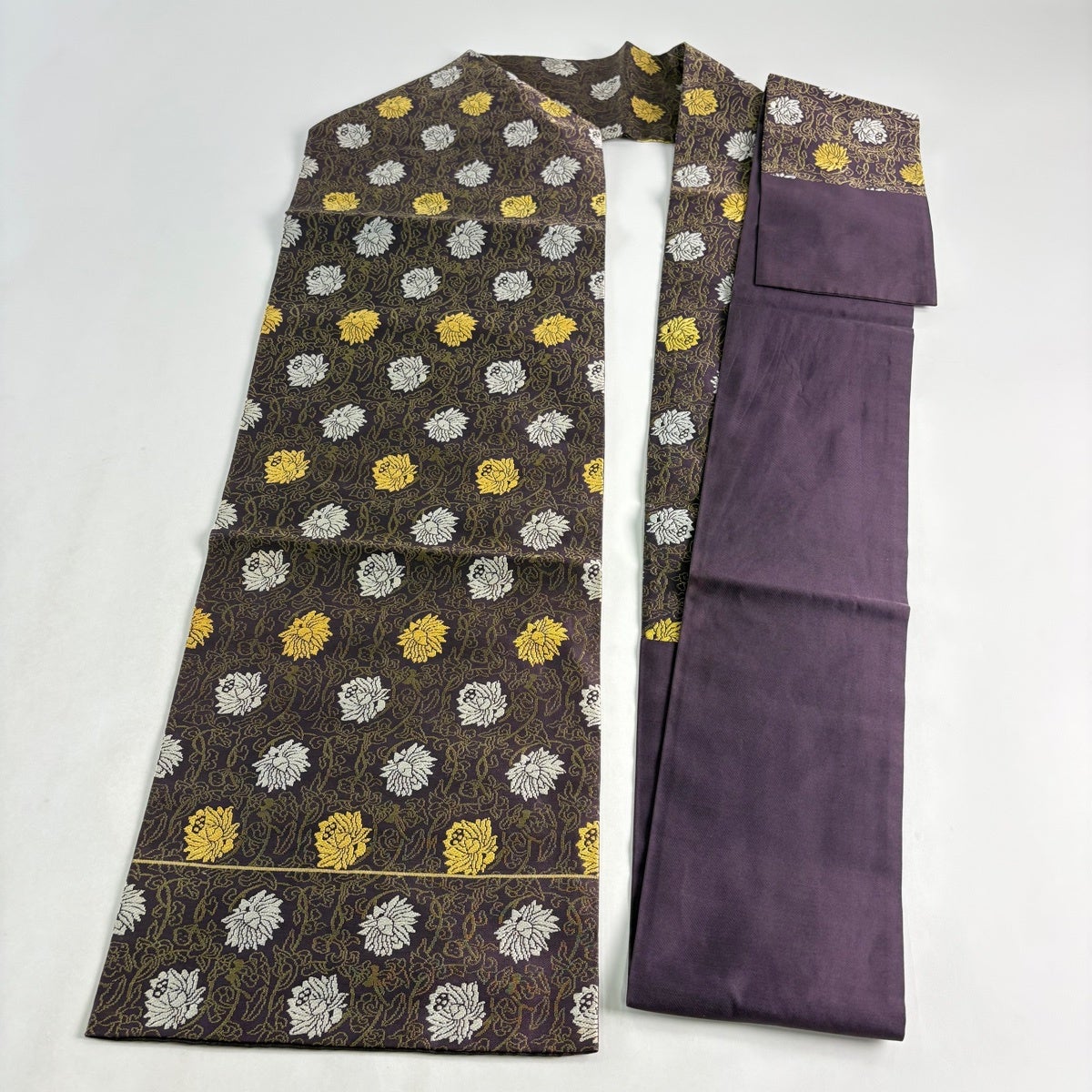 帯の格は着物とは逆で染よりも織のほうが格式が高く、名古屋帯は袋帯よりも格が低く様々な技法や生地で作成されているため組み合わせ数も多く場面によって使い分けることでセミフォーマルからカジュアルまで幅広く着用する事ができる帯です。 名古屋帯の名前の由来は名古屋の女学校の先生が考案したと言われるため名古屋帯という名前で呼ばれるようになりました。 形状はお太鼓部分までは通常の帯幅ですがそれ以降は幅が半分になっていることが多く、袋帯よりも短い作りになっているため一重太鼓でしか結ぶ事ができません。