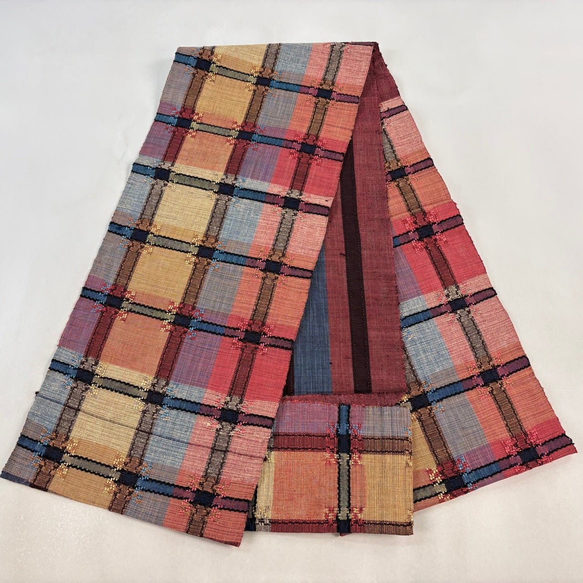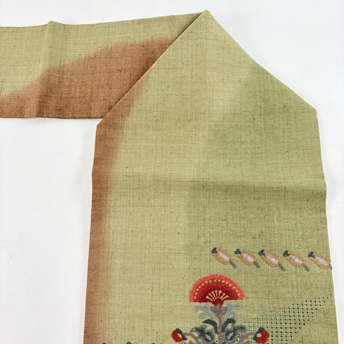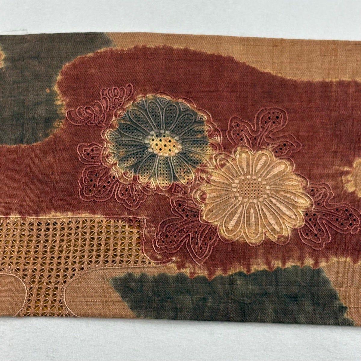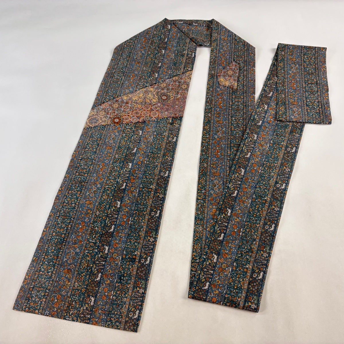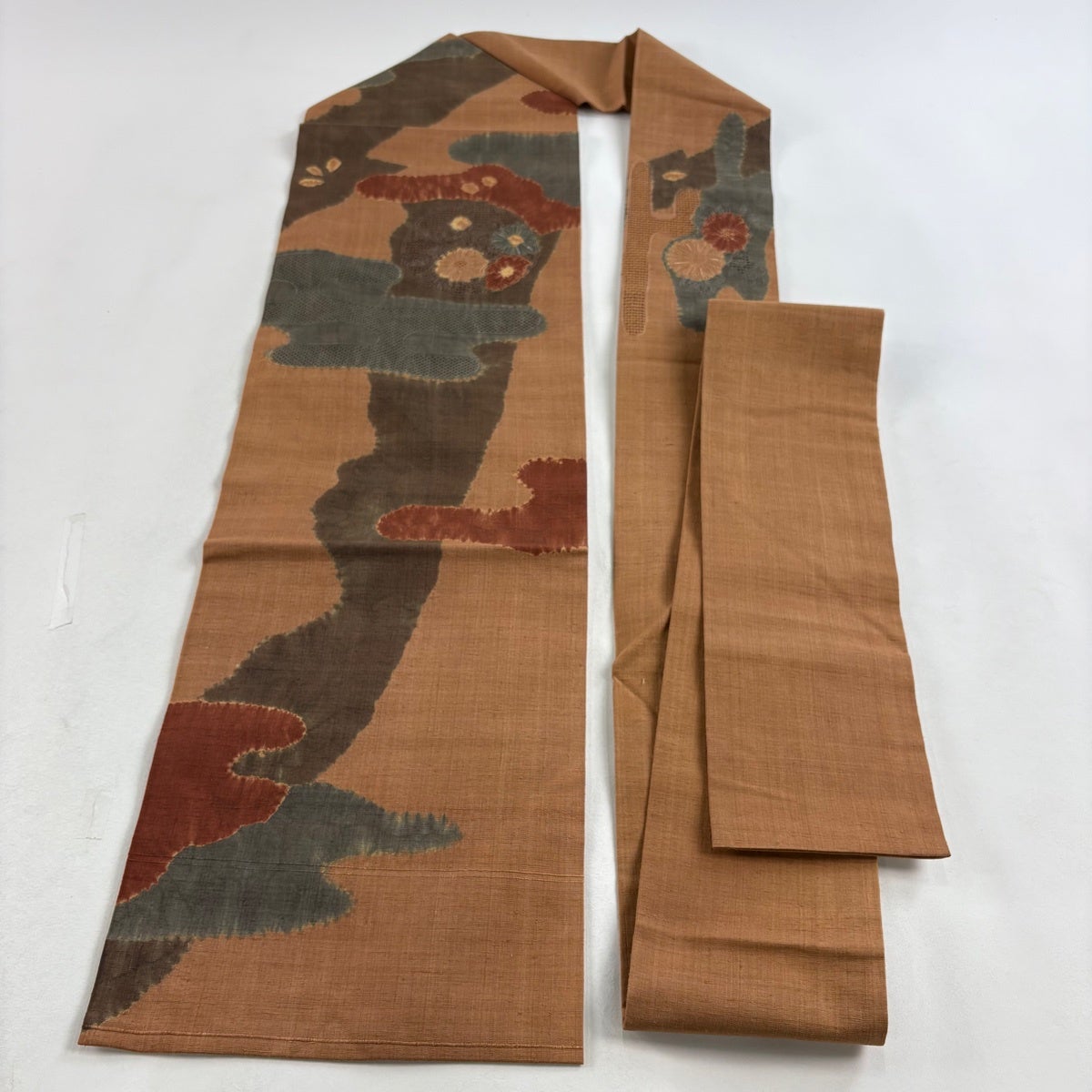 帯の格は着物とは逆で染よりも織のほうが格式が高く、名古屋帯は袋帯よりも格が低く様々な技法や生地で作成されているため組み合わせ数も多く場面によって使い分けることでセミフォーマルからカジュアルまで幅広く着用する事ができる帯です。 名古屋帯の名前の由来は名古屋の女学校の先生が考案したと言われるため名古屋帯という名前で呼ばれるようになりました。 形状はお太鼓部分までは通常の帯幅ですがそれ以降は幅が半分になっていることが多く、袋帯よりも短い作りになっているため一重太鼓でしか結ぶ事ができません。