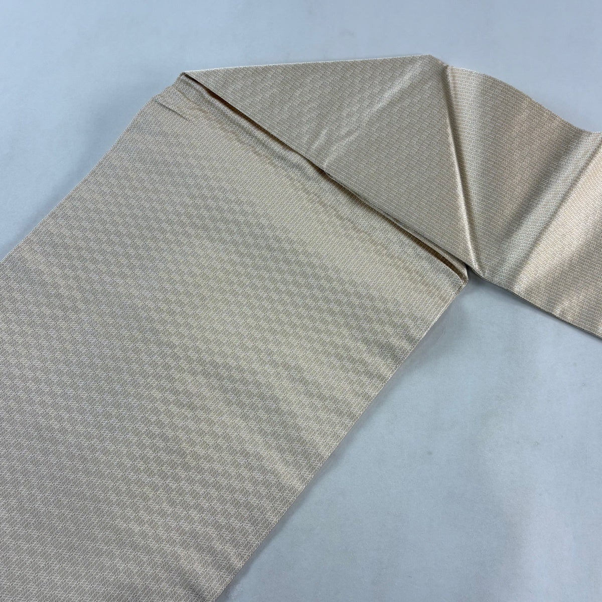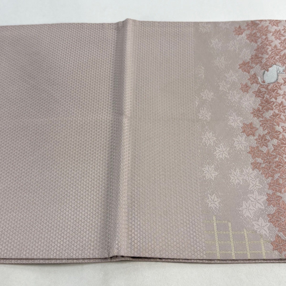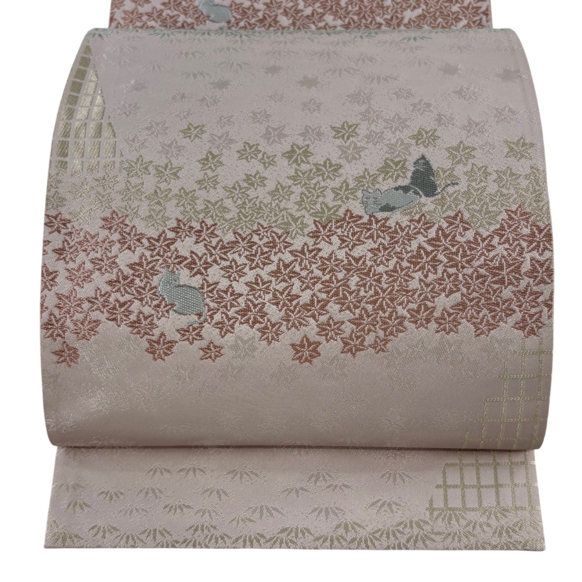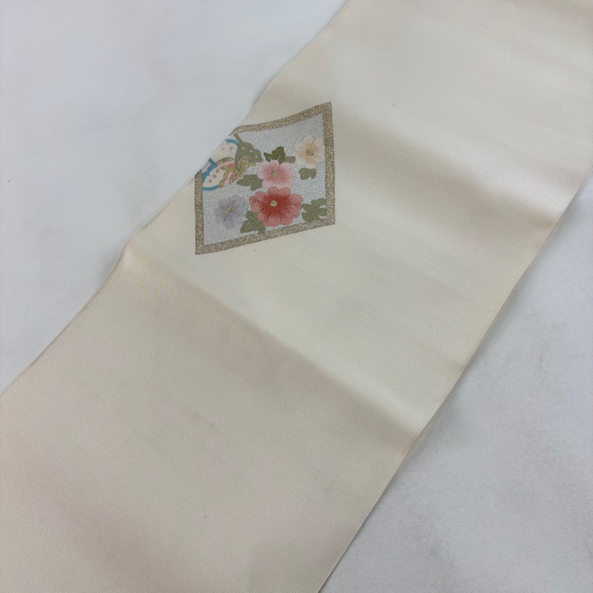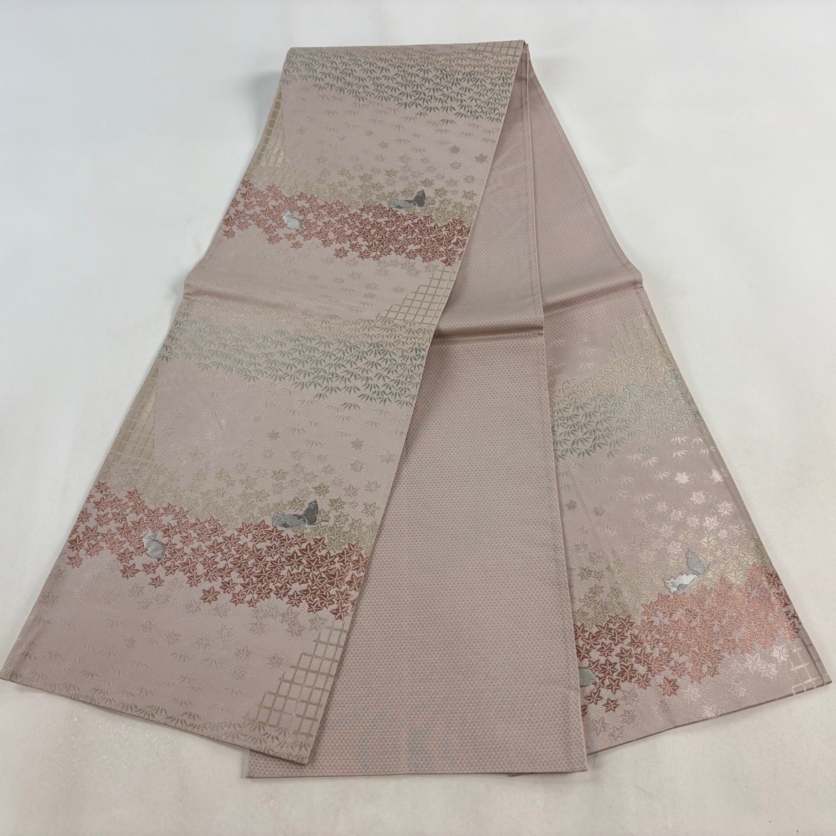 帯の格は着物とは逆で染よりも織のほうが格式が高く、名古屋帯は袋帯よりも格が低く様々な技法や生地で作成されているため組み合わせ数も多く場面によって使い分けることでセミフォーマルからカジュアルまで幅広く着用する事ができる帯です。 名古屋帯の名前の由来は名古屋の女学校の先生が考案したと言われるため名古屋帯という名前で呼ばれるようになりました。 形状はお太鼓部分までは通常の帯幅ですがそれ以降は幅が半分になっていることが多く、袋帯よりも短い作りになっているため一重太鼓でしか結ぶ事ができません。