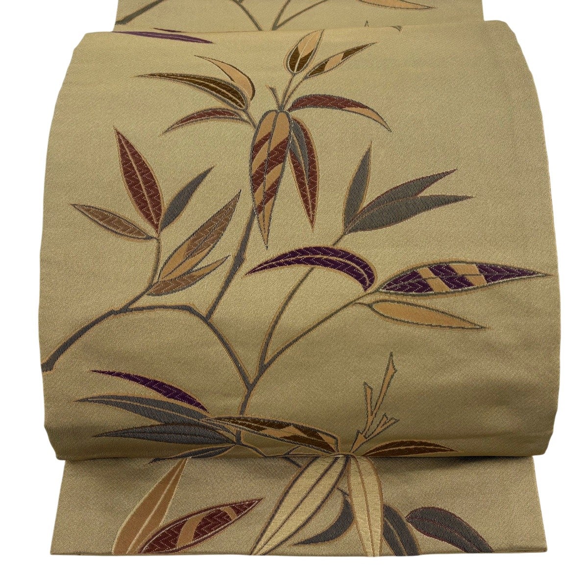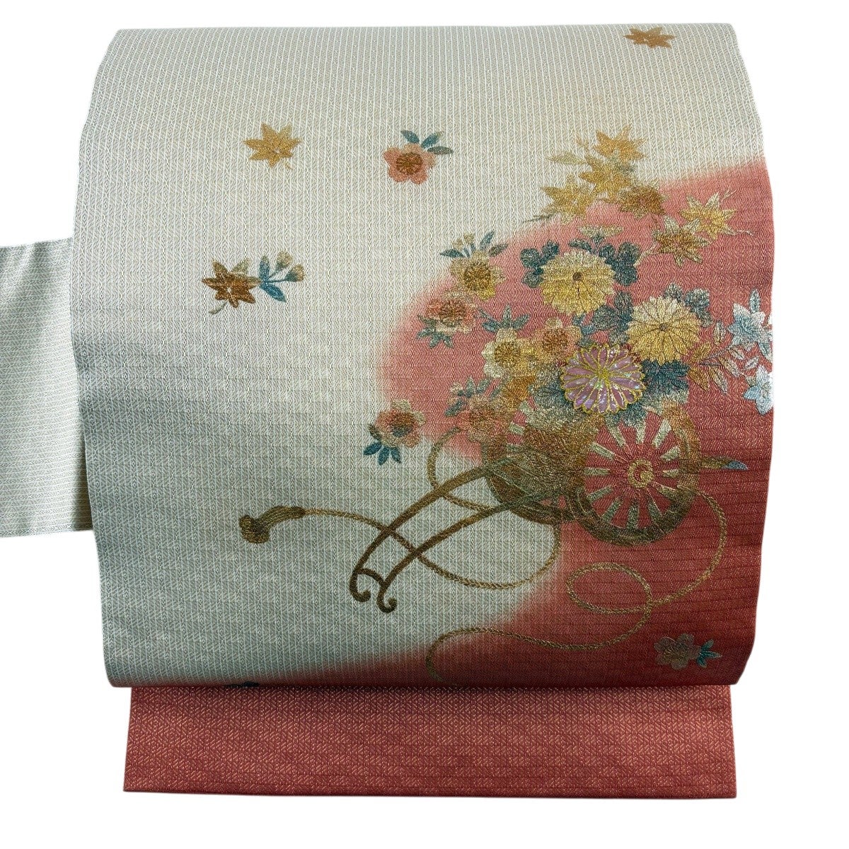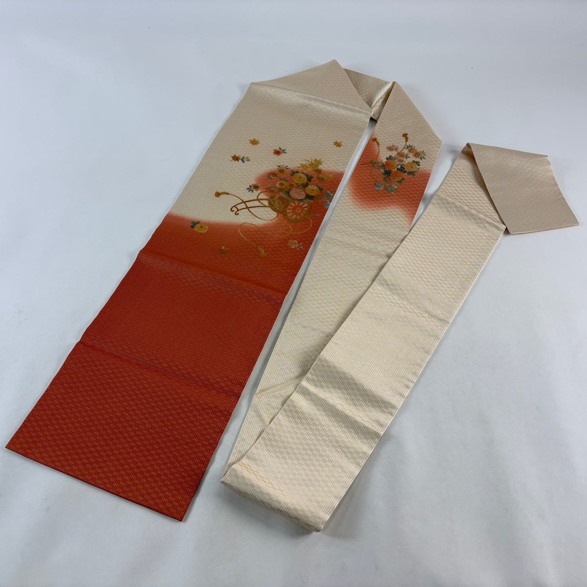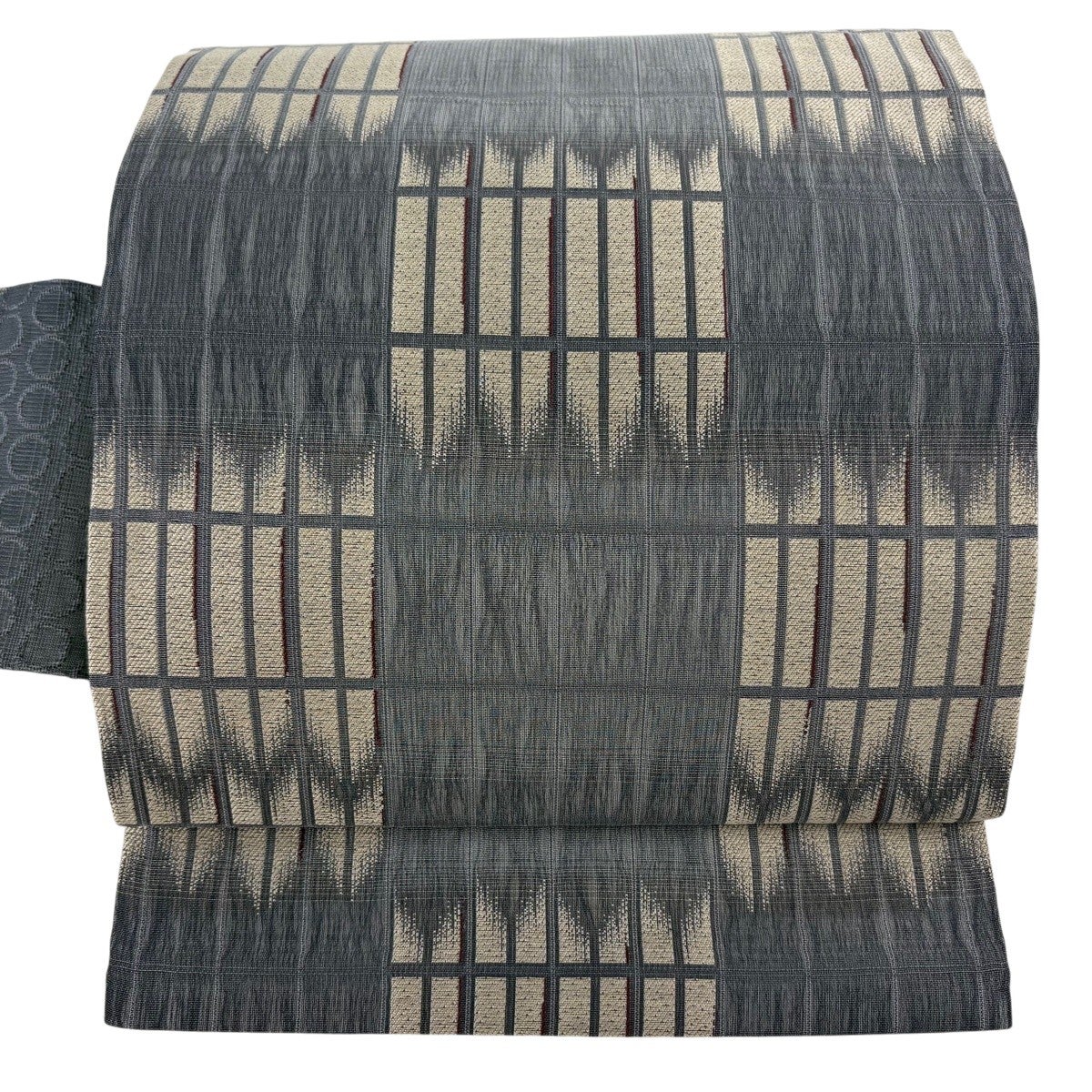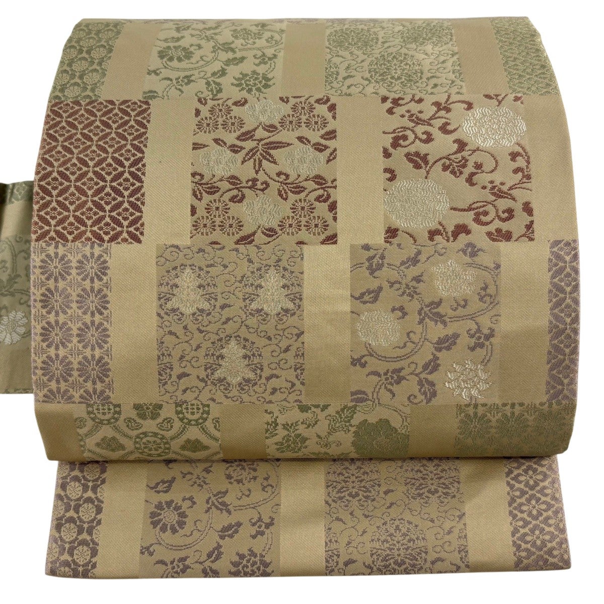 帯の格は着物とは逆で染よりも織のほうが格式が高く、名古屋帯は袋帯よりも格が低く様々な技法や生地で作成されているため組み合わせ数も多く場面によって使い分けることでセミフォーマルからカジュアルまで幅広く着用する事ができる帯です。 名古屋帯の名前の由来は名古屋の女学校の先生が考案したと言われるため名古屋帯という名前で呼ばれるようになりました。 形状はお太鼓部分までは通常の帯幅ですがそれ以降は幅が半分になっていることが多く、袋帯よりも短い作りになっているため一重太鼓でしか結ぶ事ができません。