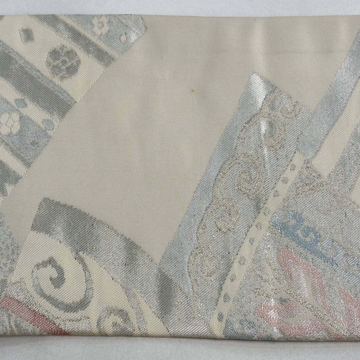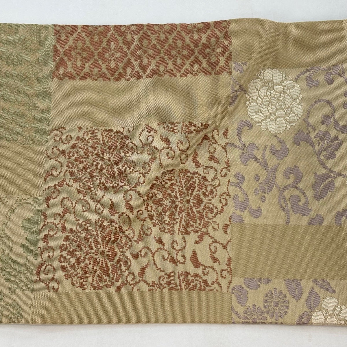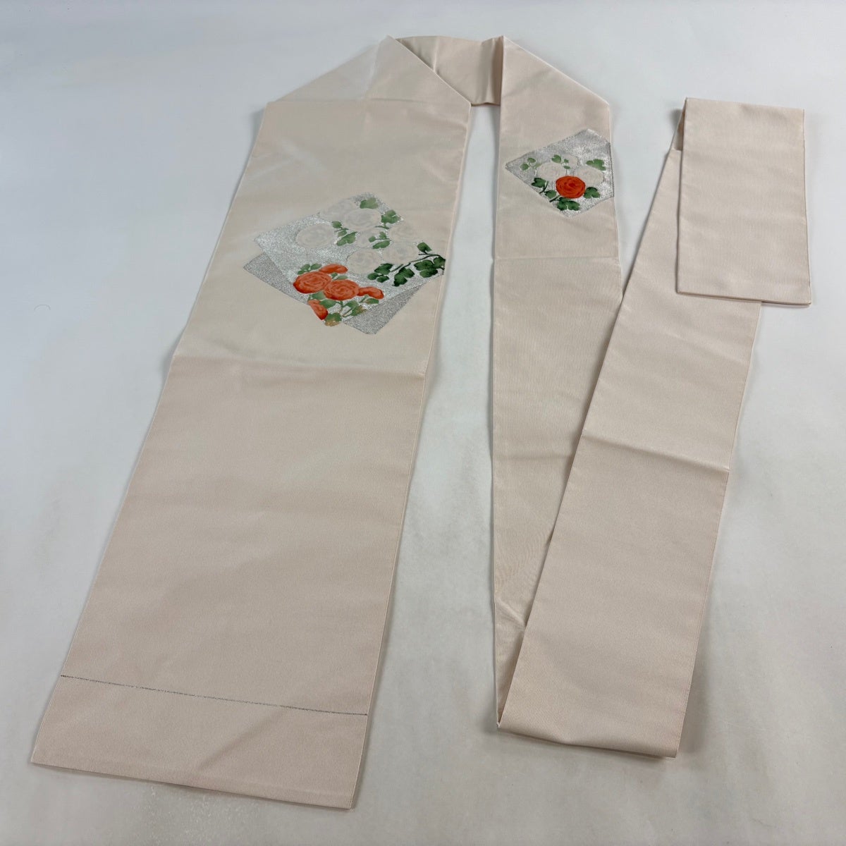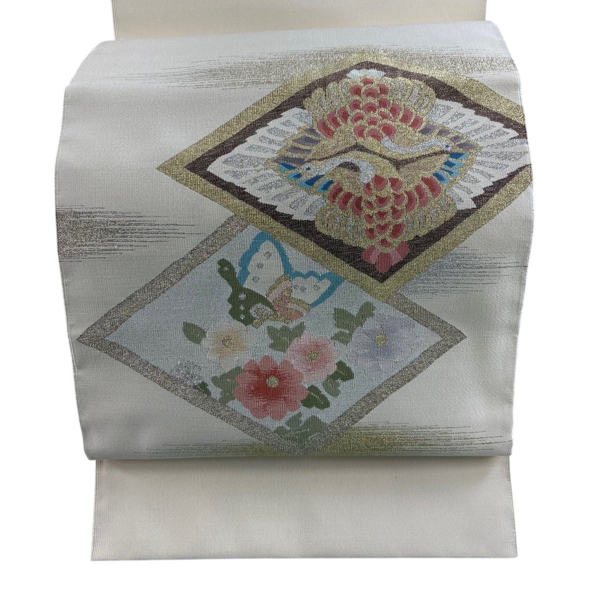 帯の格は着物とは逆で染よりも織のほうが格式が高く、名古屋帯は袋帯よりも格が低く様々な技法や生地で作成されているため組み合わせ数も多く場面によって使い分けることでセミフォーマルからカジュアルまで幅広く着用する事ができる帯です。 名古屋帯の名前の由来は名古屋の女学校の先生が考案したと言われるため名古屋帯という名前で呼ばれるようになりました。 形状はお太鼓部分までは通常の帯幅ですがそれ以降は幅が半分になっていることが多く、袋帯よりも短い作りになっているため一重太鼓でしか結ぶ事ができません。