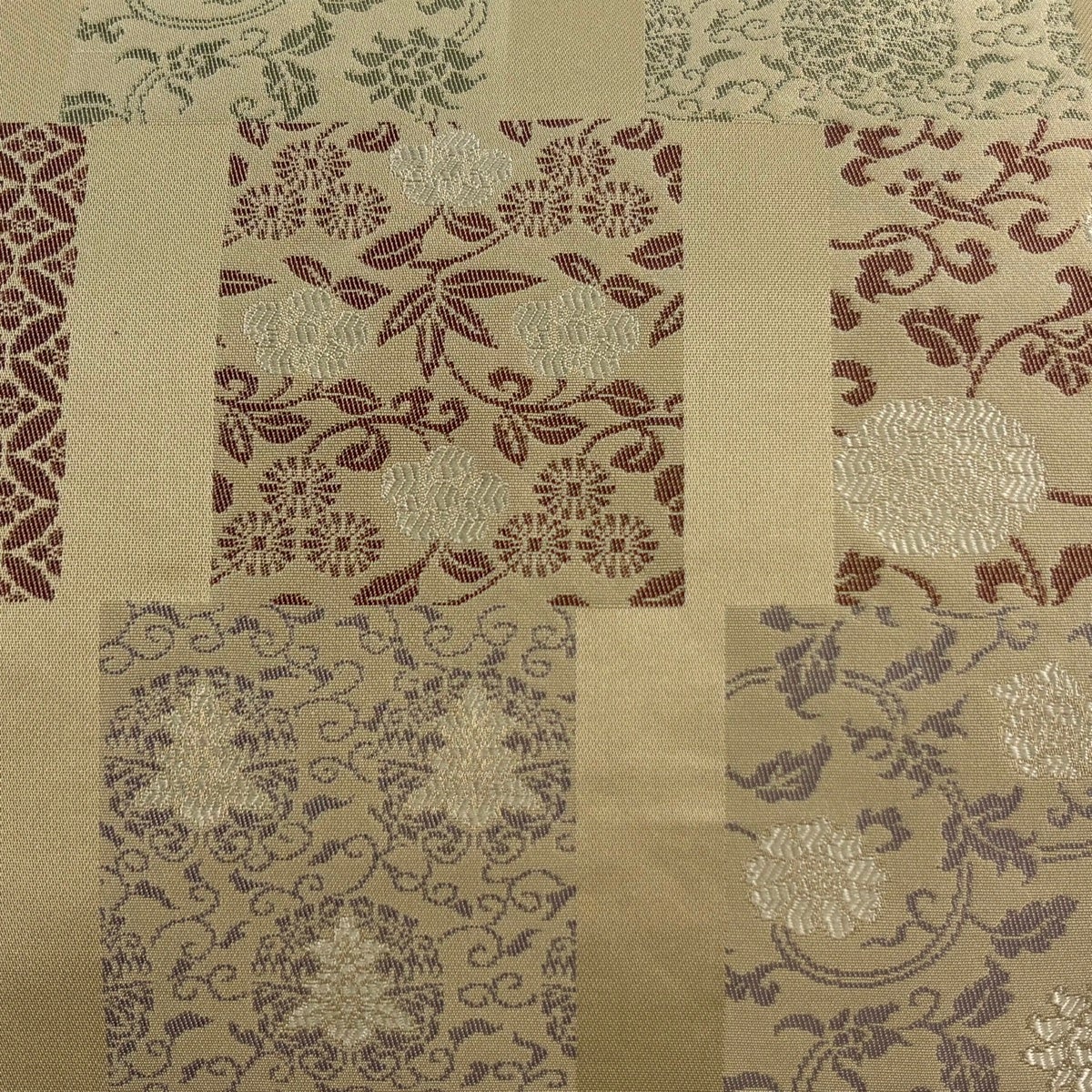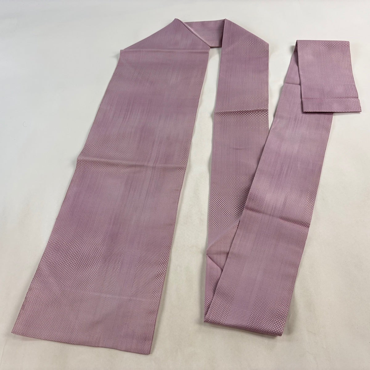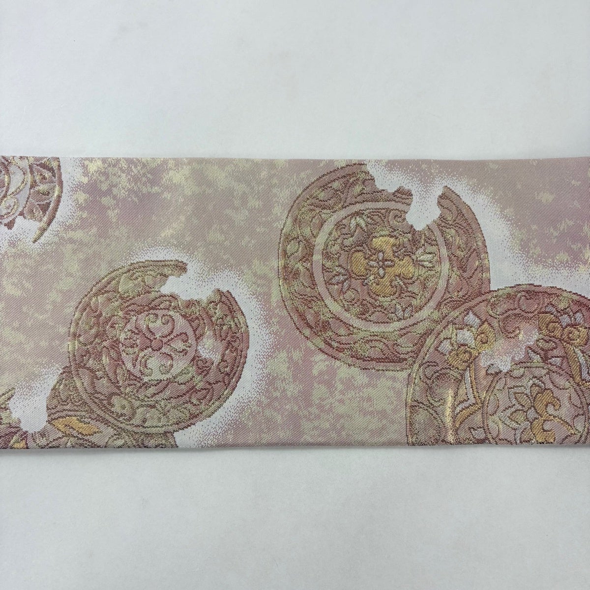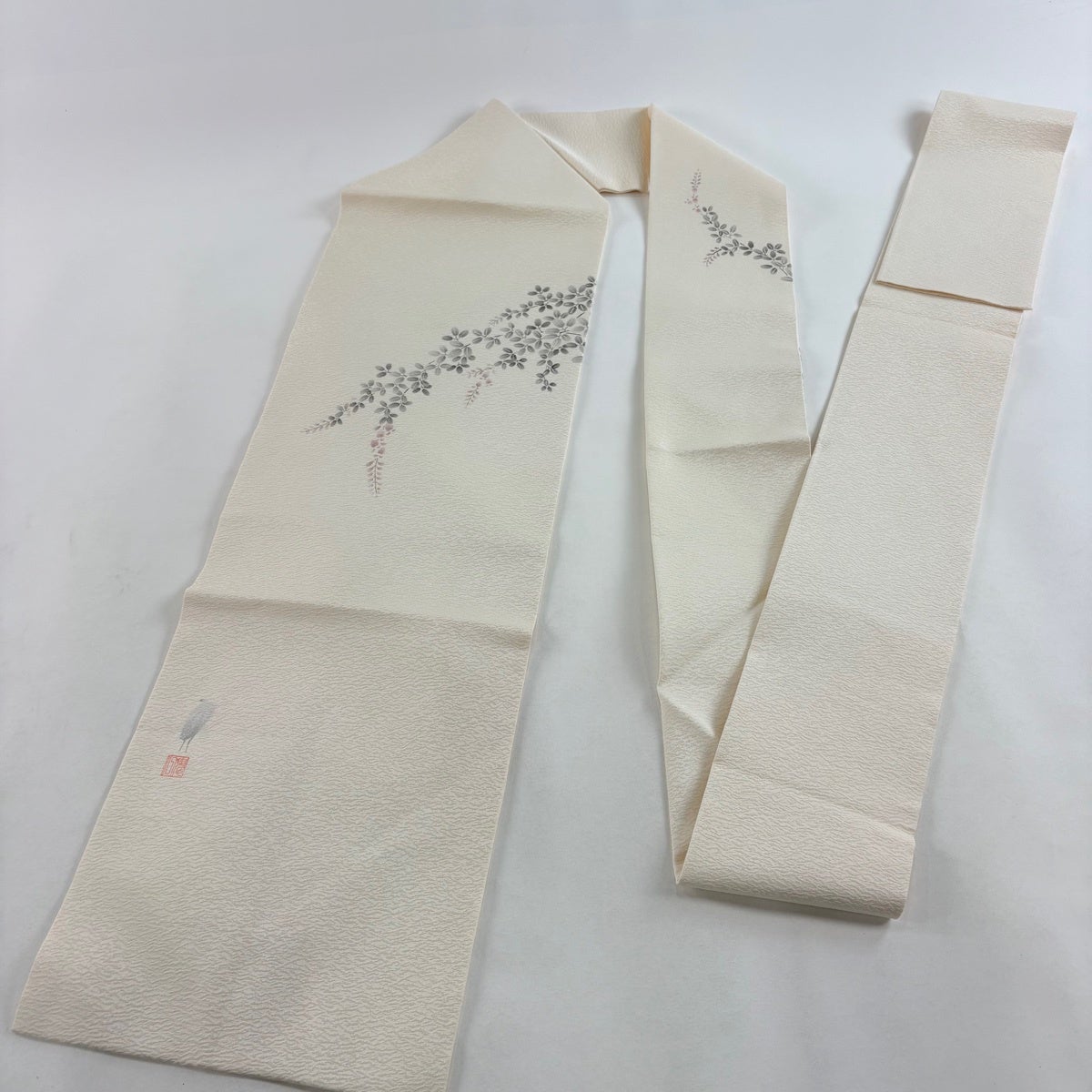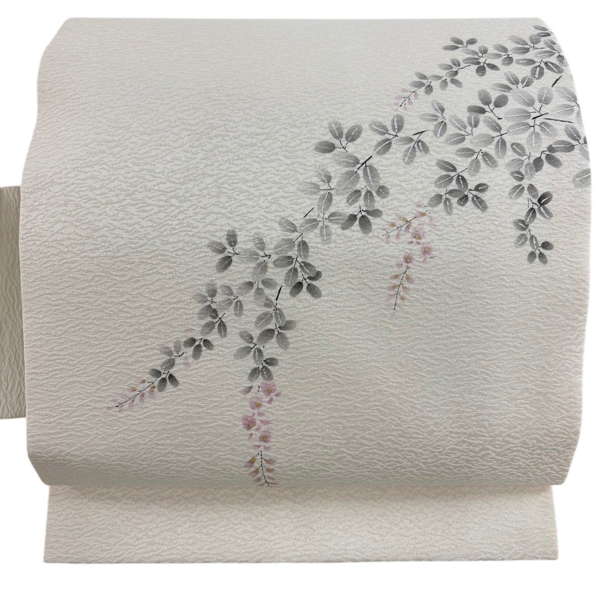 帯の格は着物とは逆で染よりも織のほうが格式が高く、名古屋帯は袋帯よりも格が低く様々な技法や生地で作成されているため組み合わせ数も多く場面によって使い分けることでセミフォーマルからカジュアルまで幅広く着用する事ができる帯です。 名古屋帯の名前の由来は名古屋の女学校の先生が考案したと言われるため名古屋帯という名前で呼ばれるようになりました。 形状はお太鼓部分までは通常の帯幅ですがそれ以降は幅が半分になっていることが多く、袋帯よりも短い作りになっているため一重太鼓でしか結ぶ事ができません。