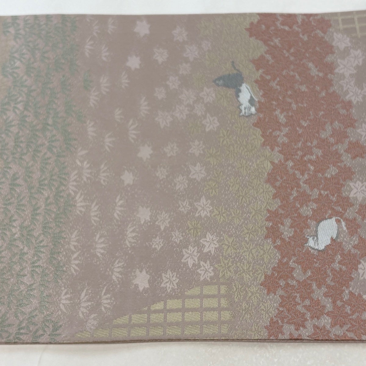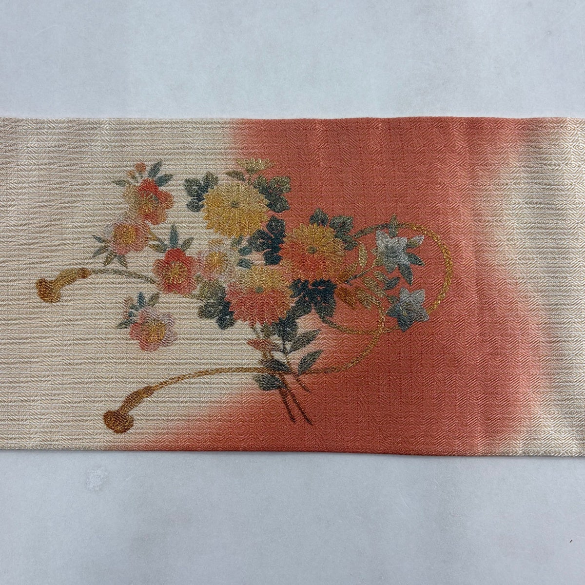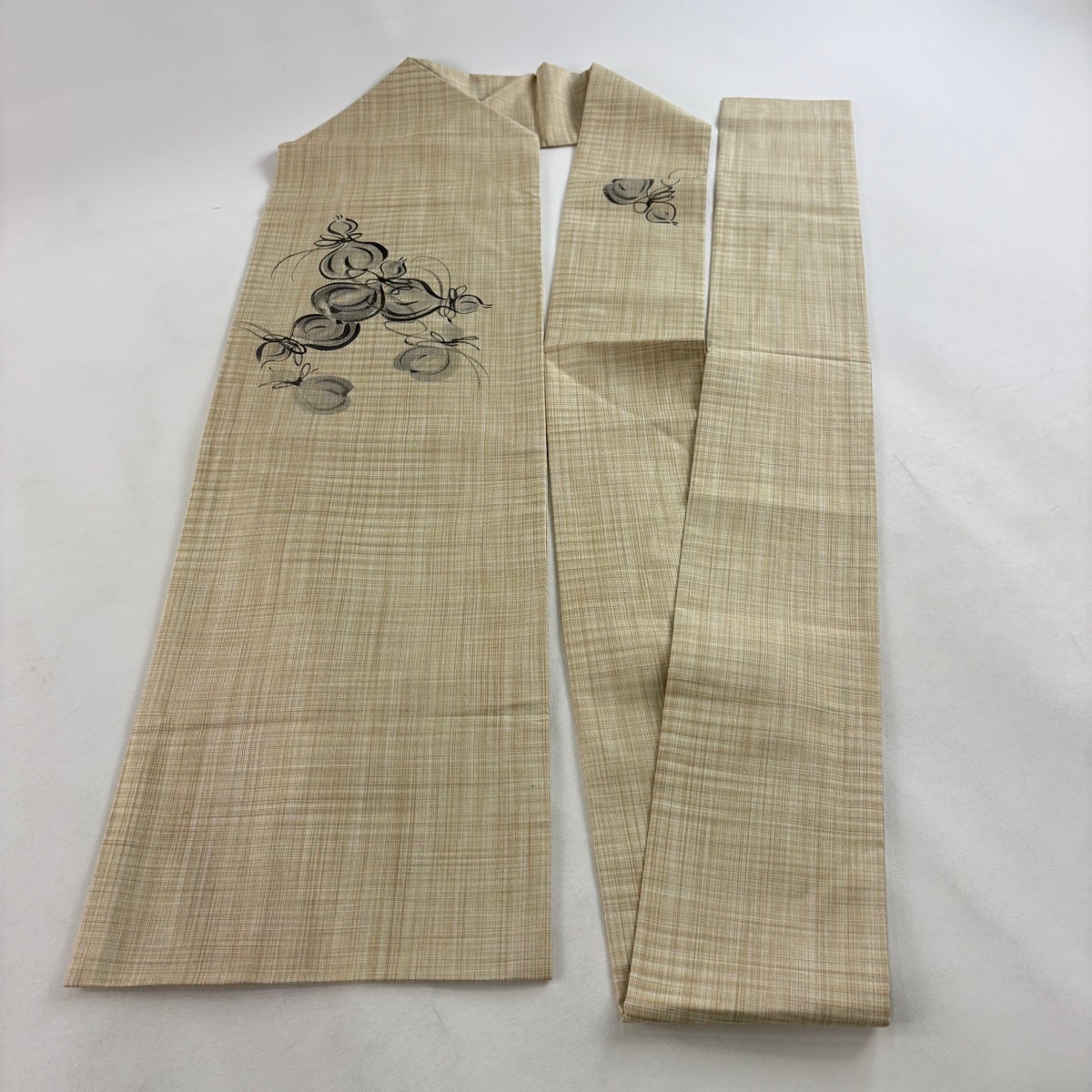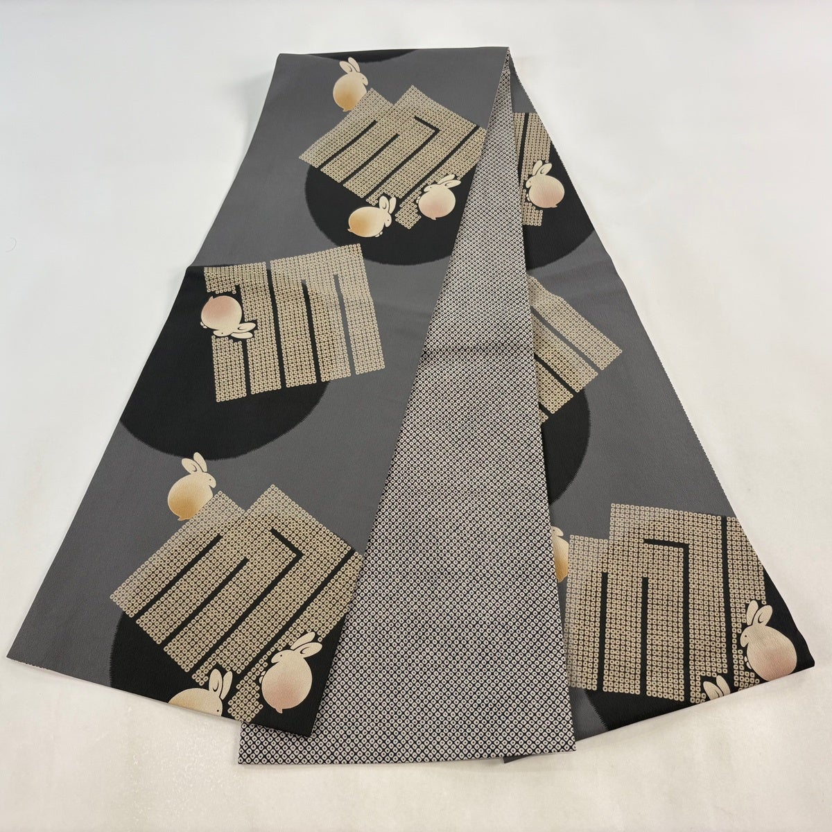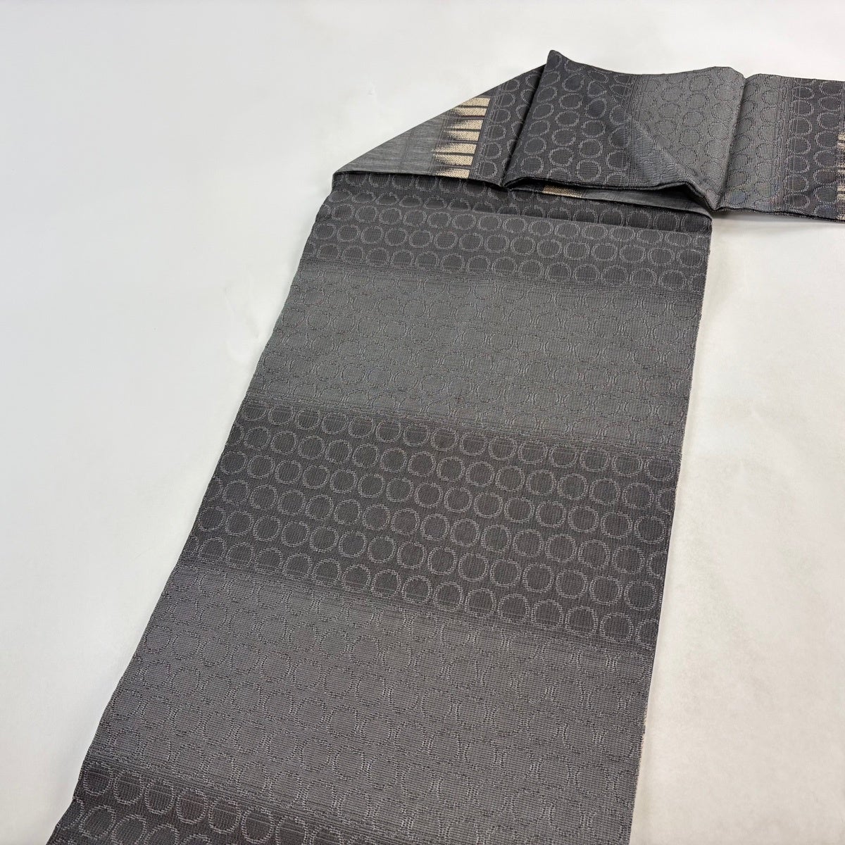 帯の格は着物とは逆で染よりも織のほうが格式が高く、名古屋帯は袋帯よりも格が低く様々な技法や生地で作成されているため組み合わせ数も多く場面によって使い分けることでセミフォーマルからカジュアルまで幅広く着用する事ができる帯です。 名古屋帯の名前の由来は名古屋の女学校の先生が考案したと言われるため名古屋帯という名前で呼ばれるようになりました。 形状はお太鼓部分までは通常の帯幅ですがそれ以降は幅が半分になっていることが多く、袋帯よりも短い作りになっているため一重太鼓でしか結ぶ事ができません。