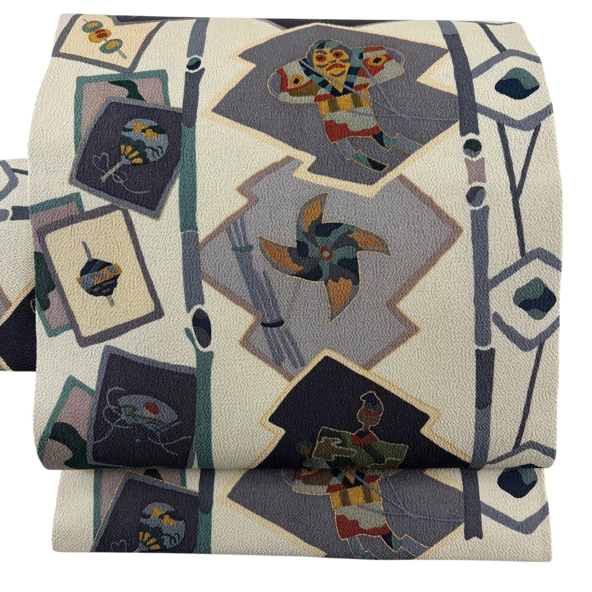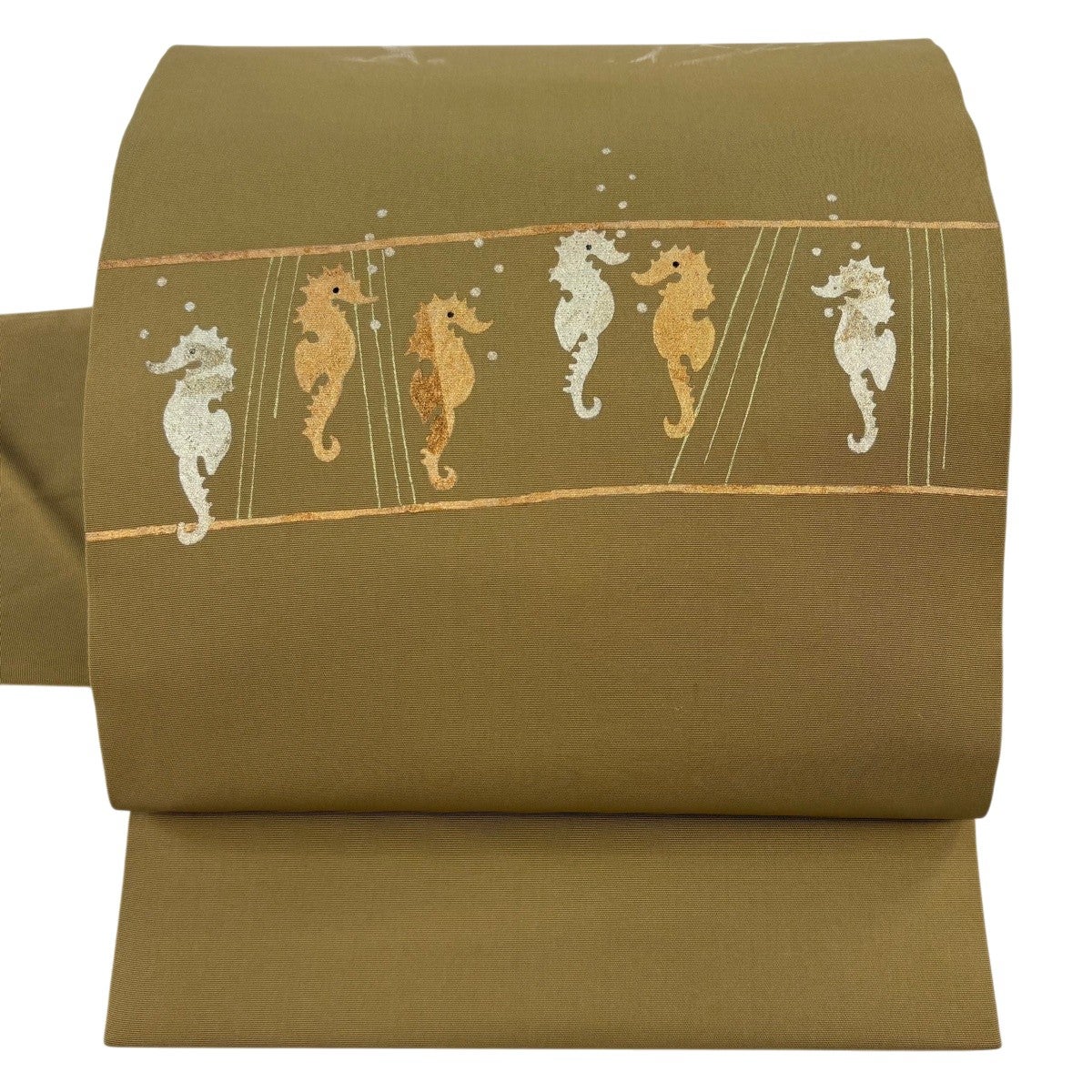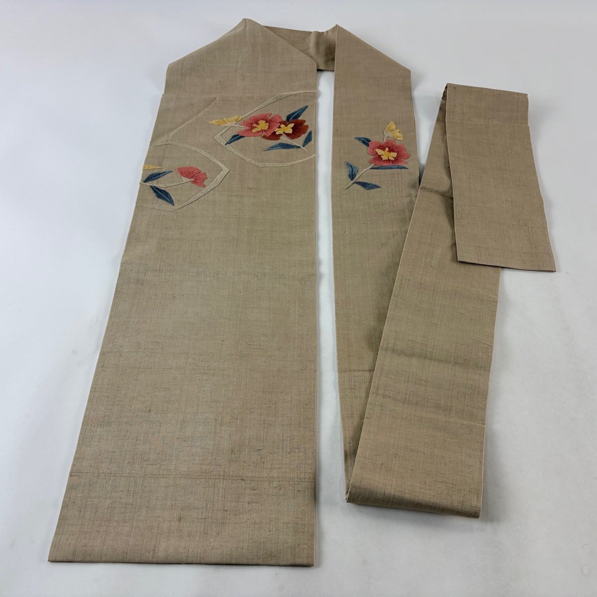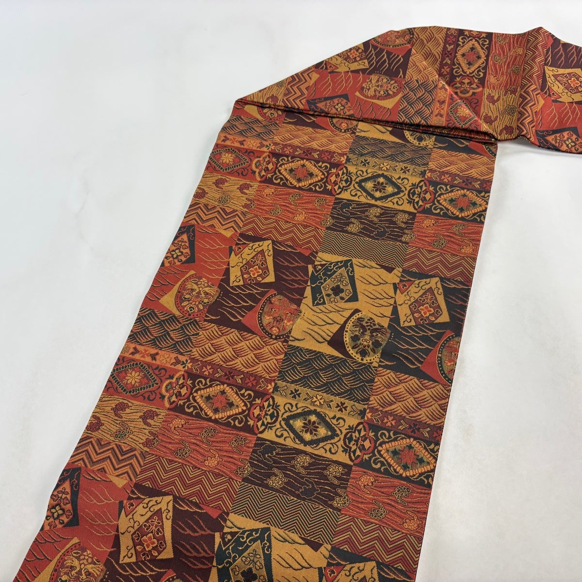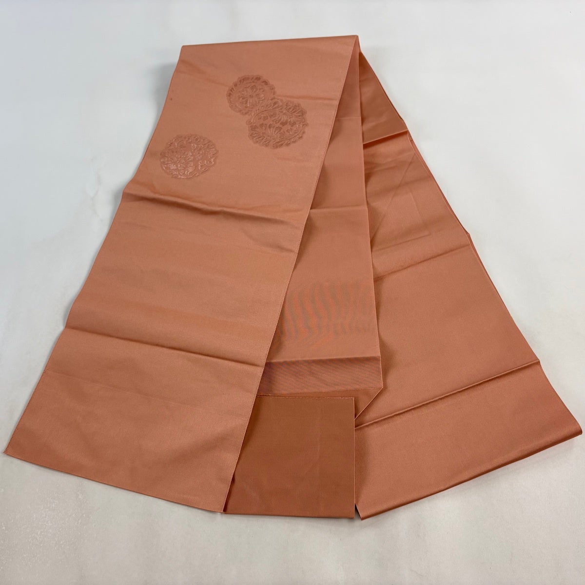 帯の格は着物とは逆で染よりも織のほうが格式が高く、名古屋帯は袋帯よりも格が低く様々な技法や生地で作成されているため組み合わせ数も多く場面によって使い分けることでセミフォーマルからカジュアルまで幅広く着用する事ができる帯です。 名古屋帯の名前の由来は名古屋の女学校の先生が考案したと言われるため名古屋帯という名前で呼ばれるようになりました。 形状はお太鼓部分までは通常の帯幅ですがそれ以降は幅が半分になっていることが多く、袋帯よりも短い作りになっているため一重太鼓でしか結ぶ事ができません。